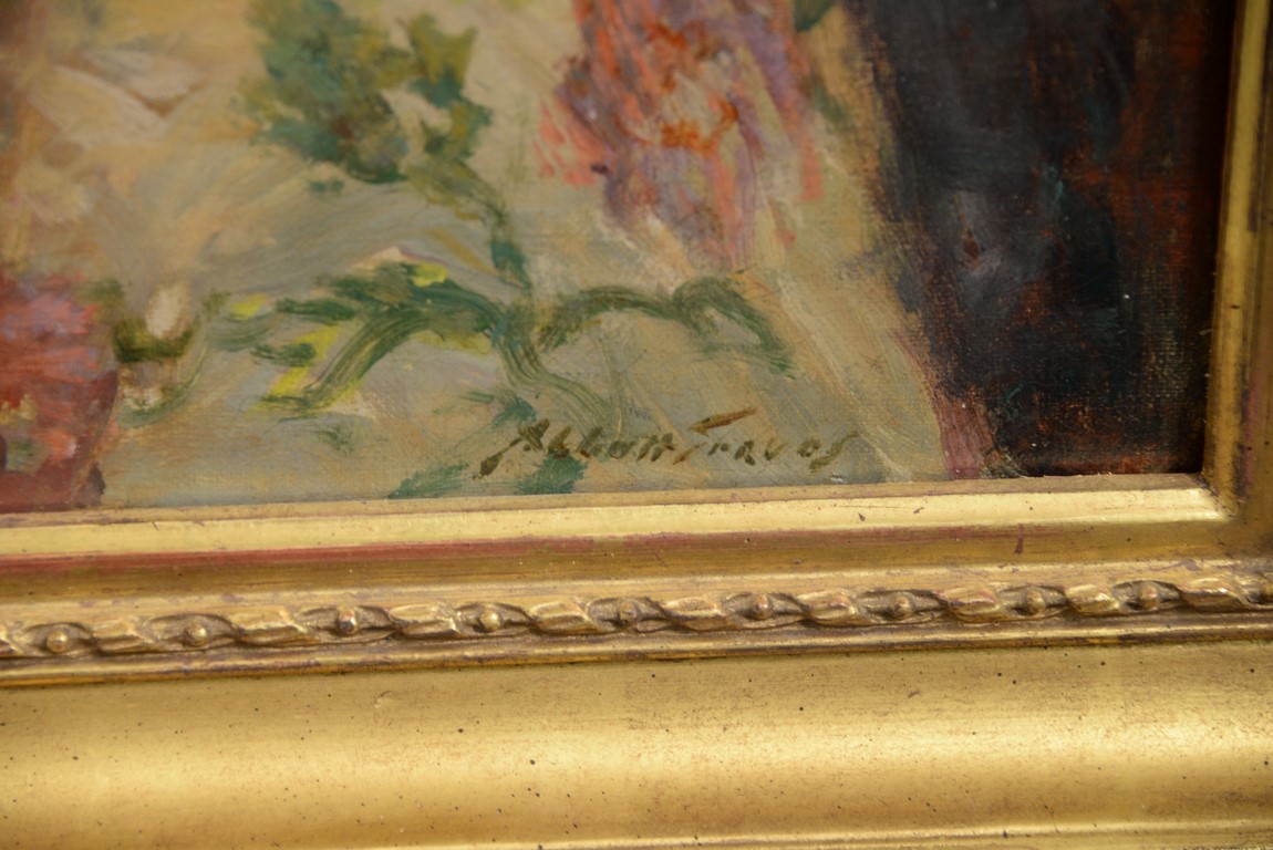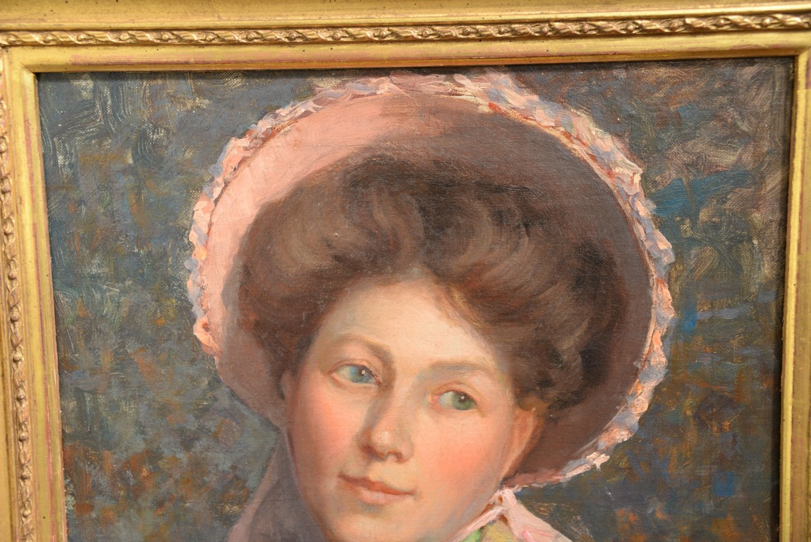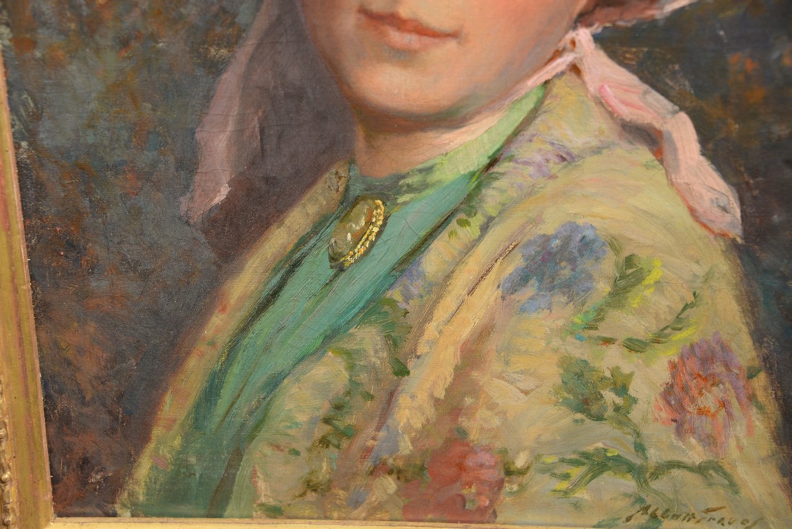 Lot 373: Abbot Fuller Graves 1859-1936 Portrait Bust of a Young Woman having flower print on her coat in pastel colors oil on canv…