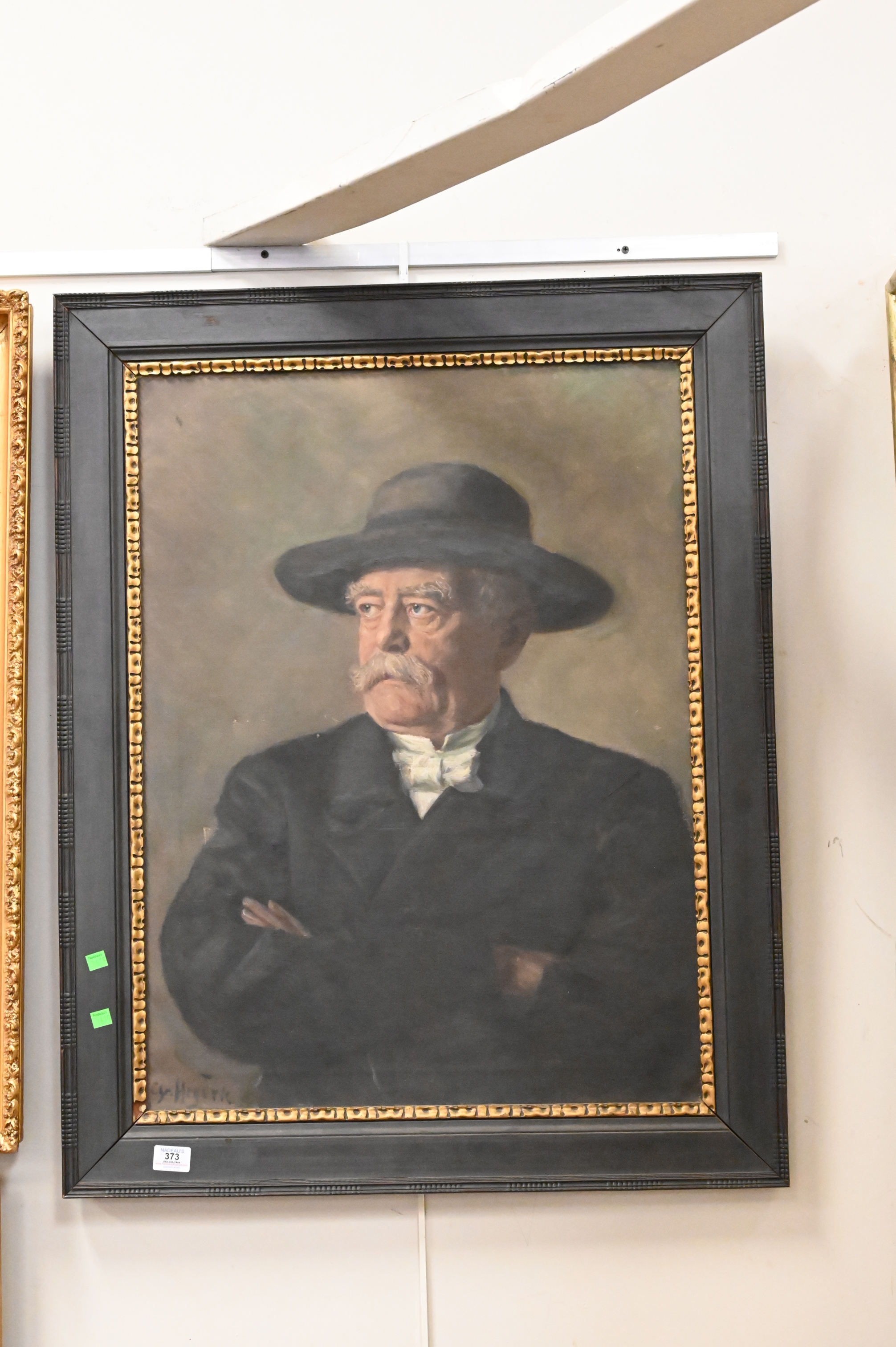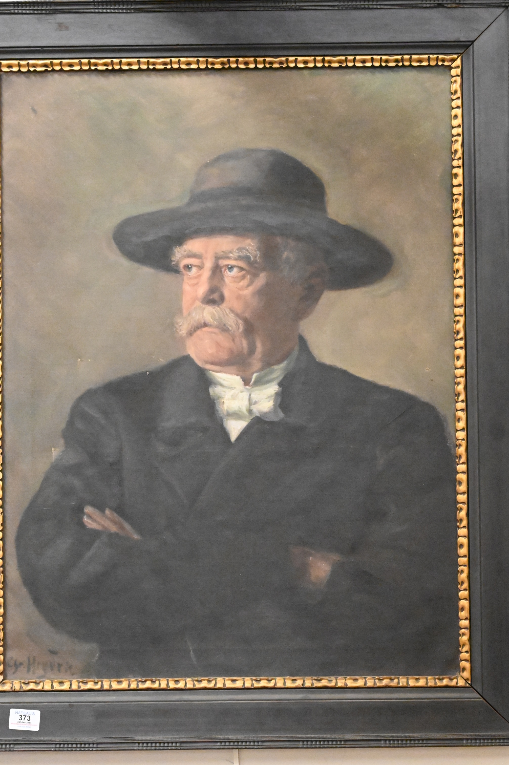 After Franz Von Lenbach (German 1836-1904) “Portrait of Otto Von Bismarck” oil on canvas posed with hat and crossed arms signed lower left illegibly 31″ x 23 1/2″
