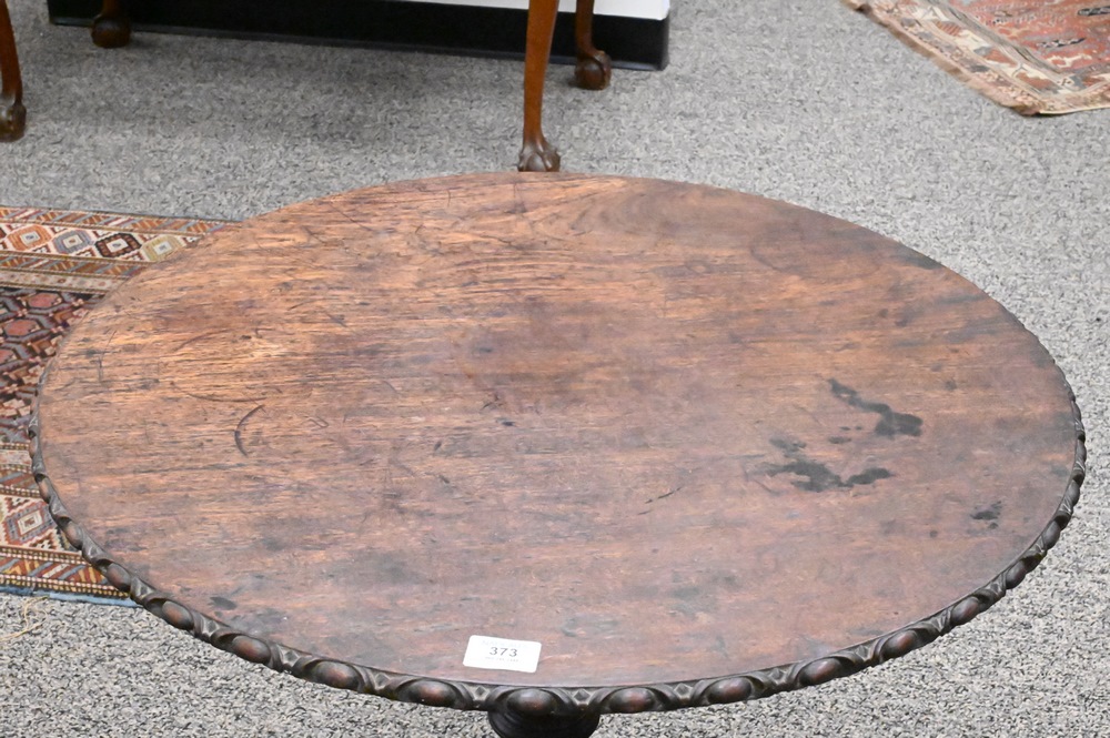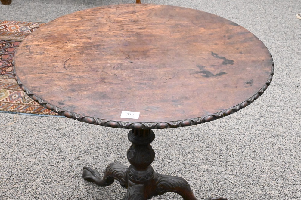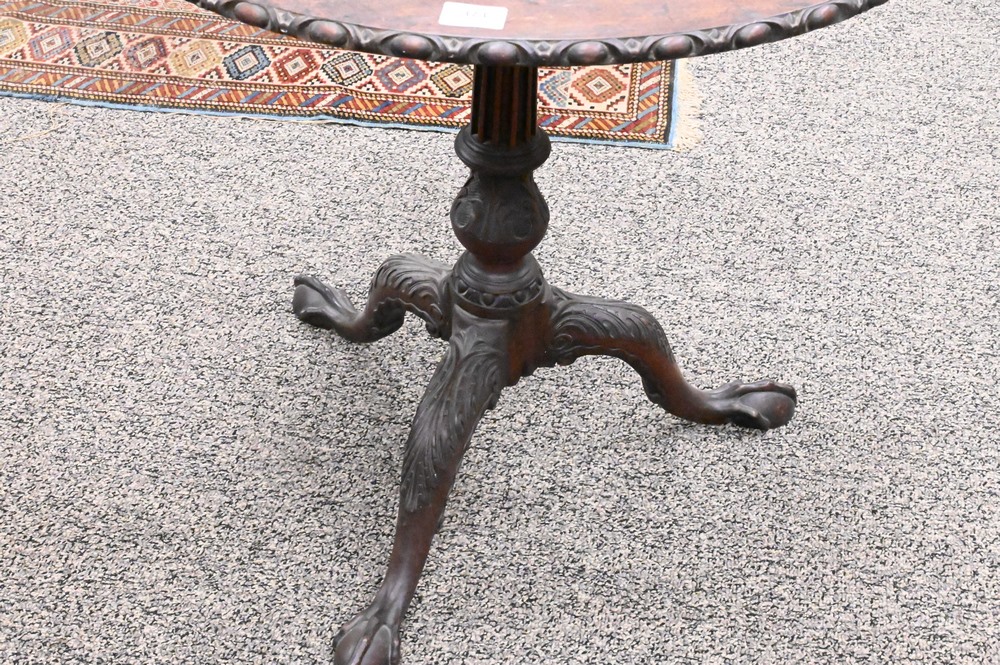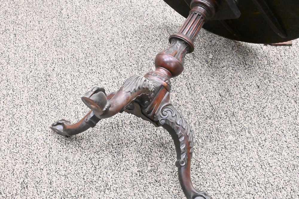 Lot 373: Chippendale Mahogany Tip and Turn Tea Table, having carved edge on fluted and carved pedestal on tripod carved legs, ending in pad feet, height 27 1/2 inches, top 26 1/2″ x 27 1/4″. Provenance: Estate of Wallace Bradway, New Haven, CT.