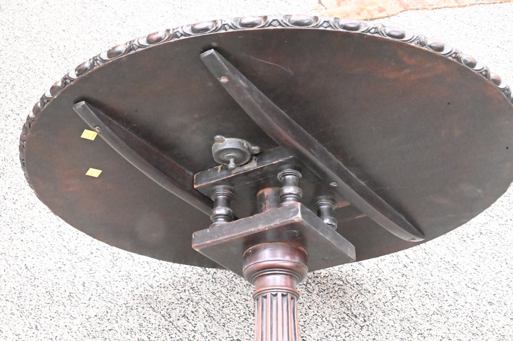 Chippendale Mahogany Tip and Turn Tea Table, having carved edge on fluted and carved pedestal on tripod carved legs, ending in pad feet, height 27 1/2 inches, top 26 1/2″ x 27 1/4″. Provenance: Estate of Wallace Bradway, New Haven, CT.
