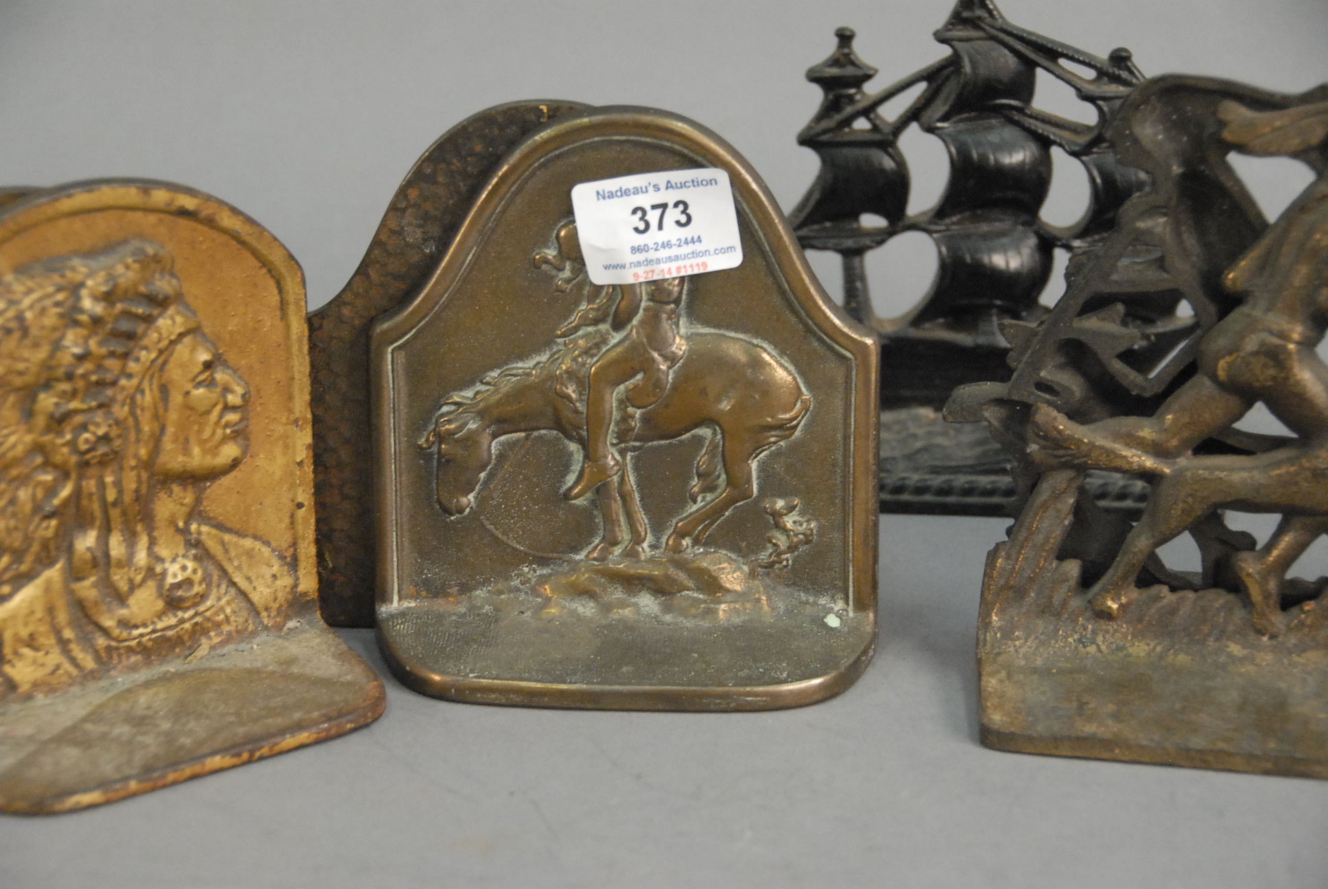 Lot 373: Five pairs of Indian book ends, Bronze and iron along with an iron ship.ht. 6 in. to 7 in.