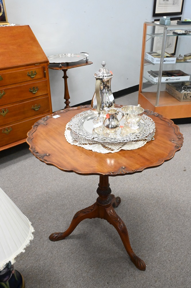 Lot 373: Margolis Mahogany Piecrust Table, on pedestal base, (slight sun fading), height 27 1/2 inches, diameter 28 inches.