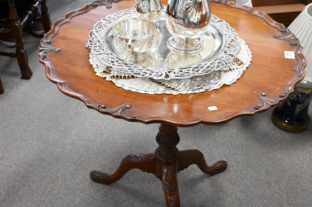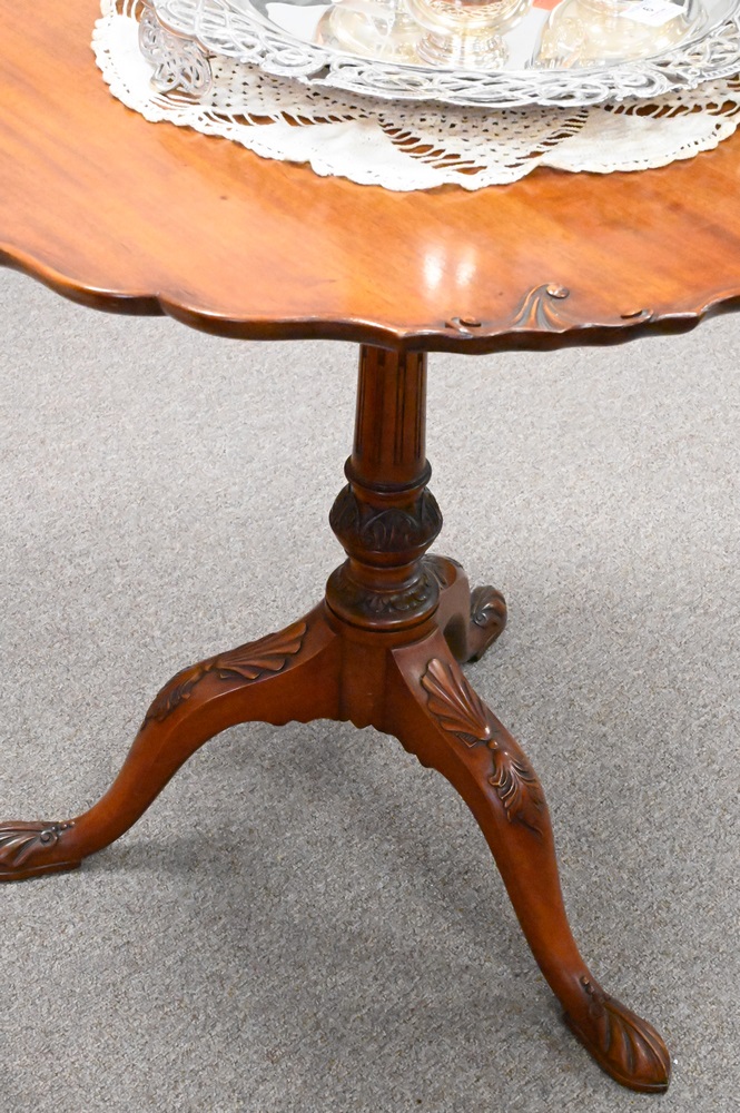 Margolis Mahogany Piecrust Table, on pedestal base, (slight sun fading), height 27 1/2 inches, diameter 28 inches.