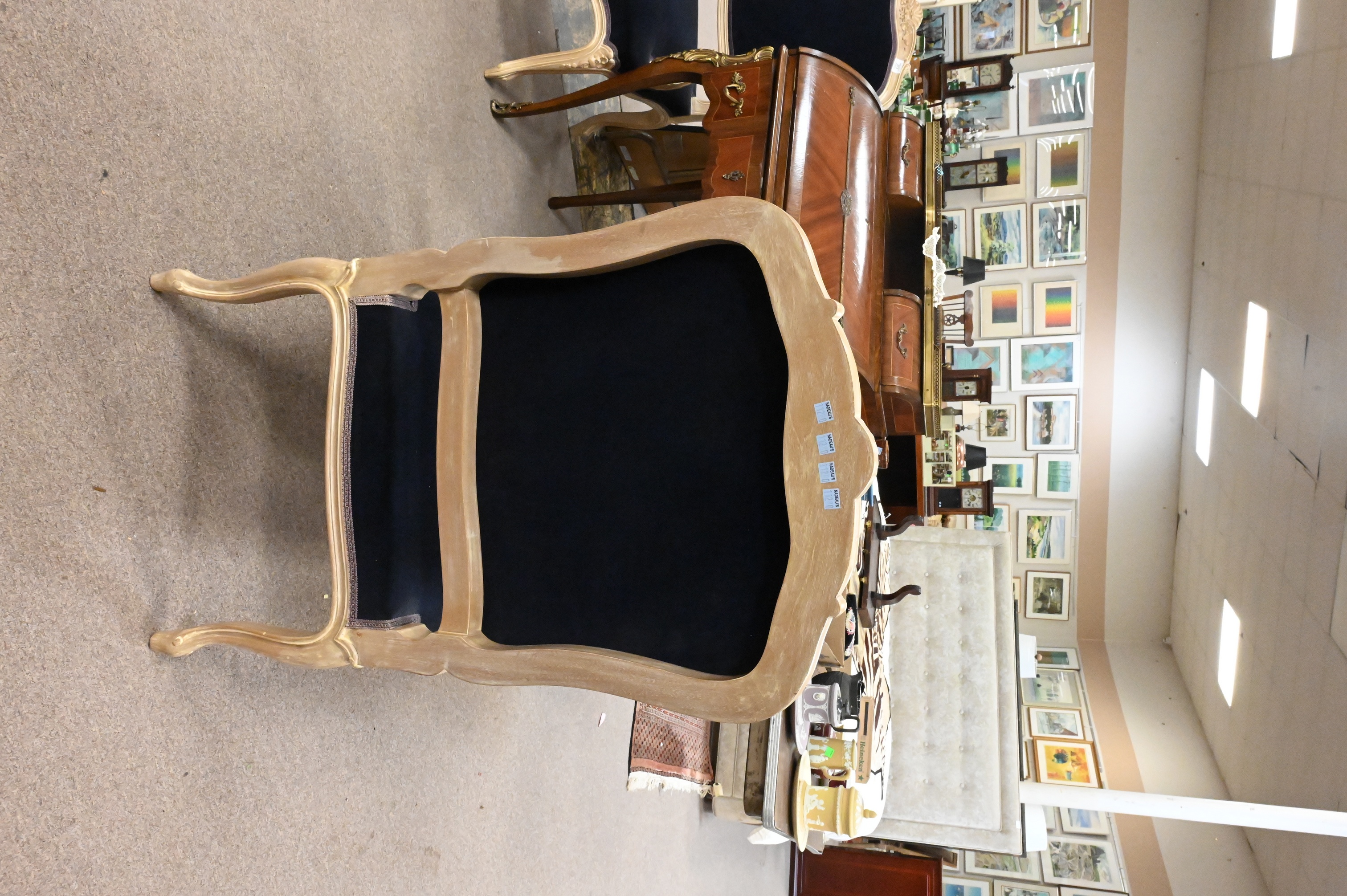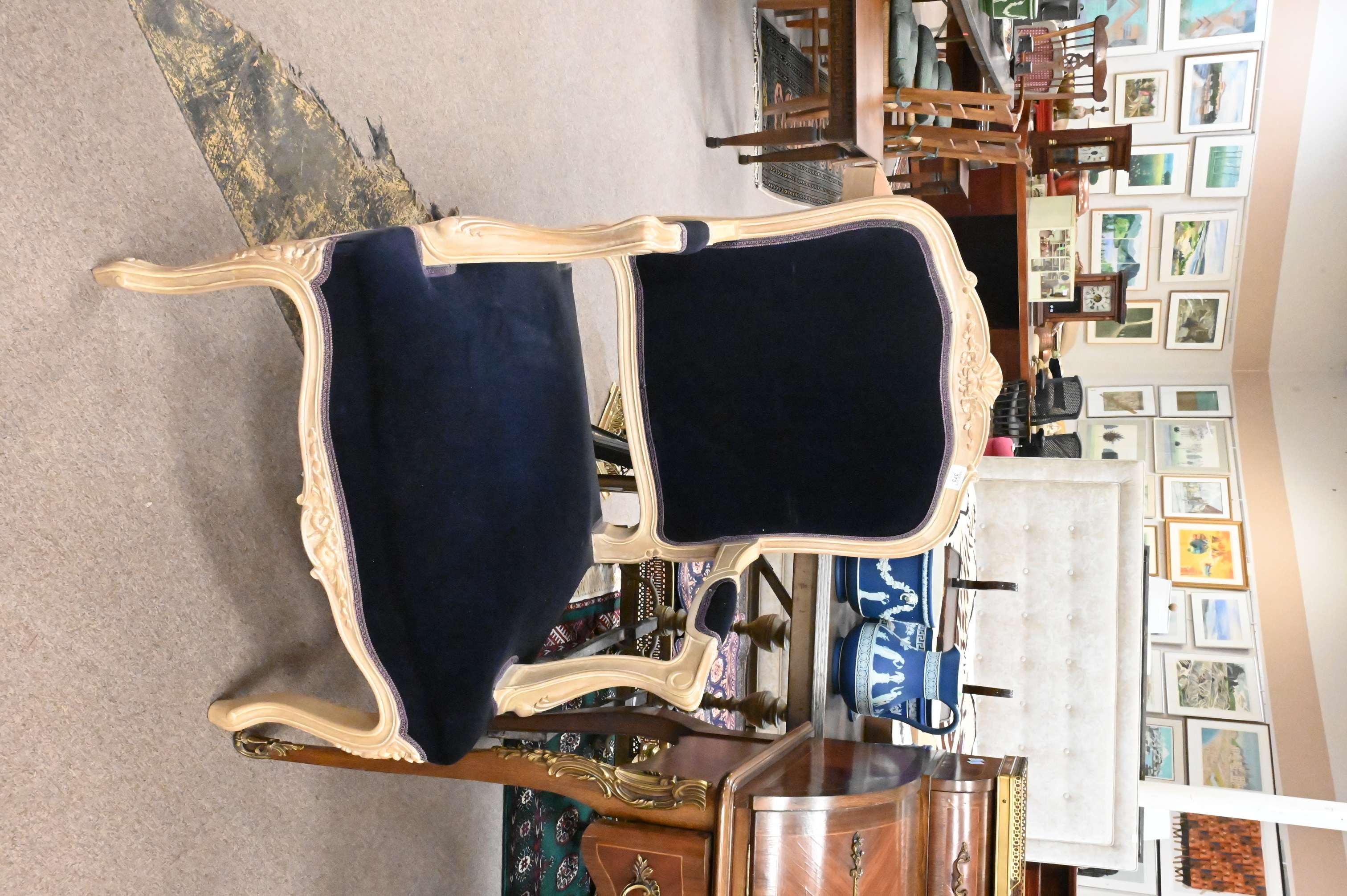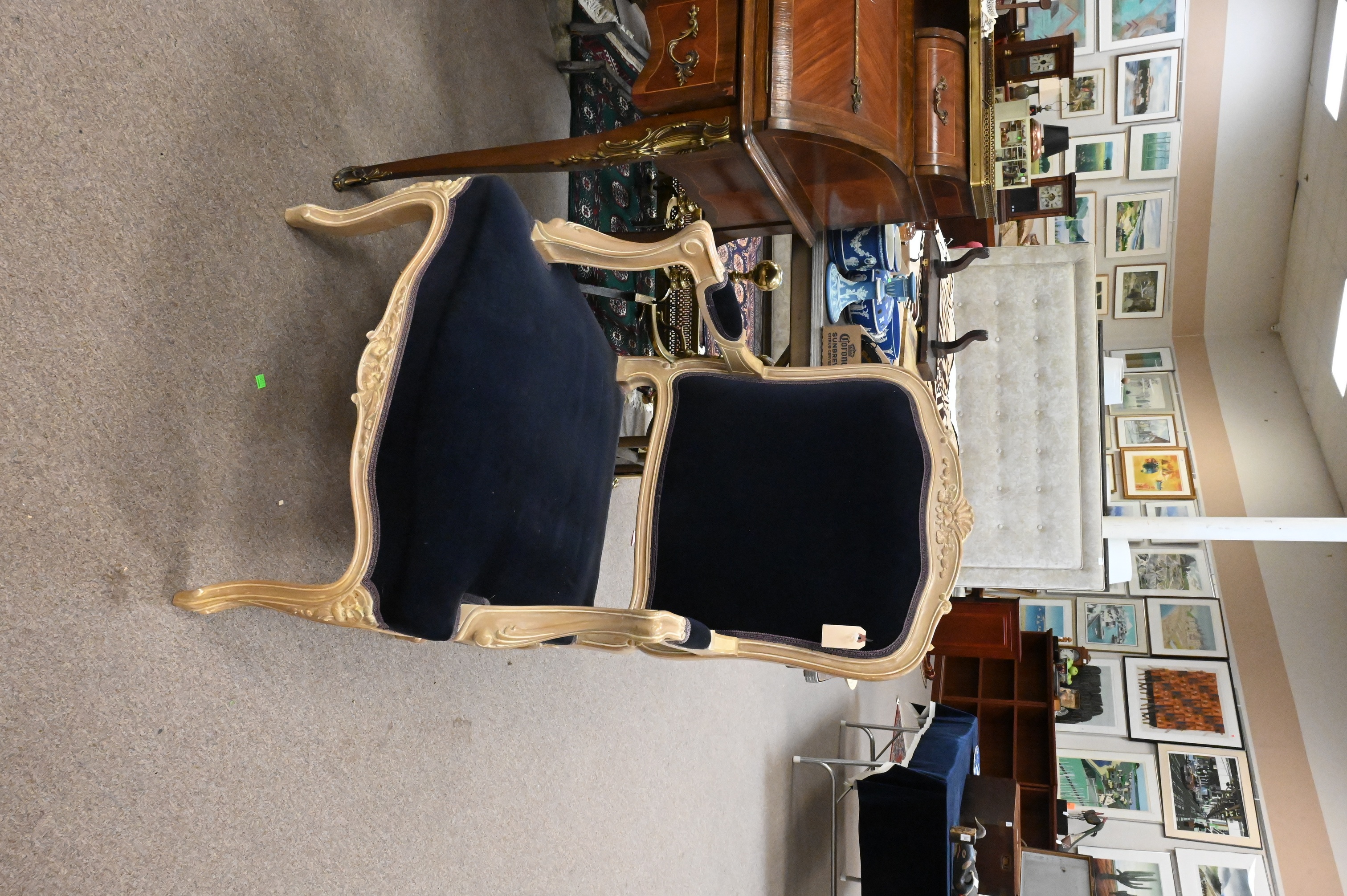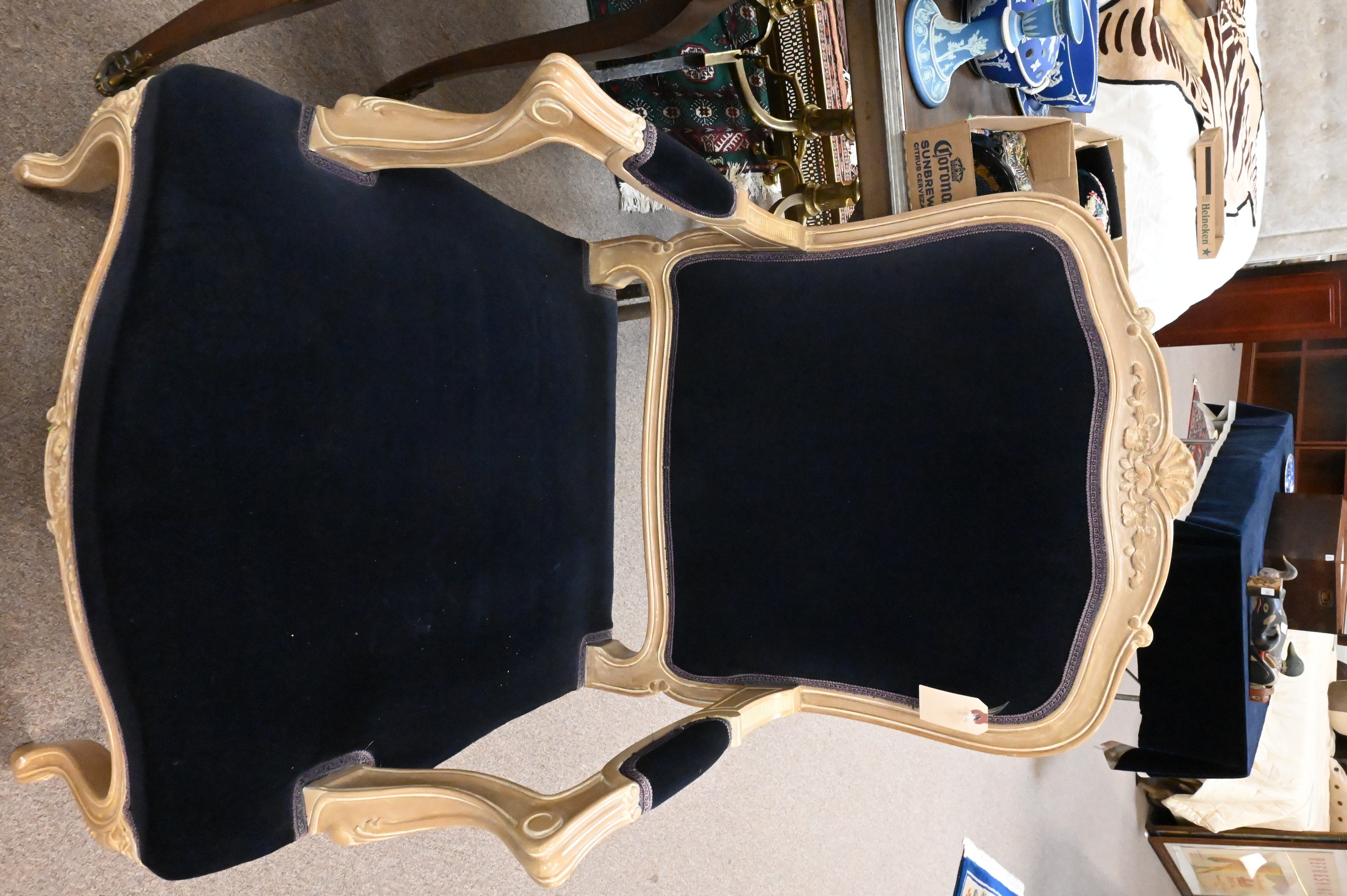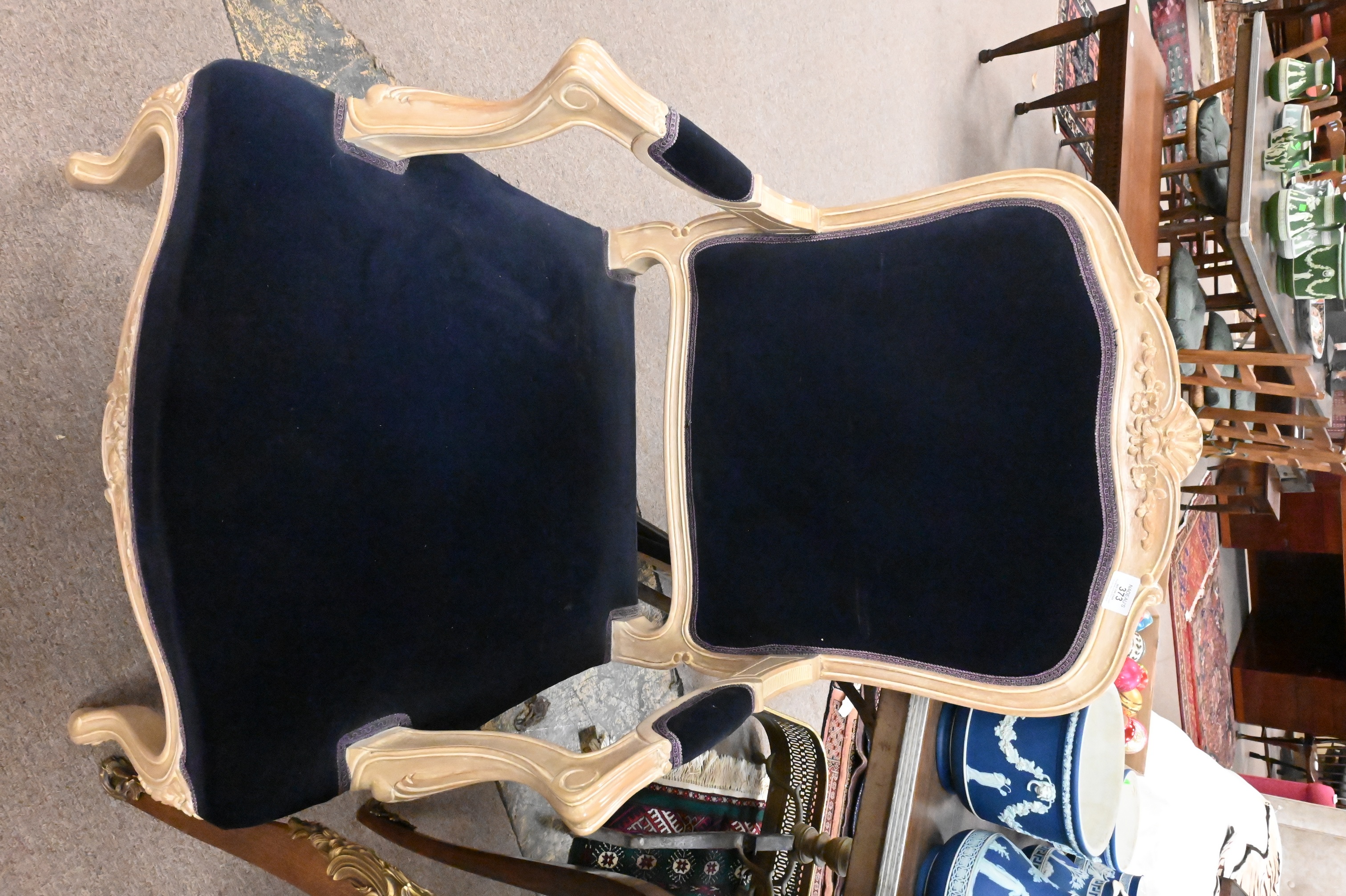 having shaped crest floral carving, seat upholstered in dark blue velvet, scrolling open arms and carved supports, raised on cabriole legs