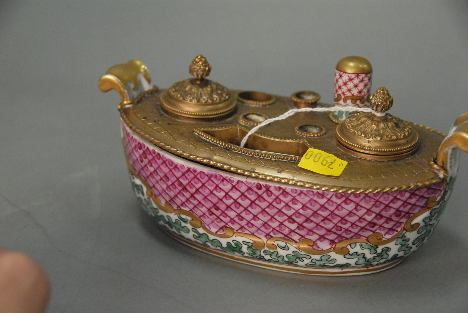Porcelain and brass ink stand. ht. 3 1/2 in. lg. 7 1/2 in.