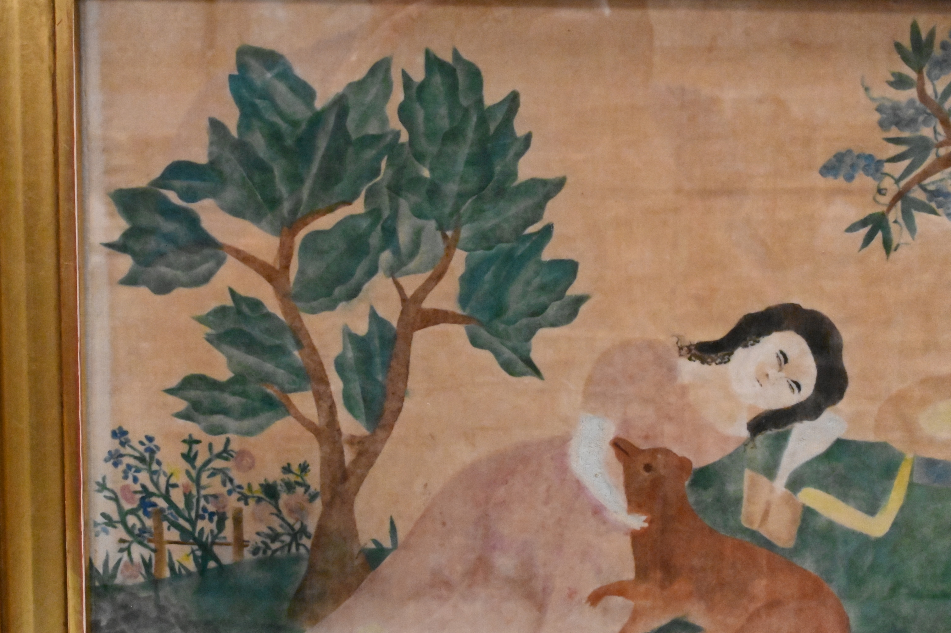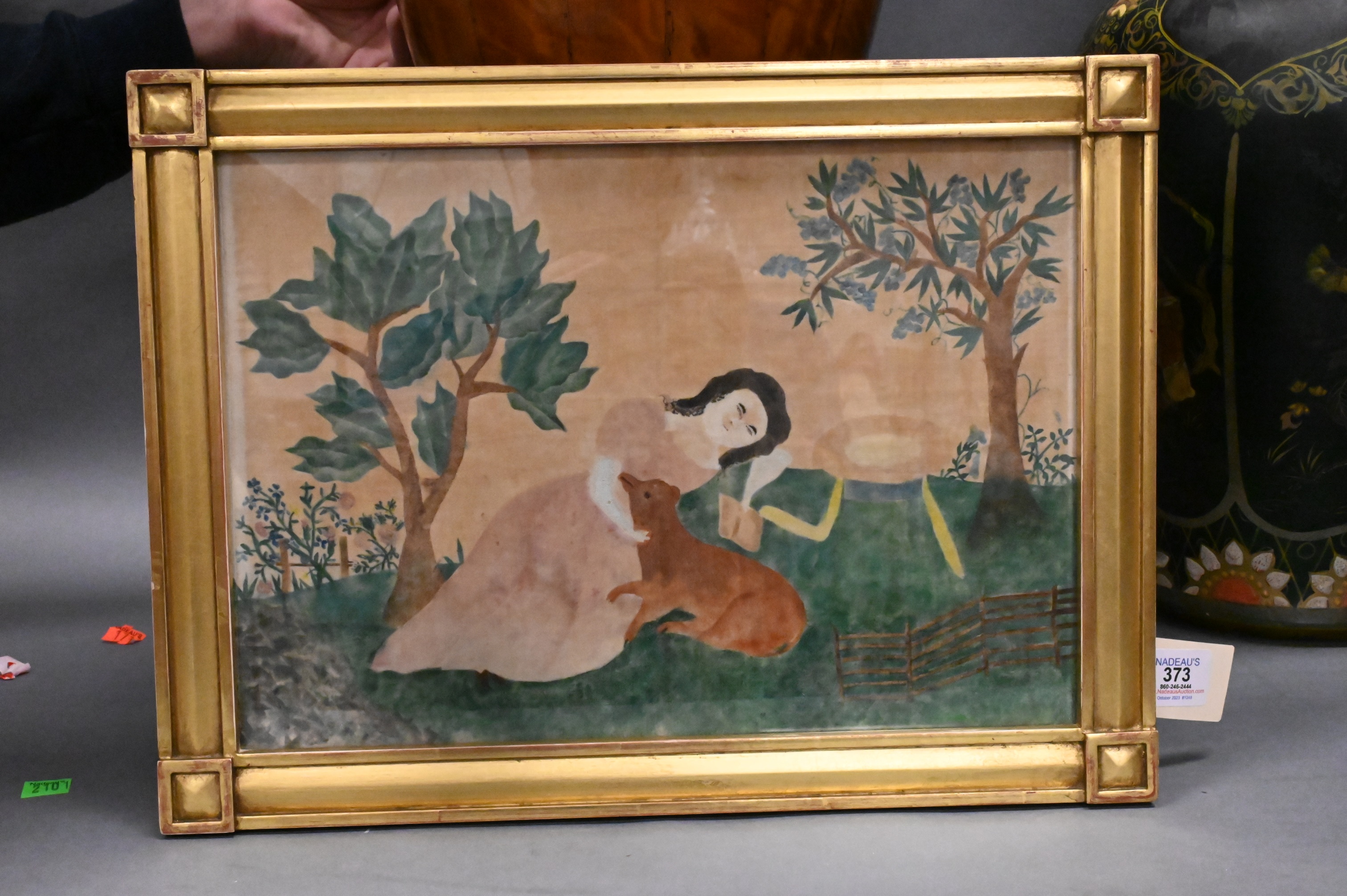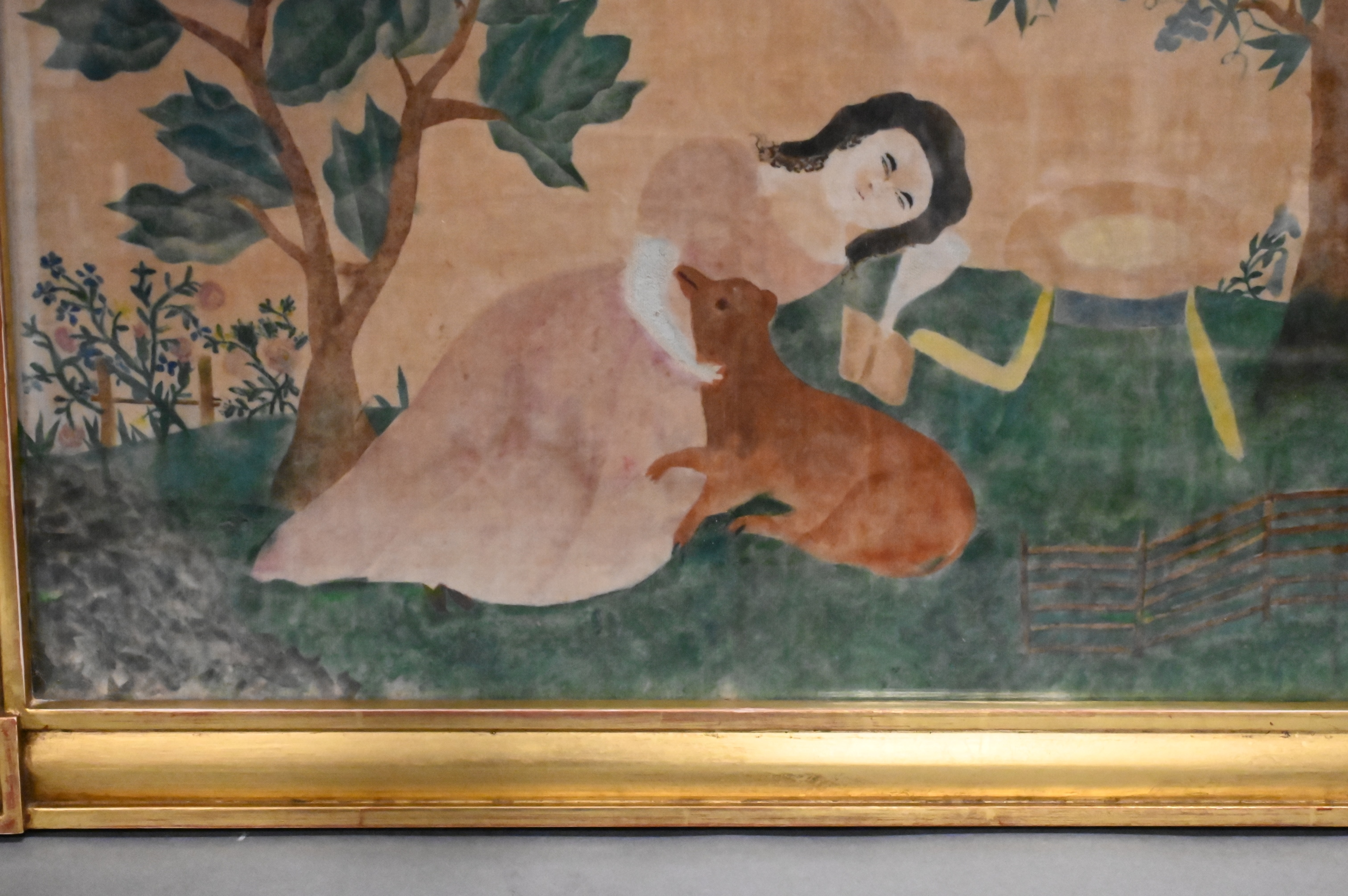 Lot 373: Primitive Folk Art of Girl and Dog in Landscape on Velvet