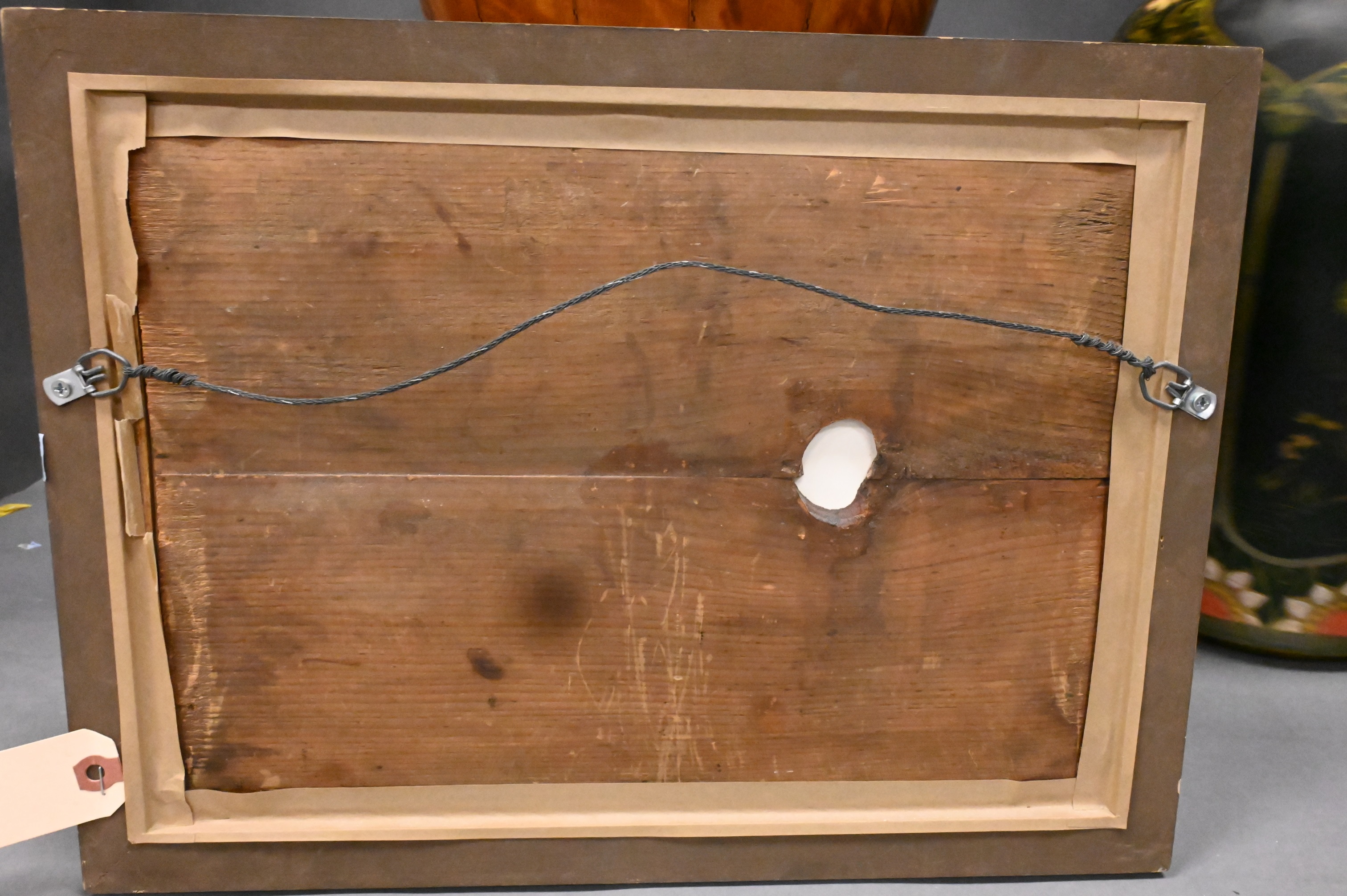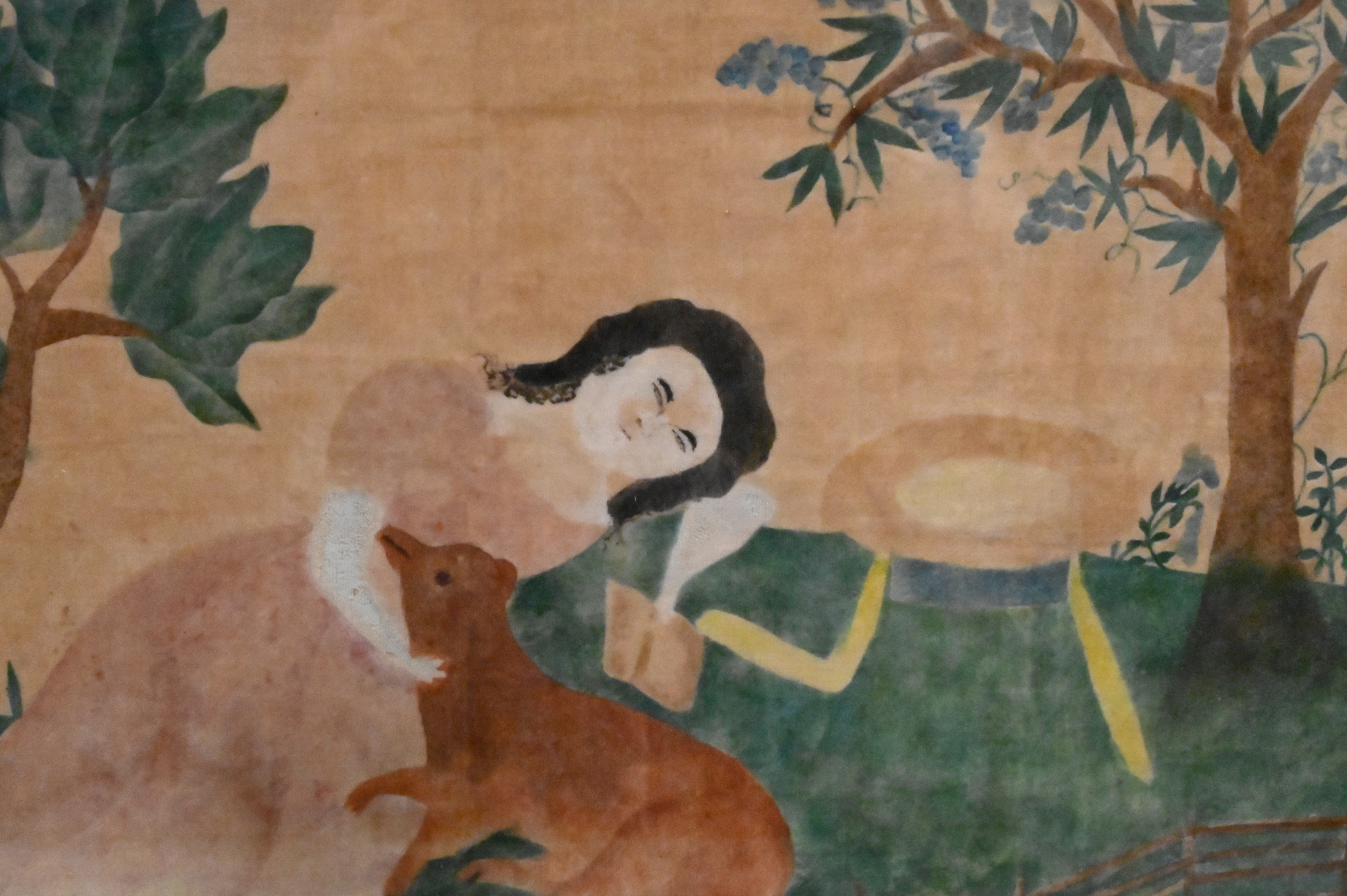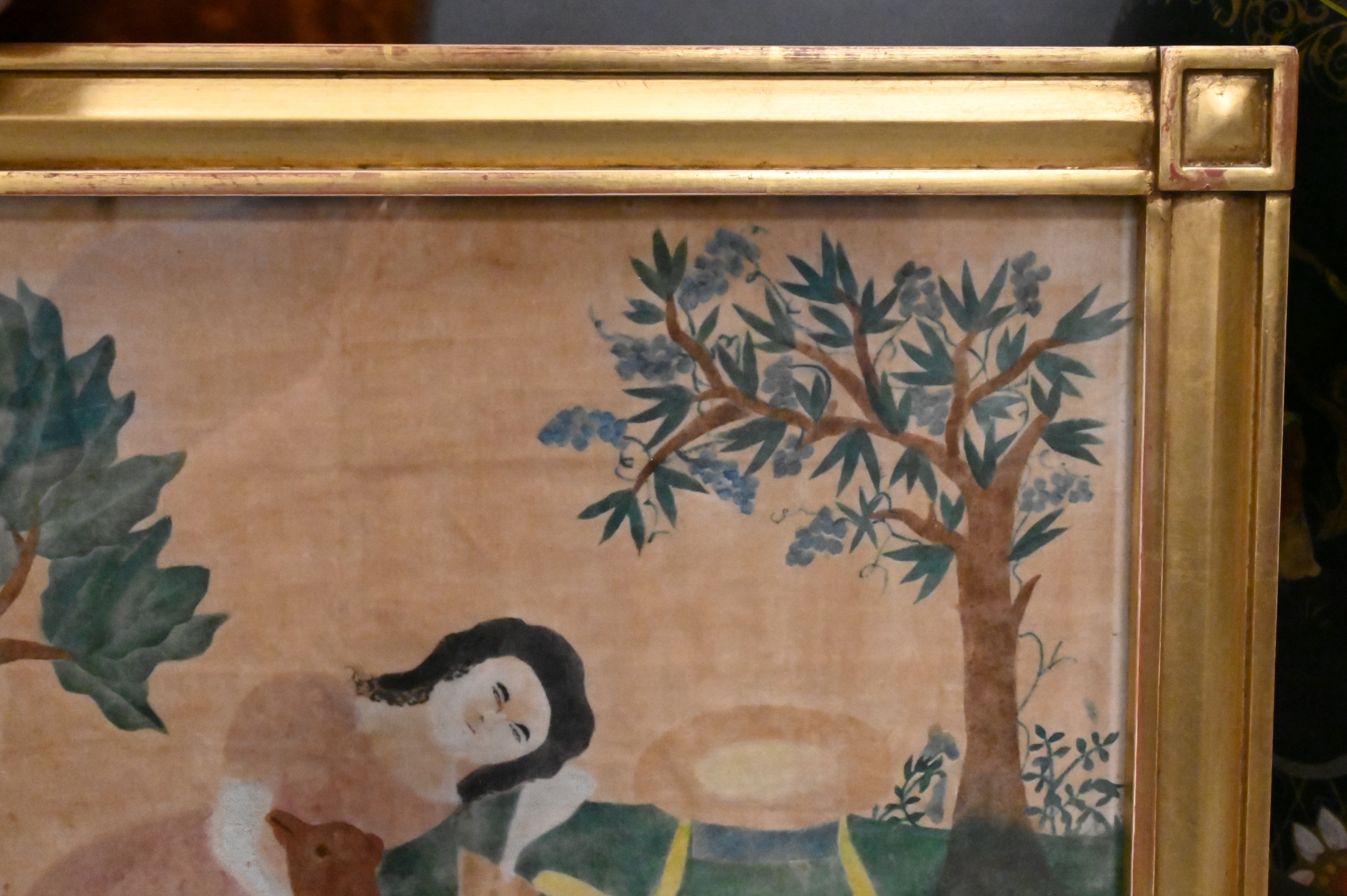 Lot 373: Primitive Folk Art of Girl and Dog in Landscape on Velvet