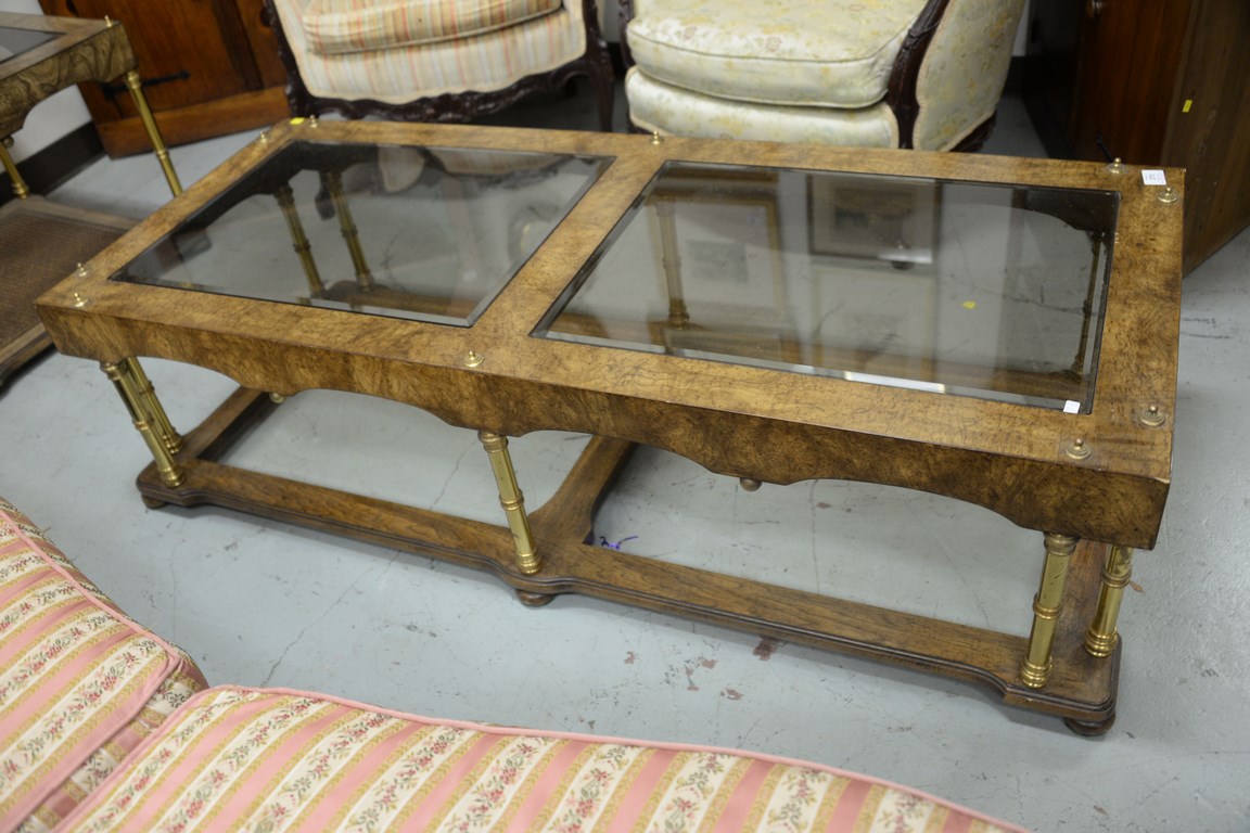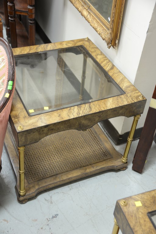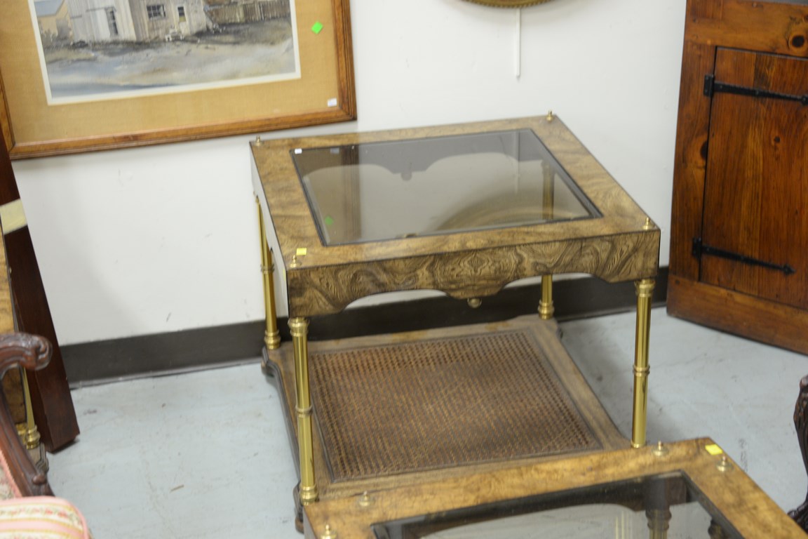 Set of Contemporary glass top tables including coffee table and two end tables.