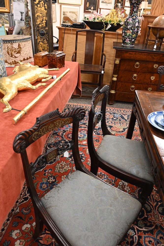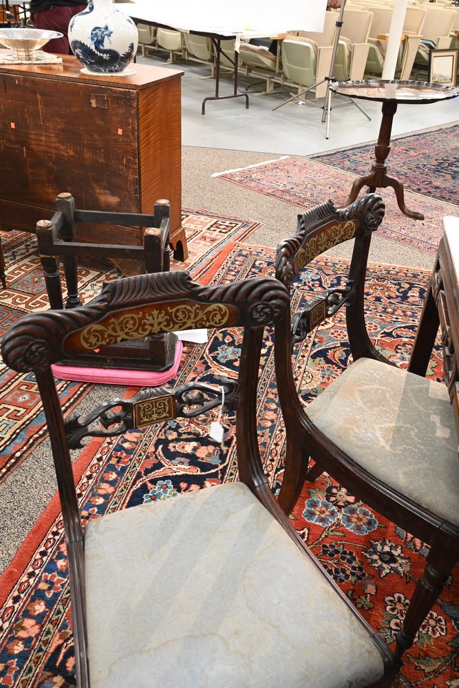 Lot 373: Set of Six Rosewood Classical Side Chairs having inlaid brass decoration and openwork carving all set on reeded and turned legs circa 1830 now with upholstered slip seats replacing caning height 33 1/2 inches