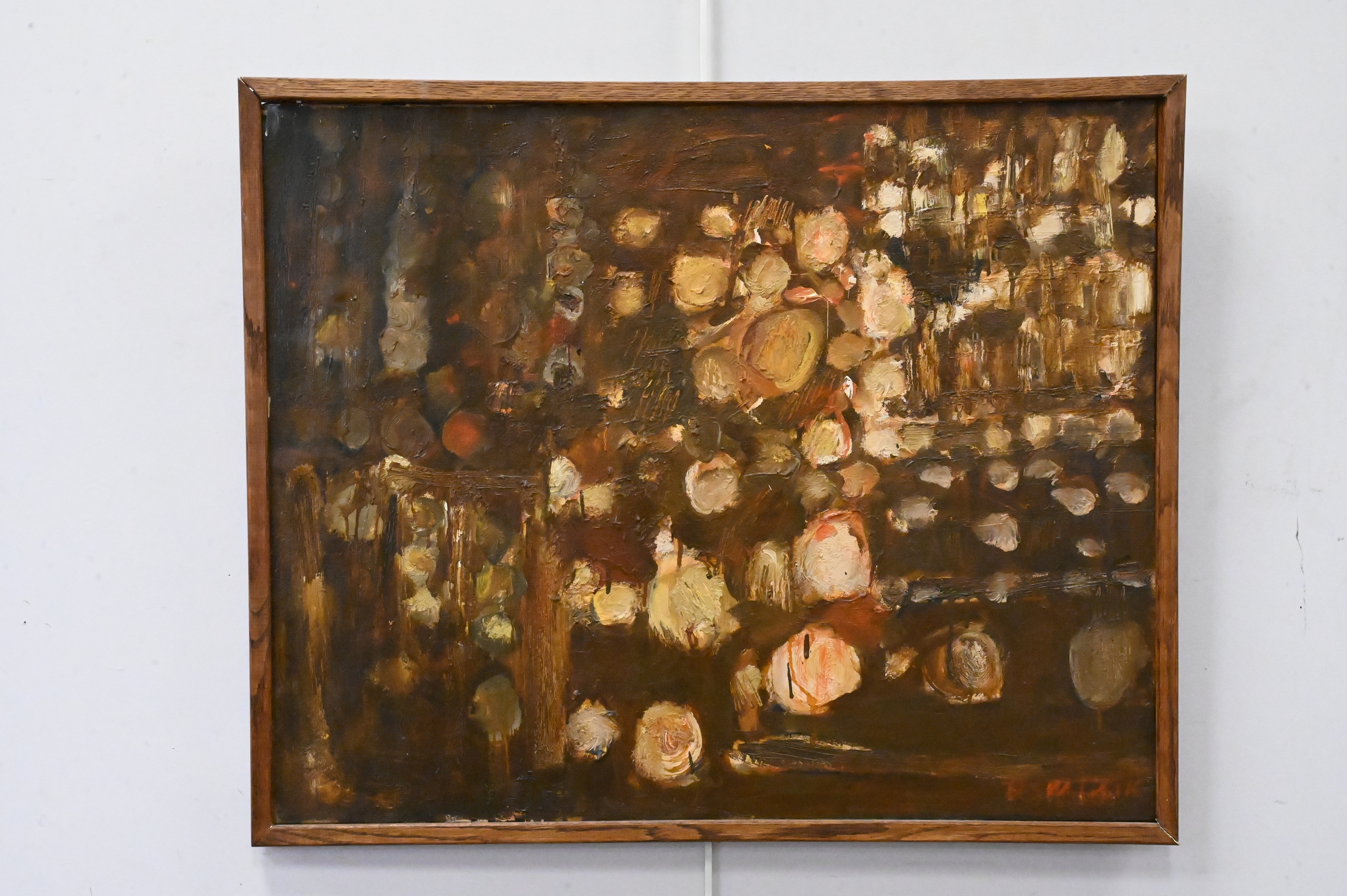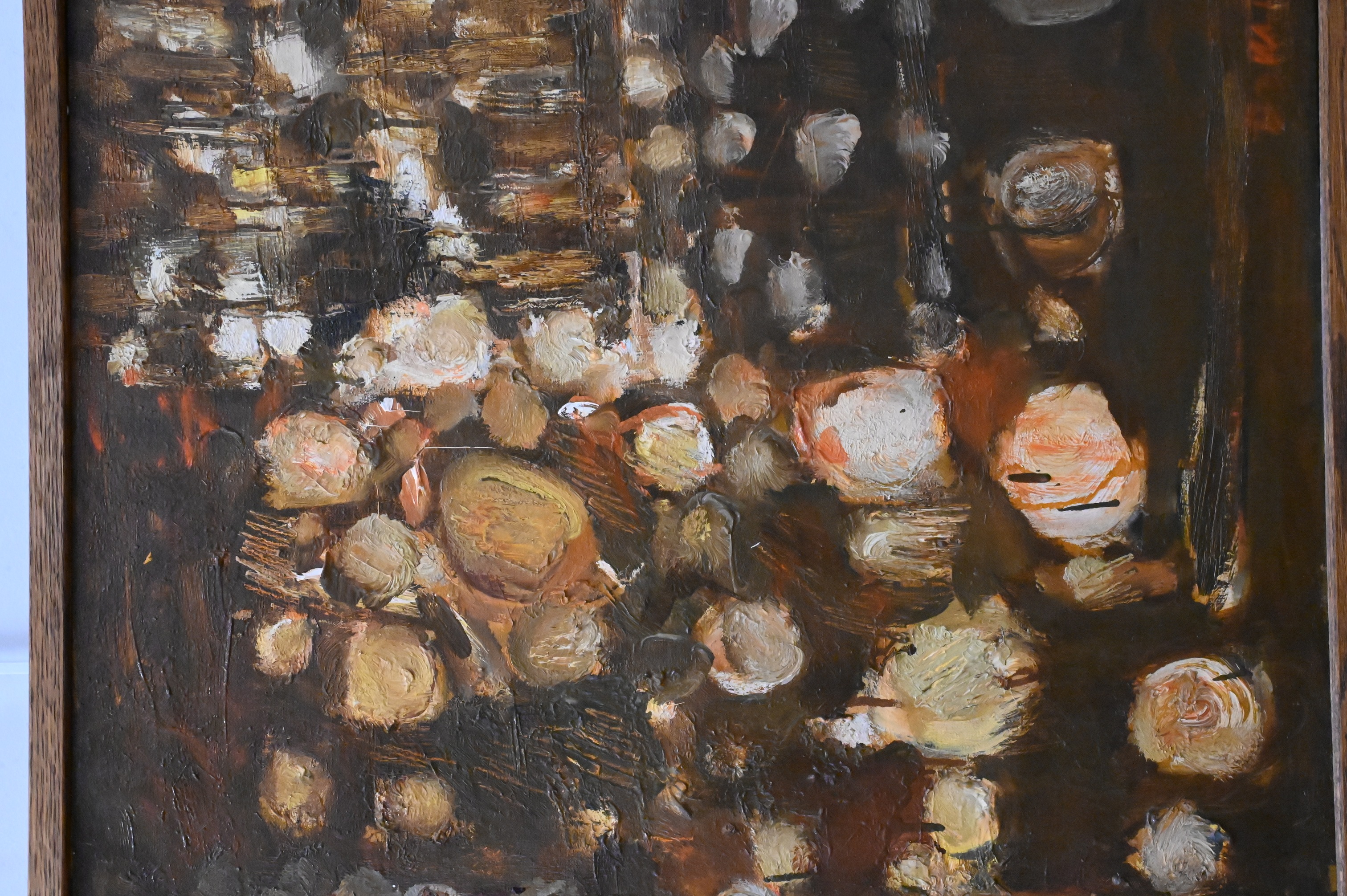 Expressive abstract composition from Dominik’s early period, composed of layered circular and rectilinear forms in warm ochres, golds, browns, and deep earth tones, built up with rich impasto and gestural brushwork. The surface is animated by rhythmic, organic repetitions suggestive of light, movement, and natural patterning—hallmarks of Dominik’s mature vocabulary.