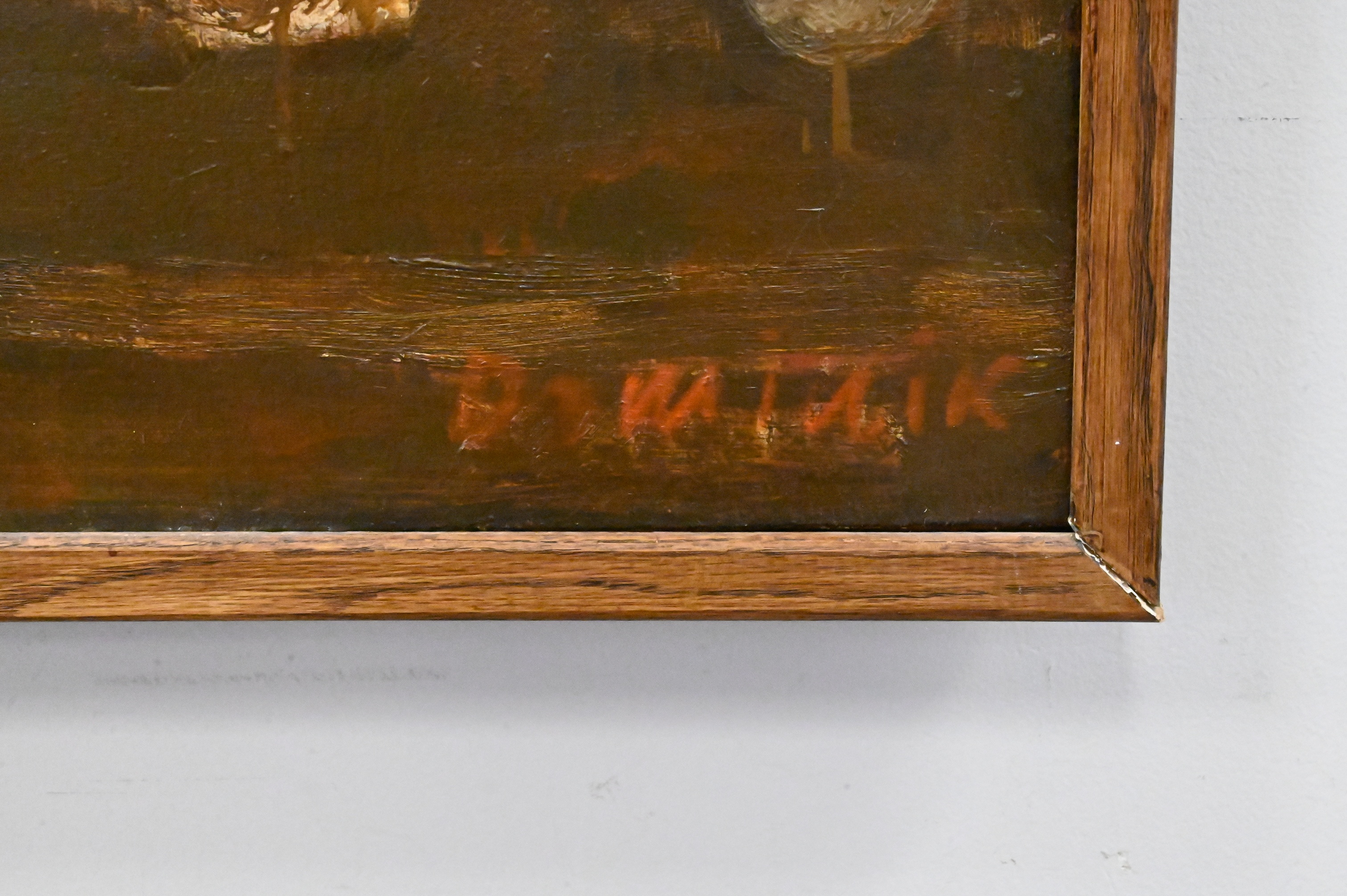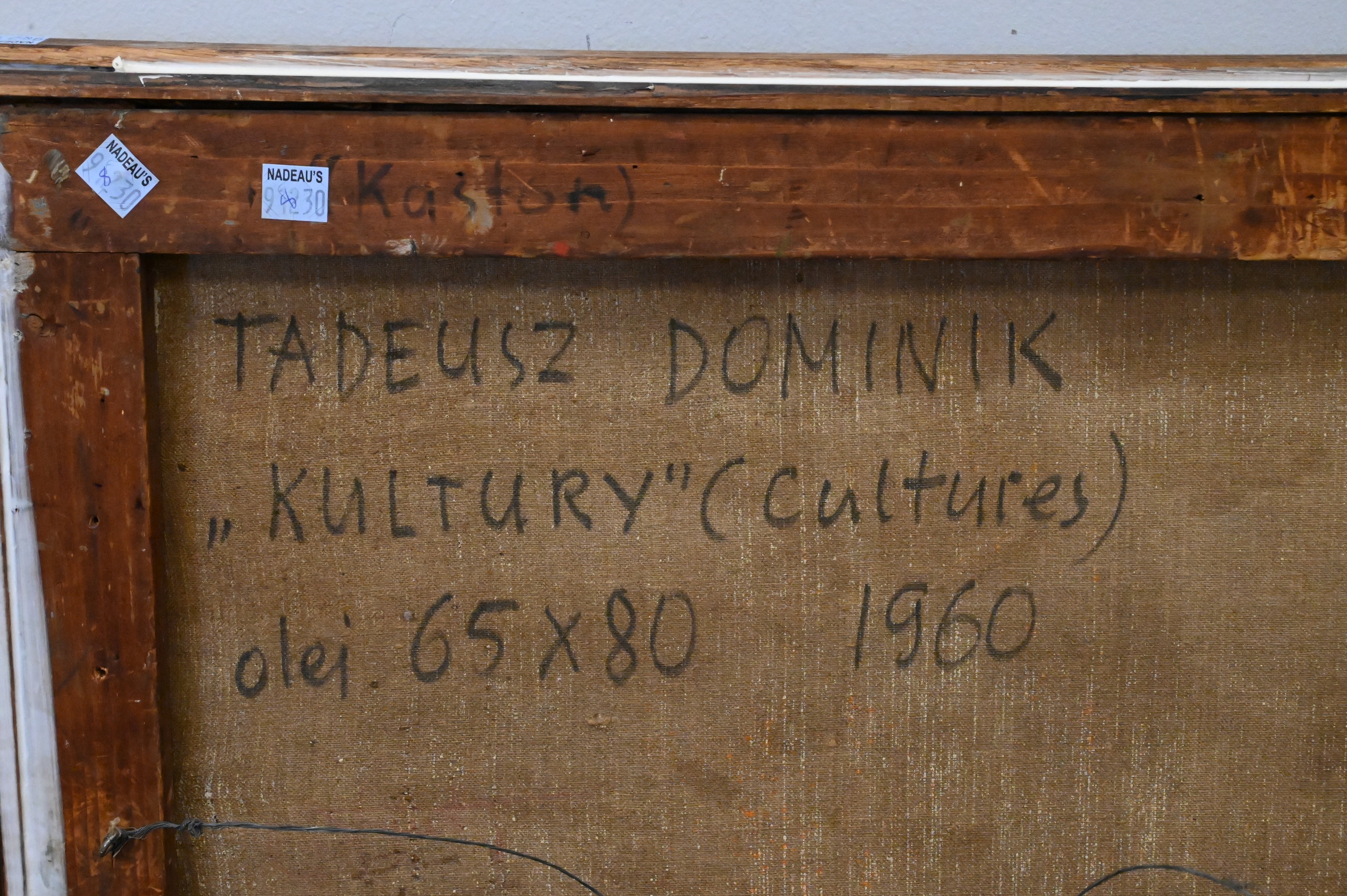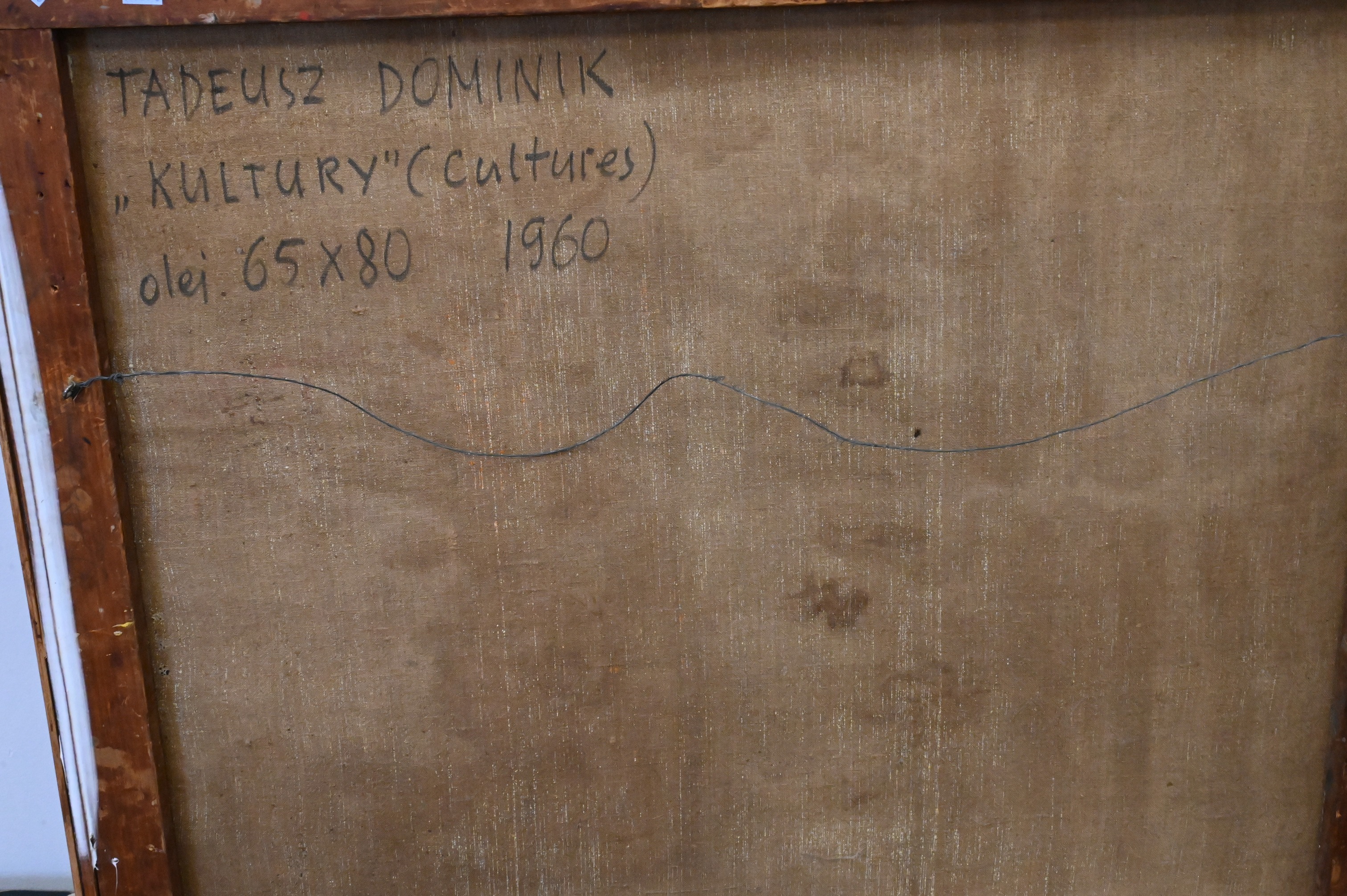 Signed D. Dominik lower right; verso titled, dated, and inscribed “Tadeusz Dominik, ‘KULTURY (Cultures)’, 1960, olej,