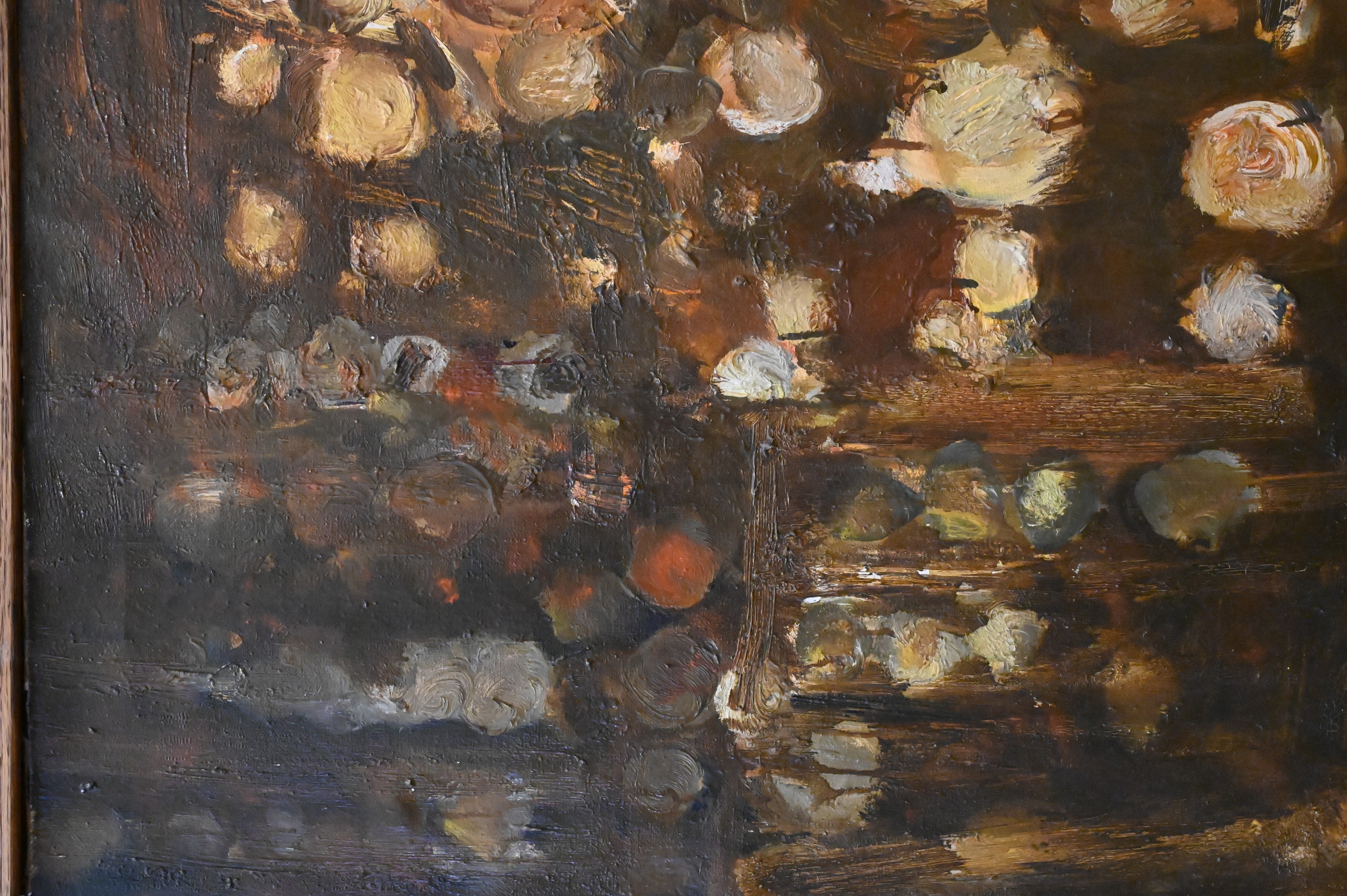 Some surface grime, edgeware, some paint loss to borders. Varnish drips. Splatter to upper left corner. overall fair condition.