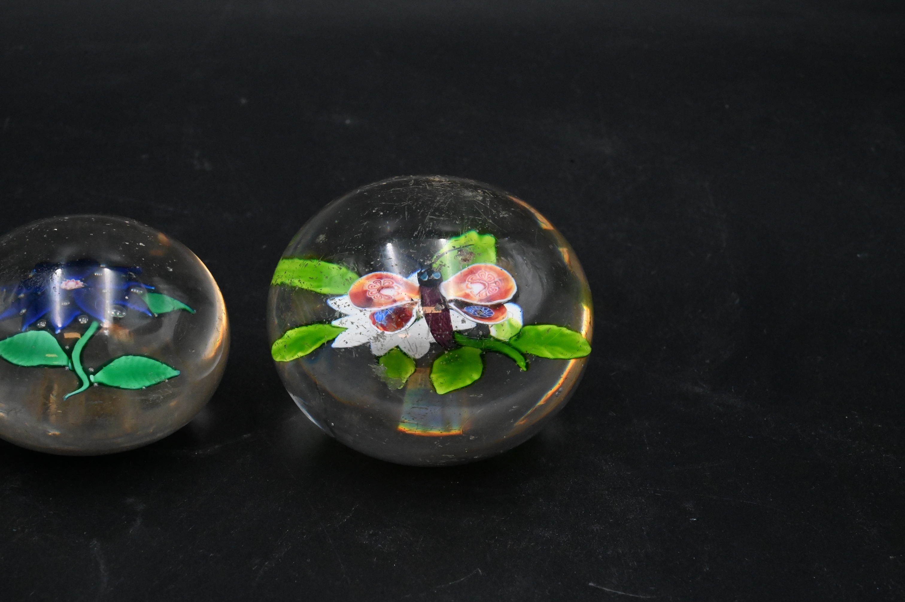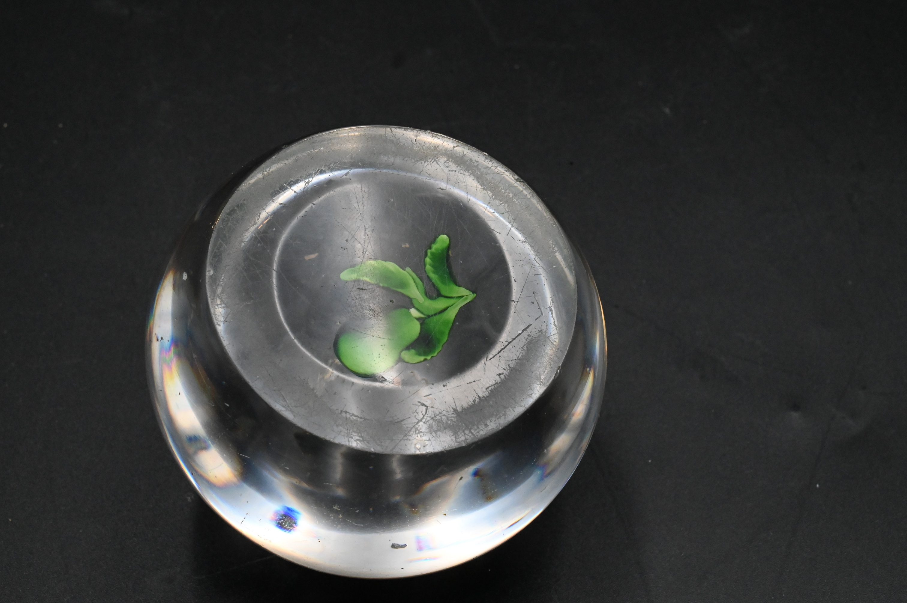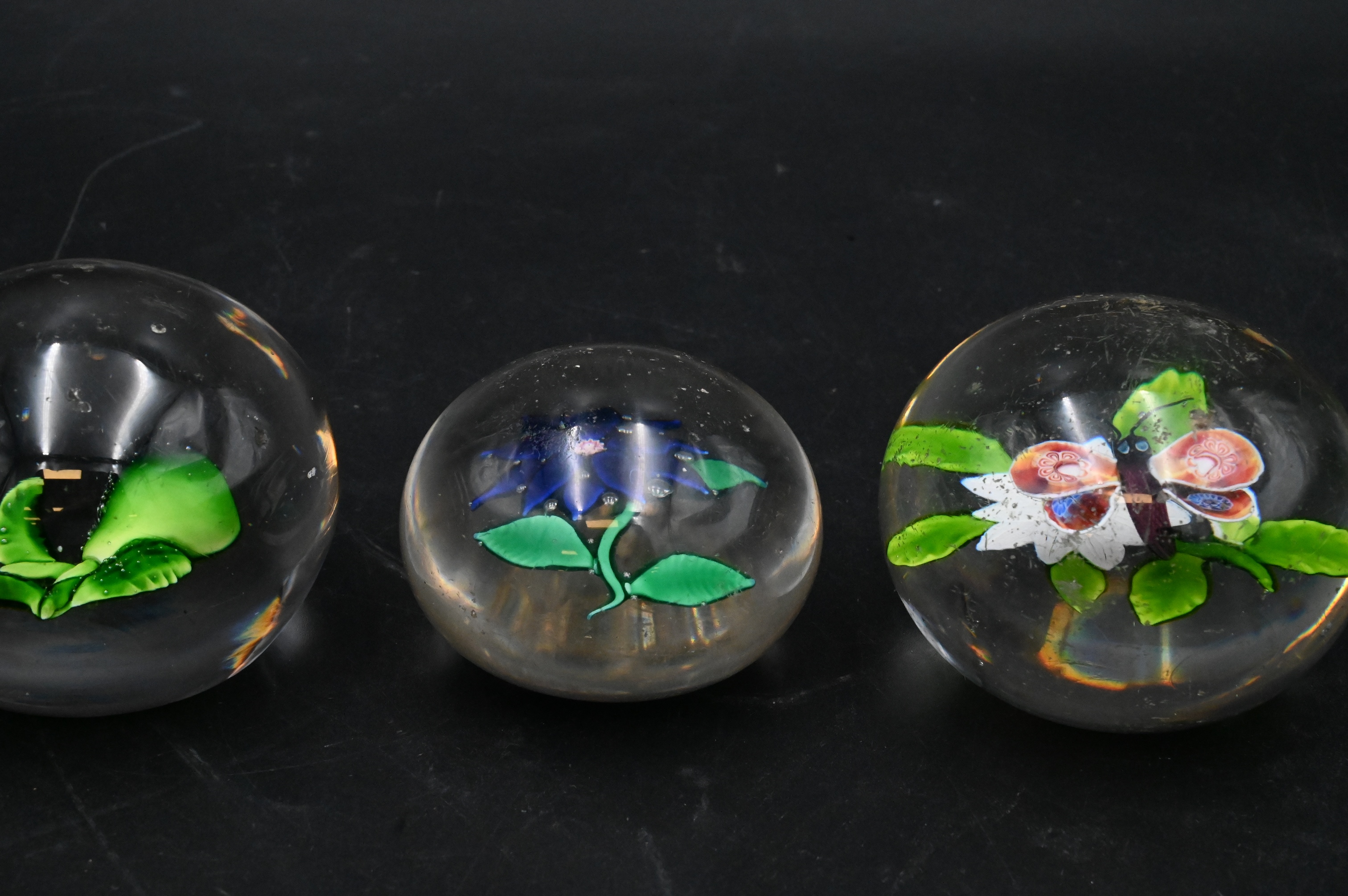 to include a butterfly/moth surmounting a white flower having green foliage, cut star on bottom, diameter 3 inches; a small paperweight having blue flower, diameter 2 1/2 inches; along with one having a green pear and foliage, diameter 3 1/4 inches