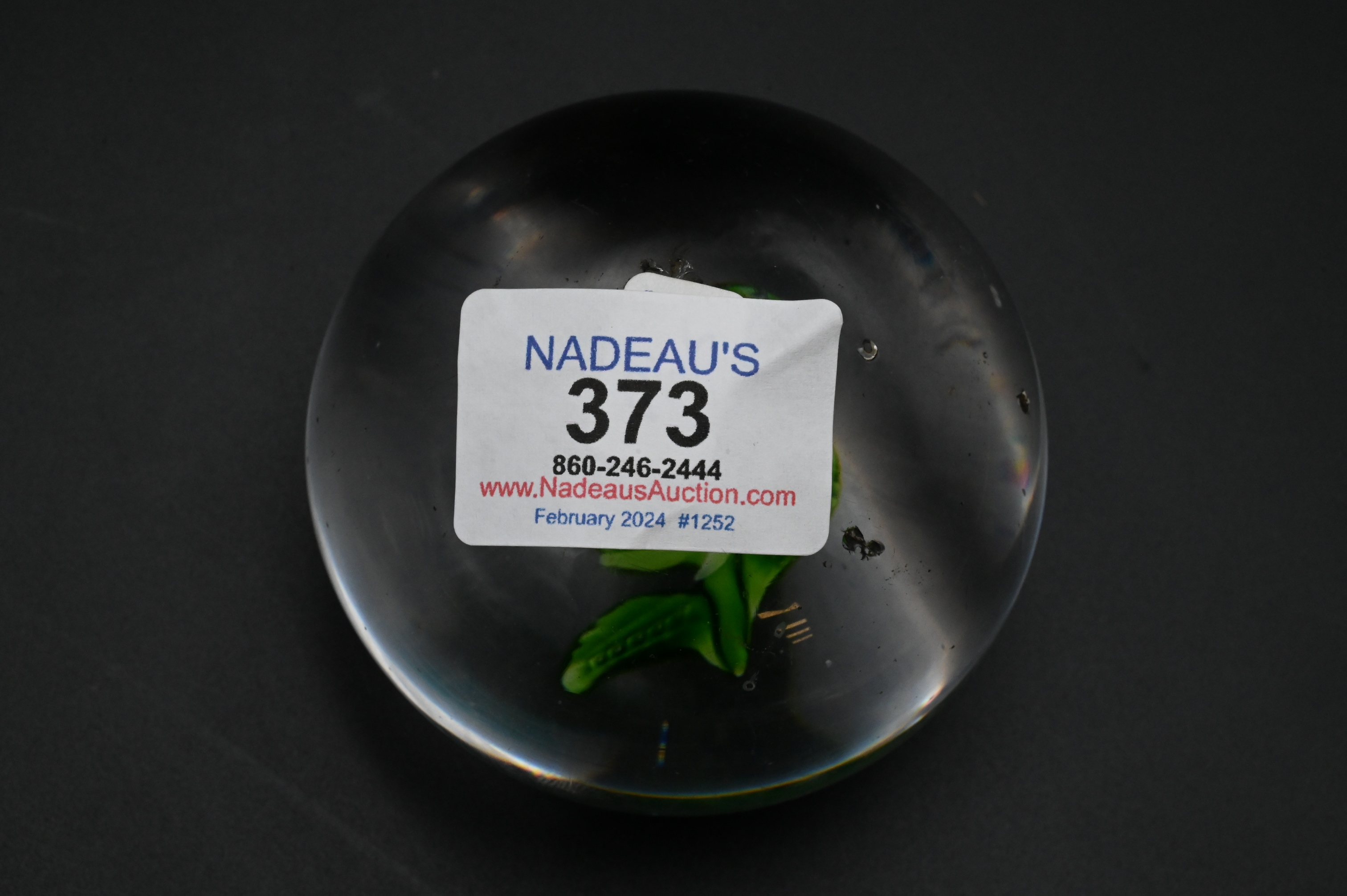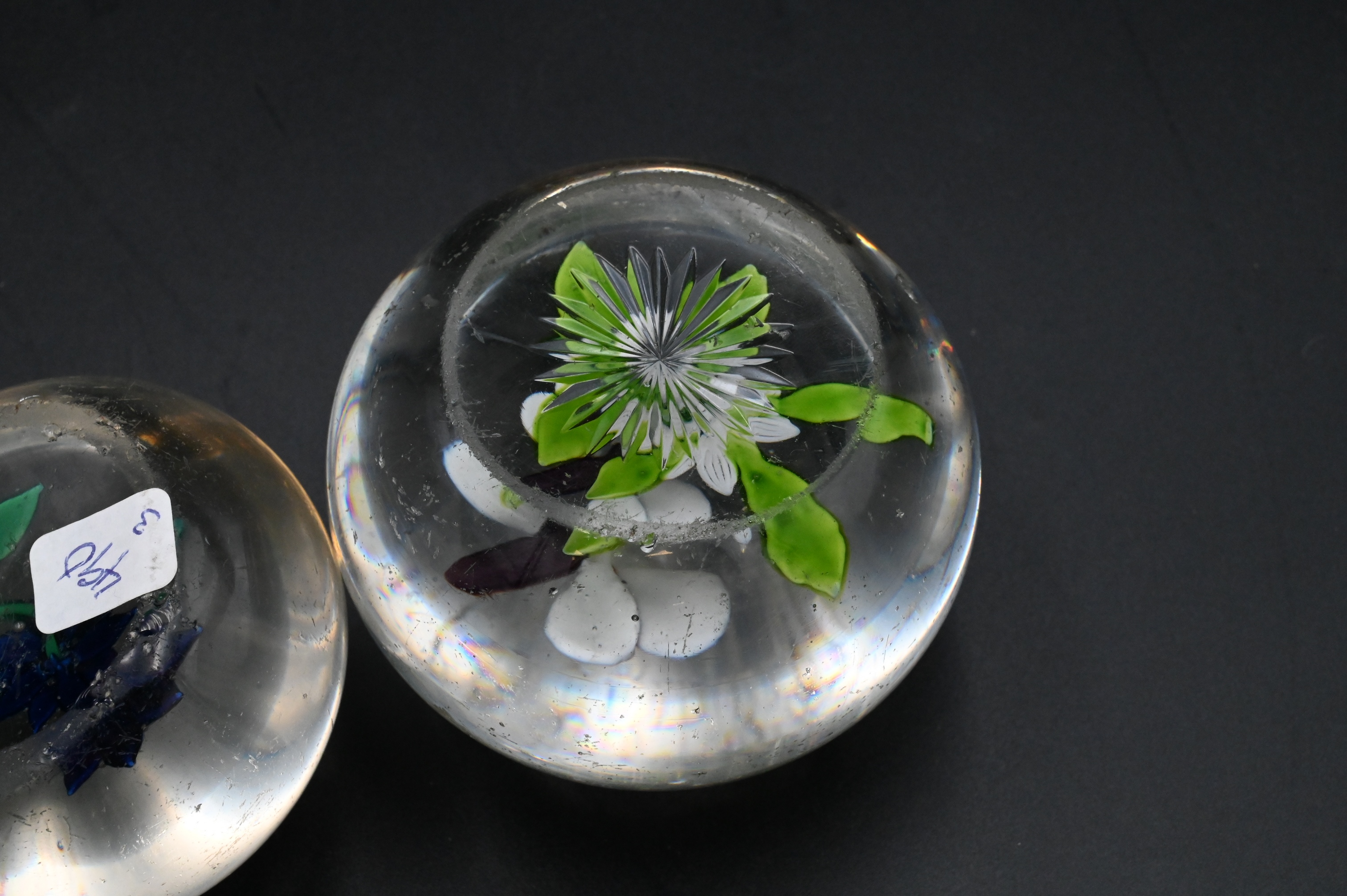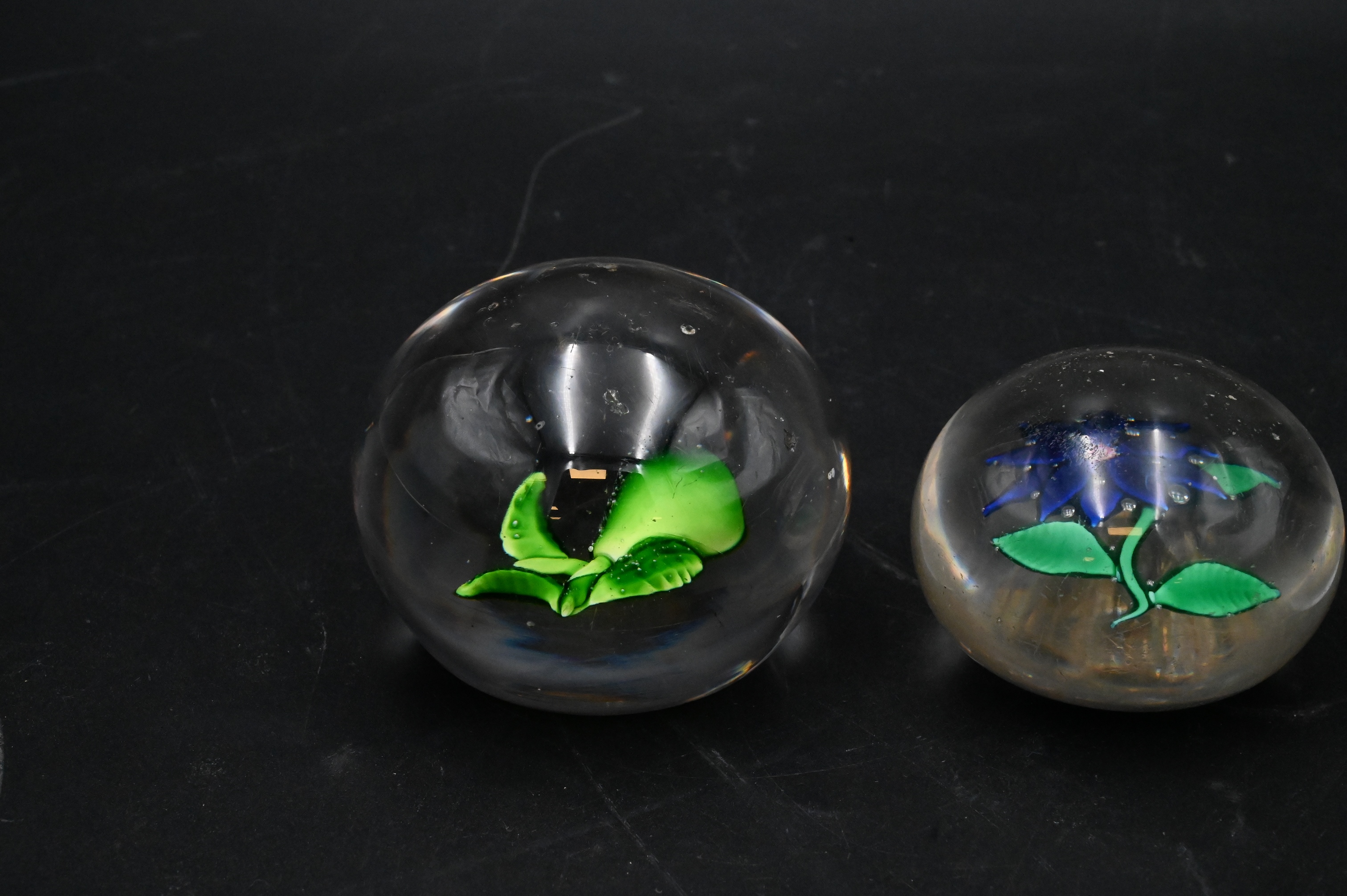 to include a butterfly/moth surmounting a white flower having green foliage, cut star on bottom, diameter 3 inches; a small paperweight having blue flower, diameter 2 1/2 inches; along with one having a green pear and foliage, diameter 3 1/4 inches