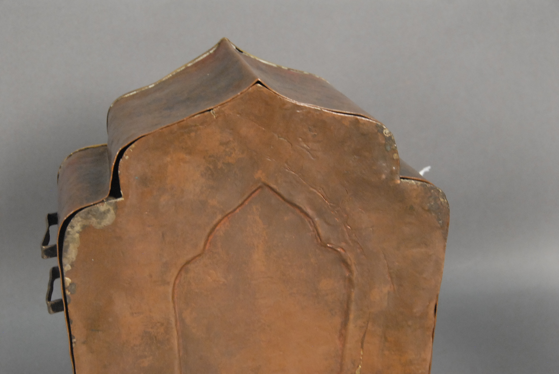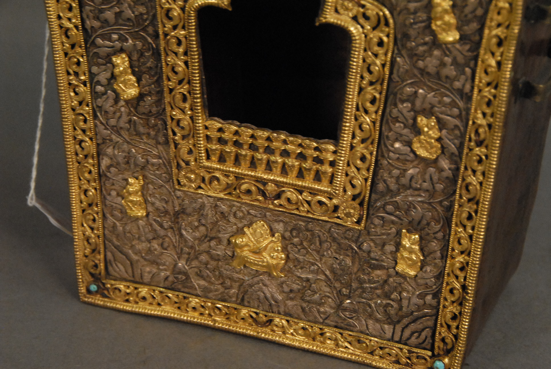 Tibetan gold, silver, and copper shrine with turquoise beads, ht. 8 1/2, wd. 6 1/2.