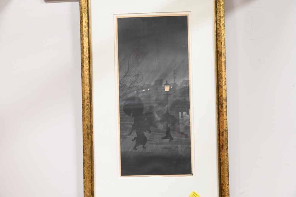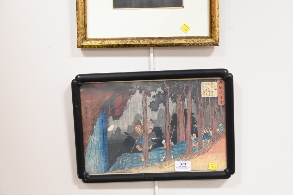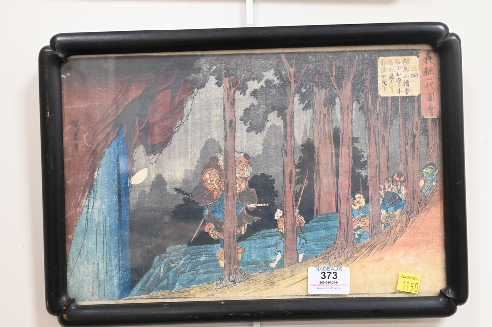 Lot 373: Two Japanese Woodblock Prints, to include Hirosaki, A Stormy Night, 9″ x 14″; Hiroshige, Encounter of Yoshitsume with the King of Te…