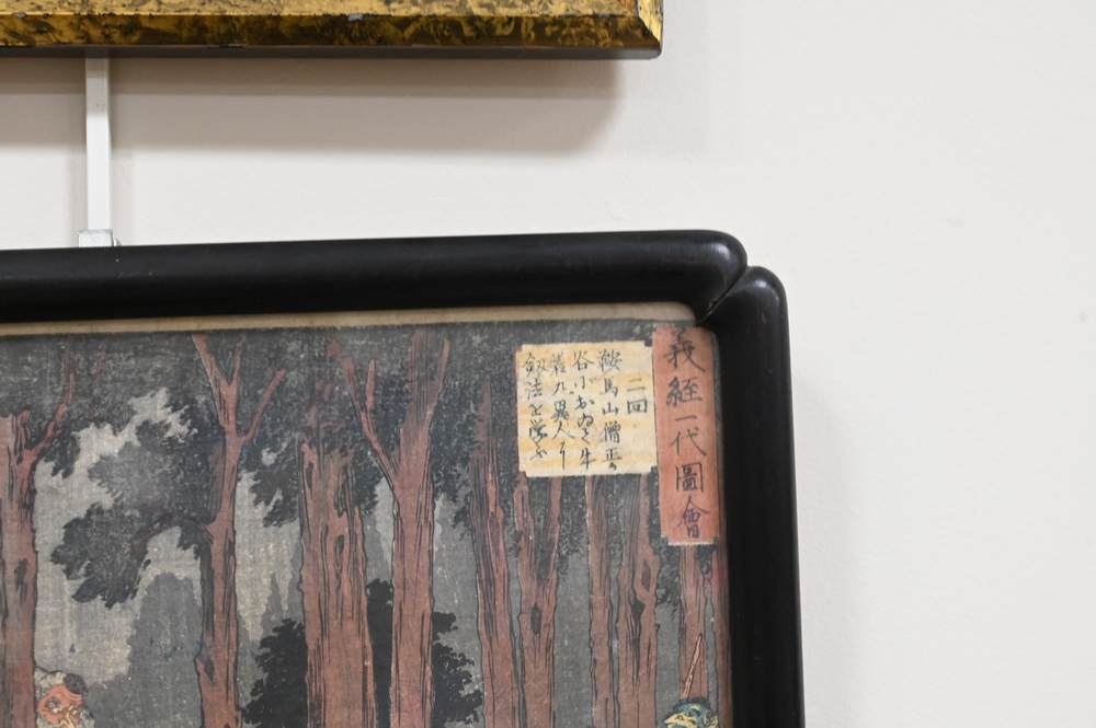 Two Japanese Woodblock Prints, to include Hirosaki, A Stormy Night, 9″ x 14″; Hiroshige, Encounter of Yoshitsume with the King of Tenzu; 15″ x 7″.