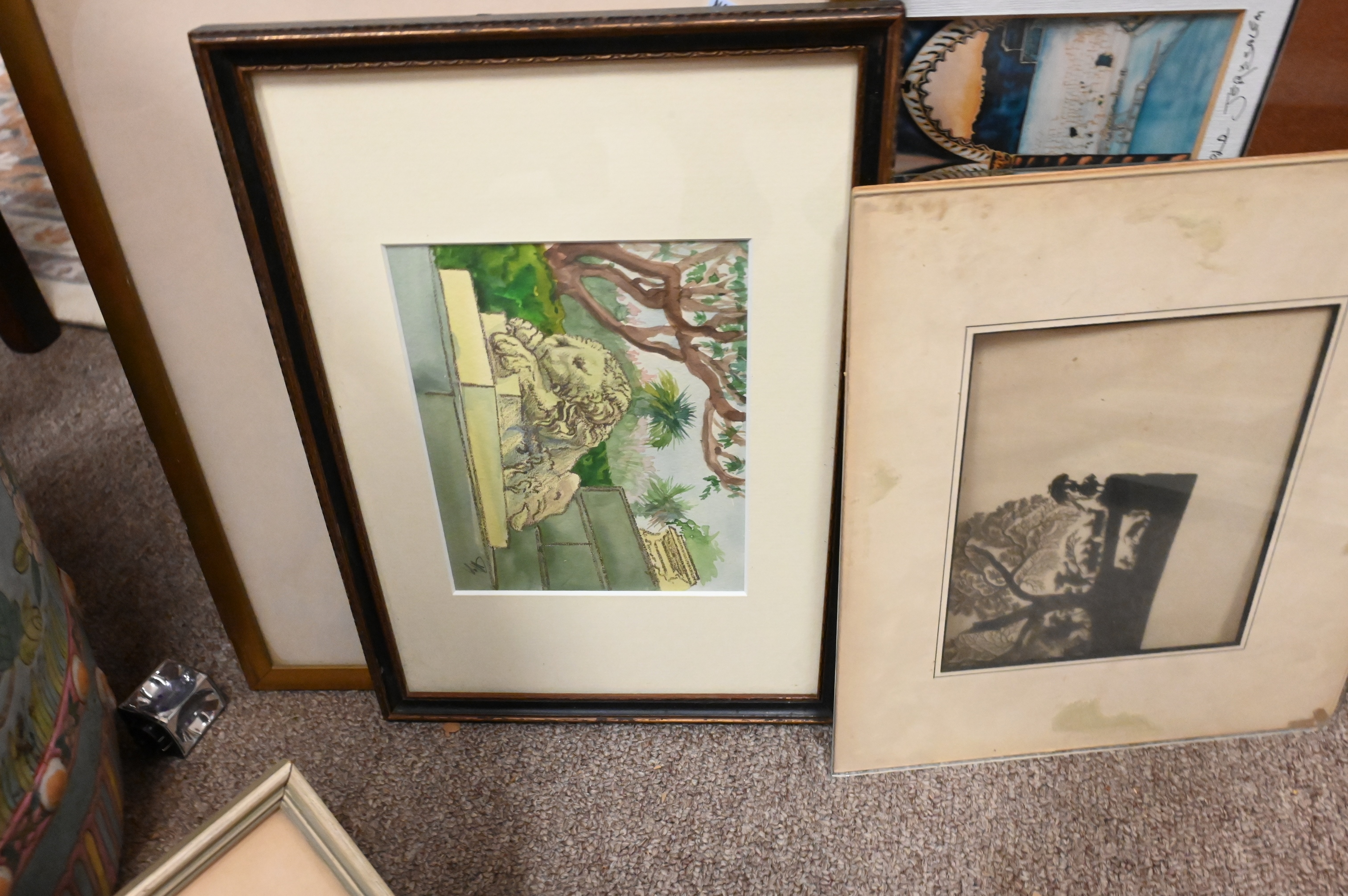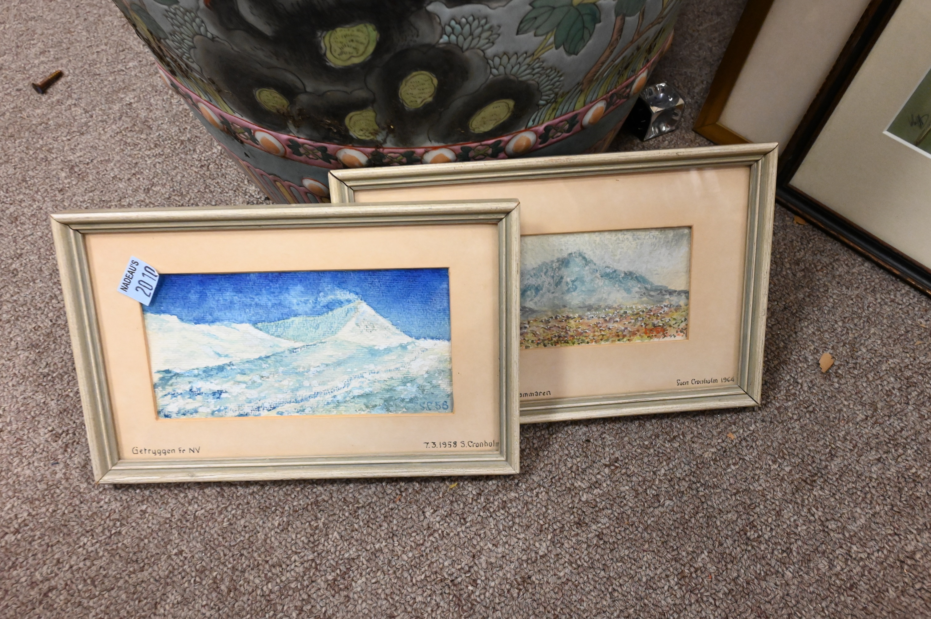 to include “Lion in the Garden on the Black Sea, Yaita” initialed lower right, description label on verso, purchased at the Alupka Palace in 1994, 5″ x 6″, two Sven Cronholm (Swedish 1908-1986) watercolors, “Getryggen 1958″ 3″ x 6”, “Liuhammaren 1964″ 2 1/2″ x 5 1/2″, Malta Street Scene 2006, description label on verso, signed lower left 4 3/4″ x 3 1/2”, “Italian Reflections”, Venice 1996, signed lower left with description label on verso 7 1/4″ x 5 1/4″, along with “Journey to a Mirage” acrylic on canvas, 1968 signed lower right 4″ x 4″, personal letter on verso, and others etc..