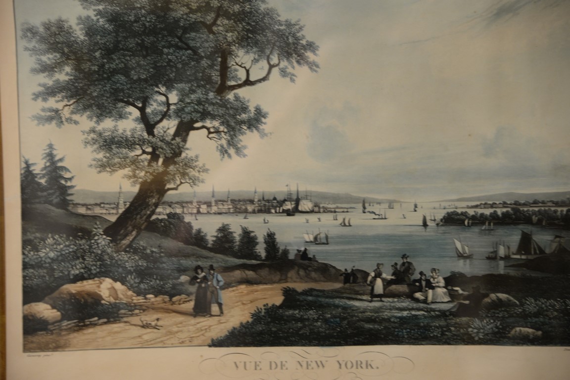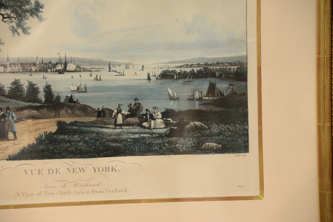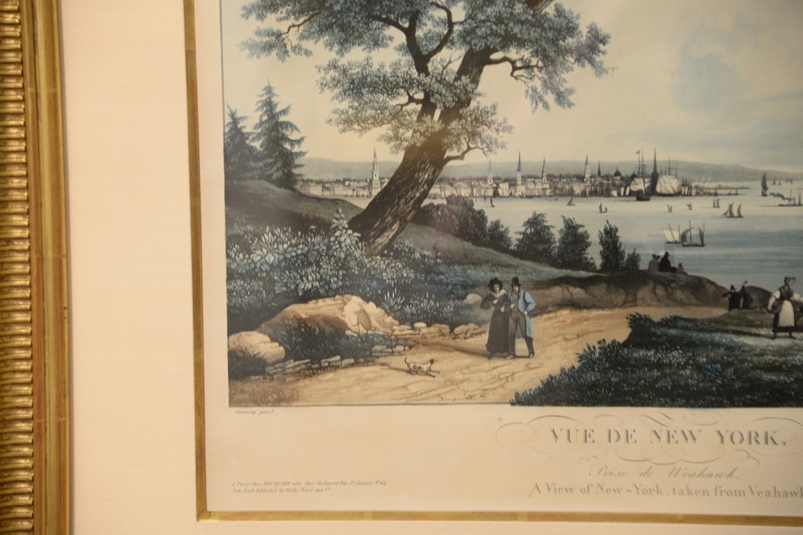 After Ambroise-Louis Garneray 1783-1857 hand colored aquatint Vue de New York Prise de Weahawk A View of New-York, taken from Veahawk marked lower left: Garneray Pinx marked lower left: A Paris chez Hocquart aine succr’ de Basset Rue St. Jacques no 64 New-York Published by Bailey Ward and Co. marked lower right: Himely Sculp, sight size 15 1/2 x 18 1/2 Provenance: Property from Credit Suisse’s Americana Collection
