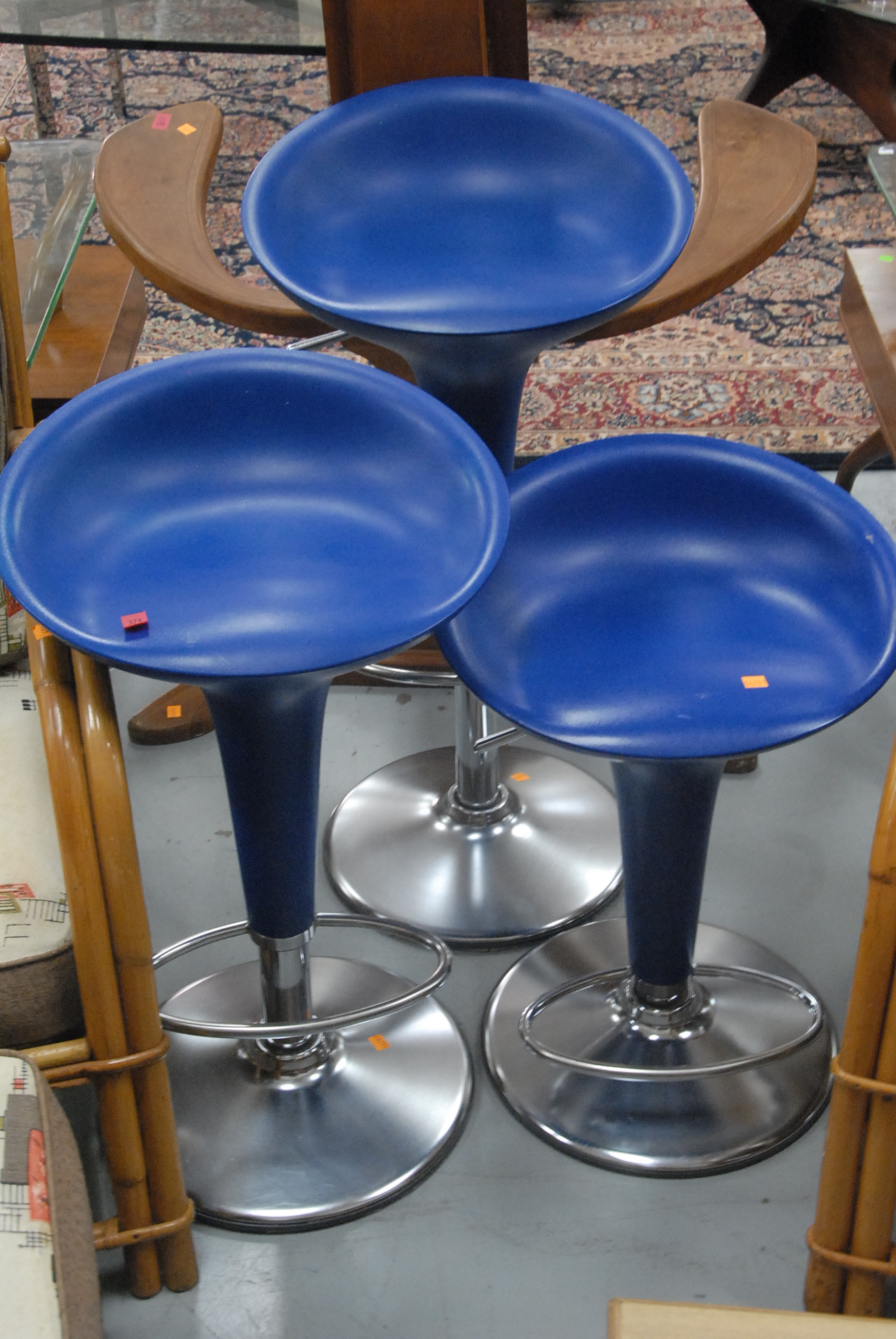 Lot 374: Contemporary seven piece lot three blue adjustable height counter stools with bright metal bases together with four Alvar Aalto sty…