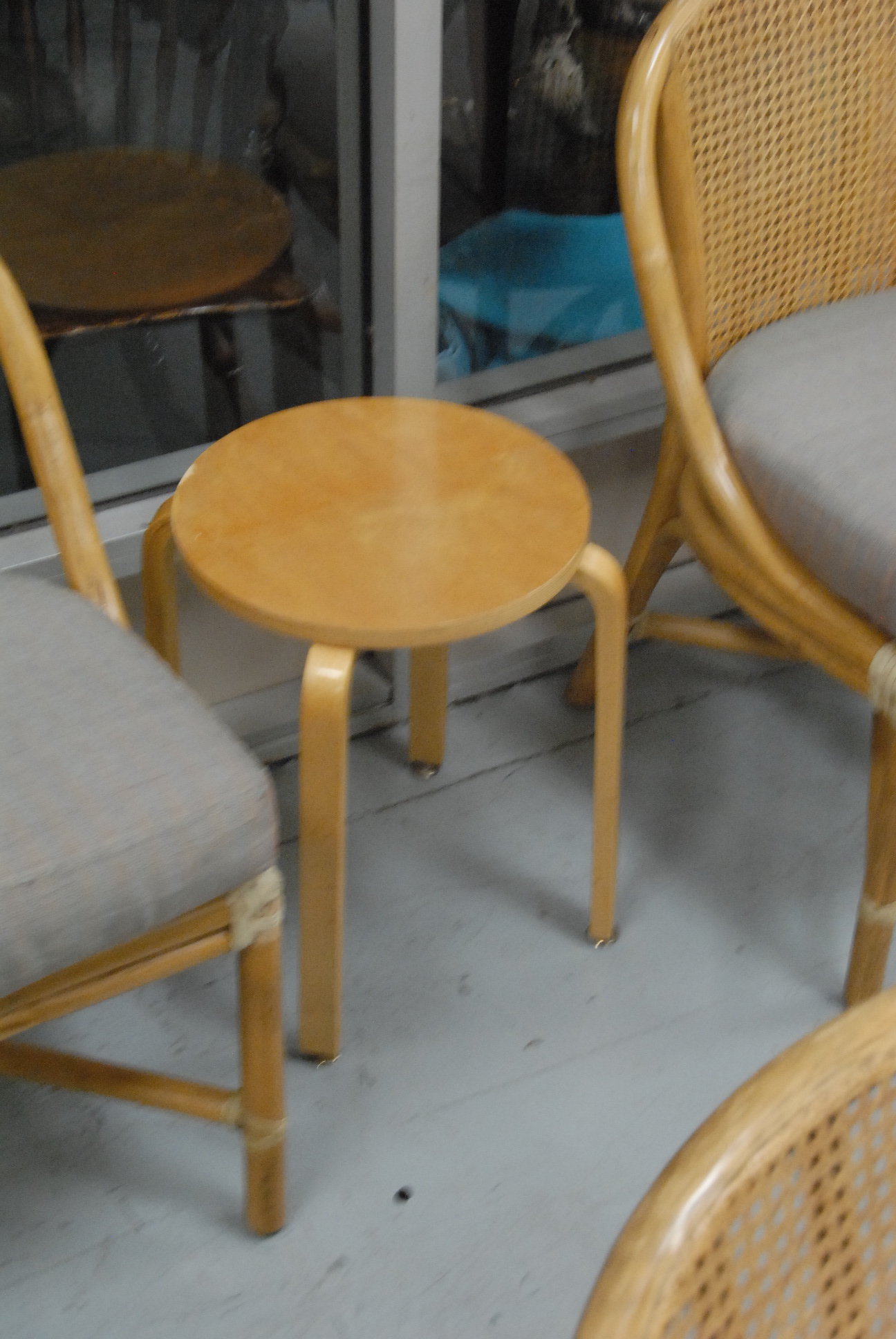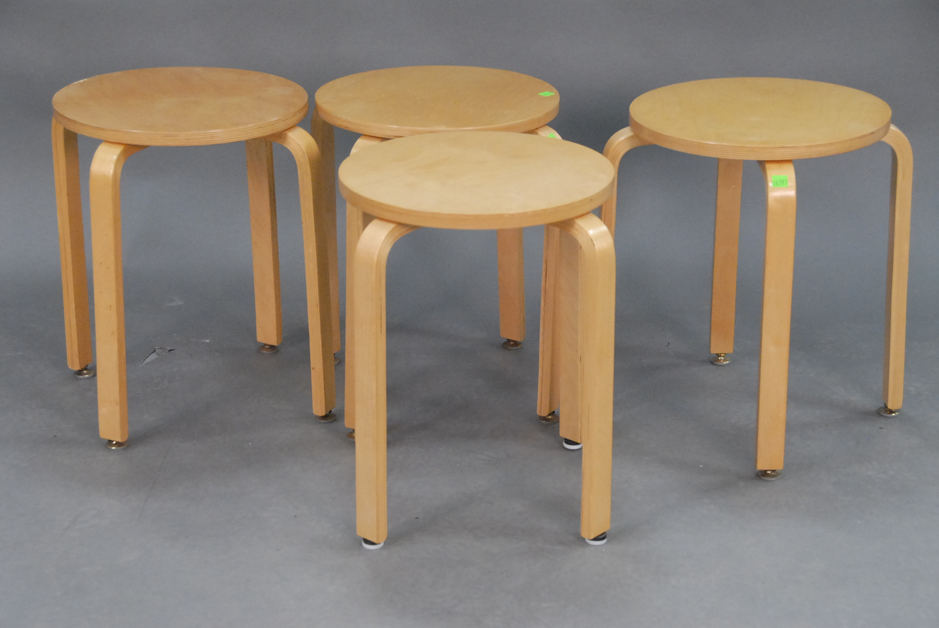 Contemporary seven piece lot three blue adjustable height counter stools with bright metal bases together with four Alvar Aalto style bent ply stacking table/stools.