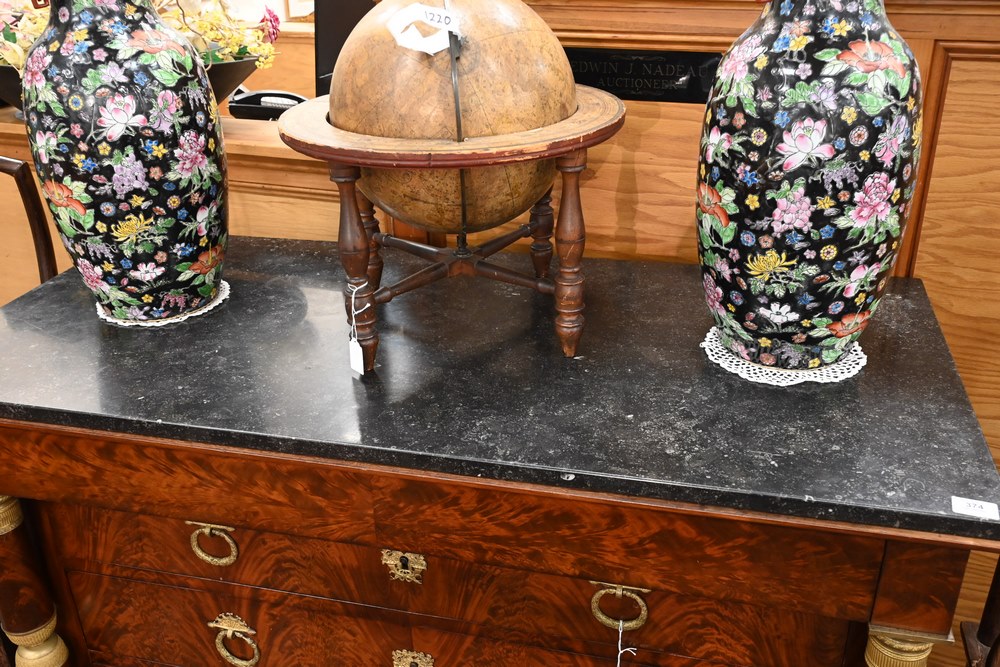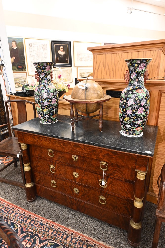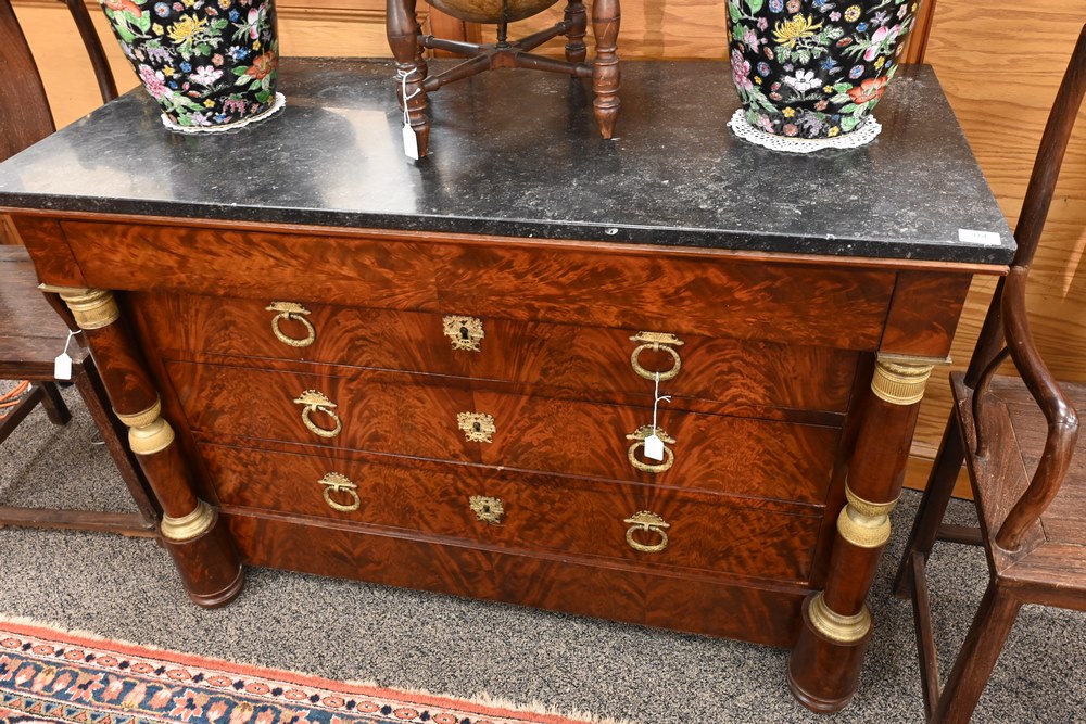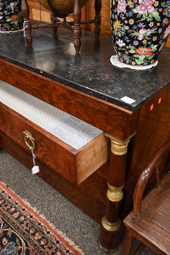 having black marble top over four drawers flanked by gilt bronze mounted columns