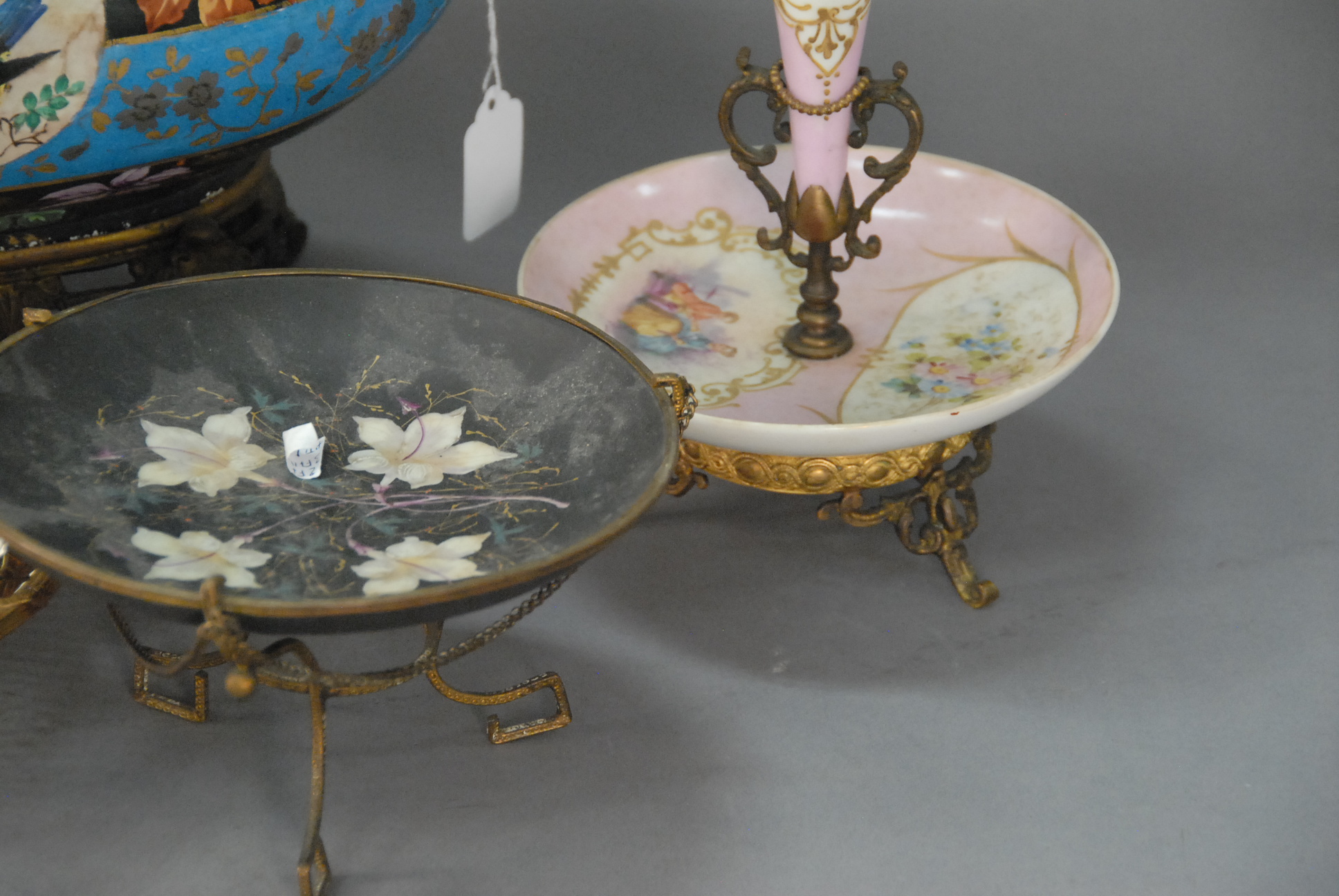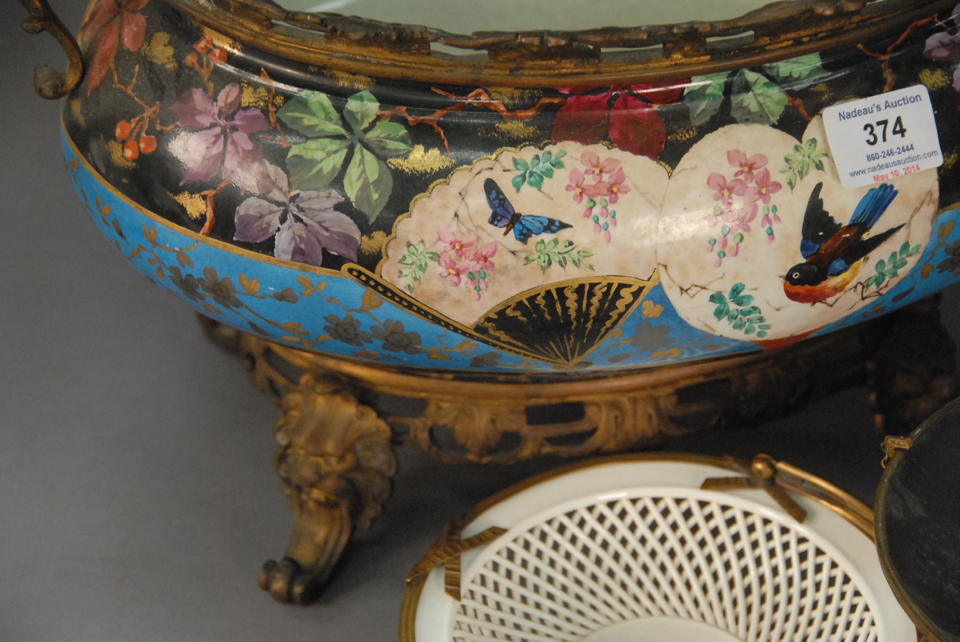 Lot 374: Four piece metal mounted group to include Sevres vase, basket weave dish, large hand painted brass bowl and a dish on stand.