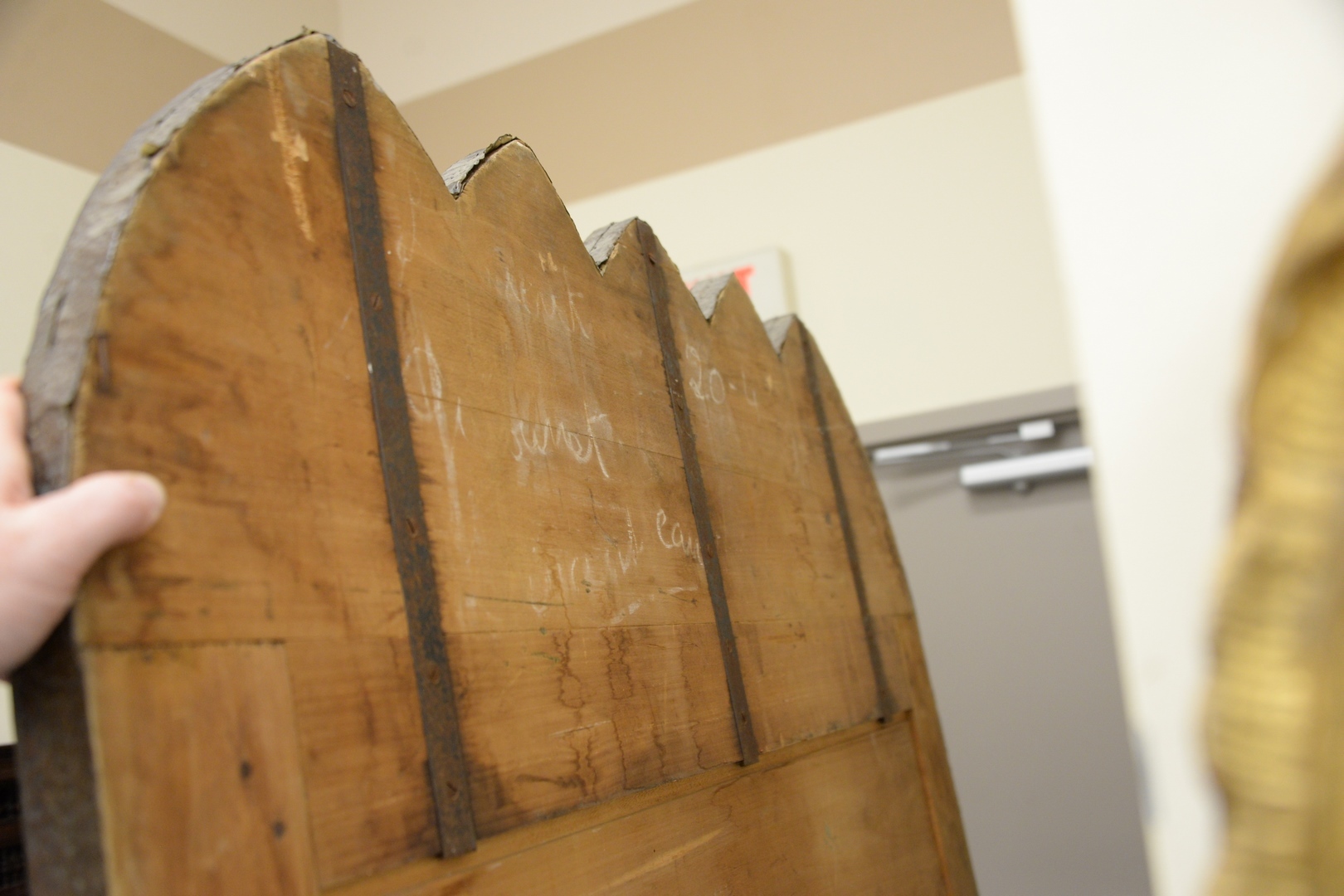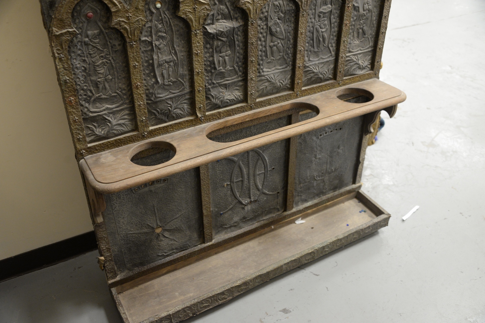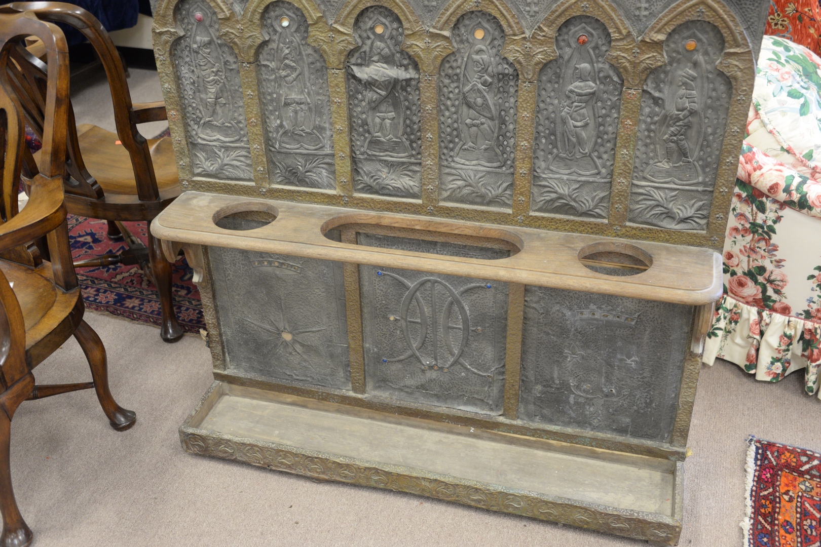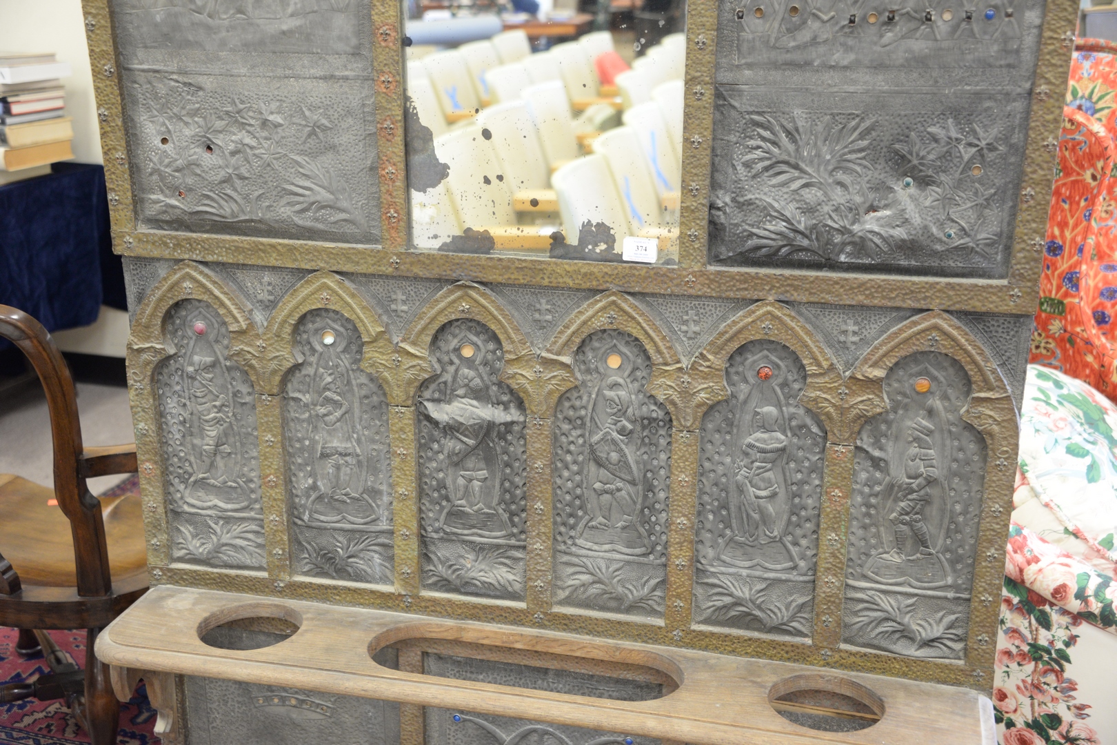 Lot 374: Gothic Hall Rack, having embossed brass and embossed pewter figures, King Arthur & Knights mounted with various colored glass beads …