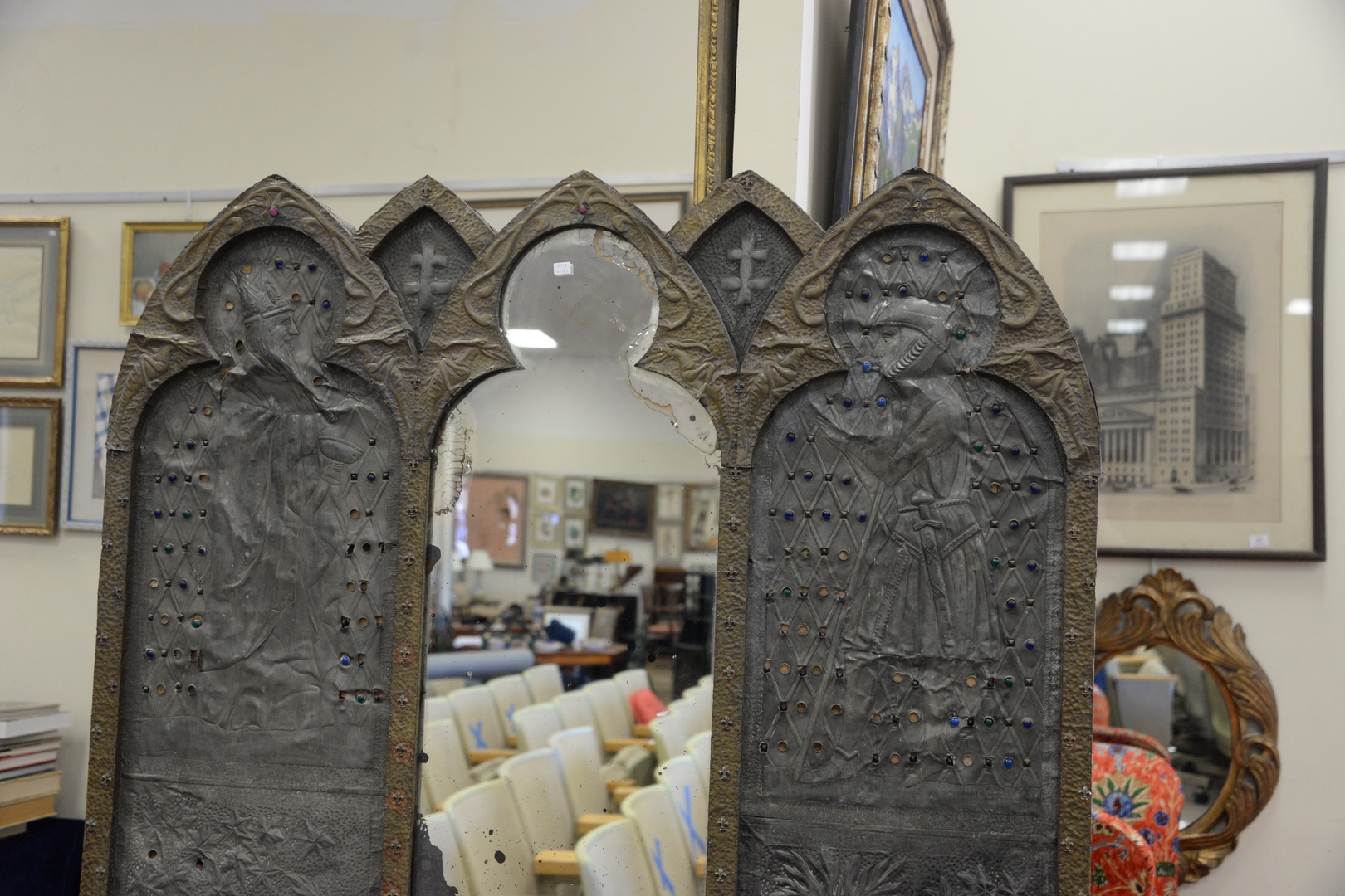 Gothic Hall Rack, having embossed brass and embossed pewter figures, King Arthur & Knights mounted with various colored glass beads and mirror center several cubed glass beads missing, height 79 inches, width 43 inches. Provenance: Former home of Mel Gibson, Old Mill Rd, Greenwich, Connecticut.