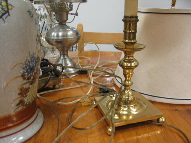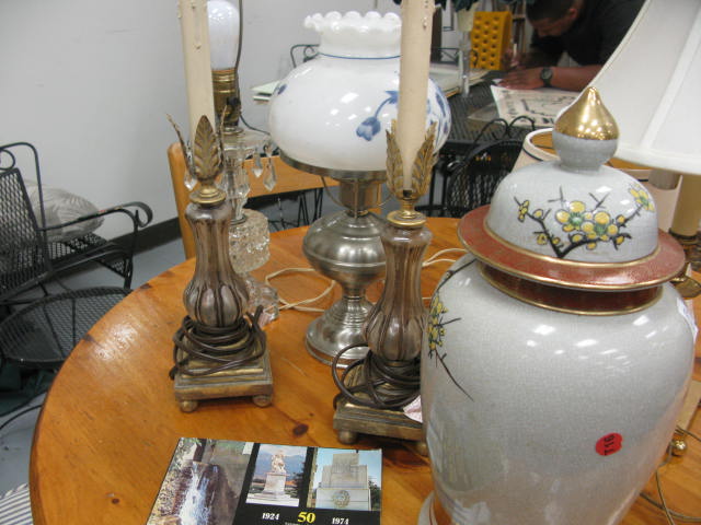 Group of five table lamps, porcelain jar and two framed mirrors, pine headboard and black and brass headboard