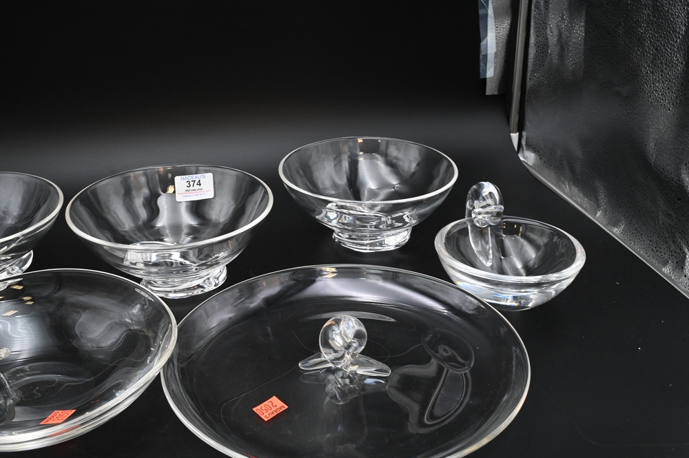 Lot 374: Group of Seven Steuben Glass Pieces, set of three matching bowls, two small bowls, with a matching larger bowl along with a round tray, all signed Steuben on bottom, tray diameter 11 inches.
