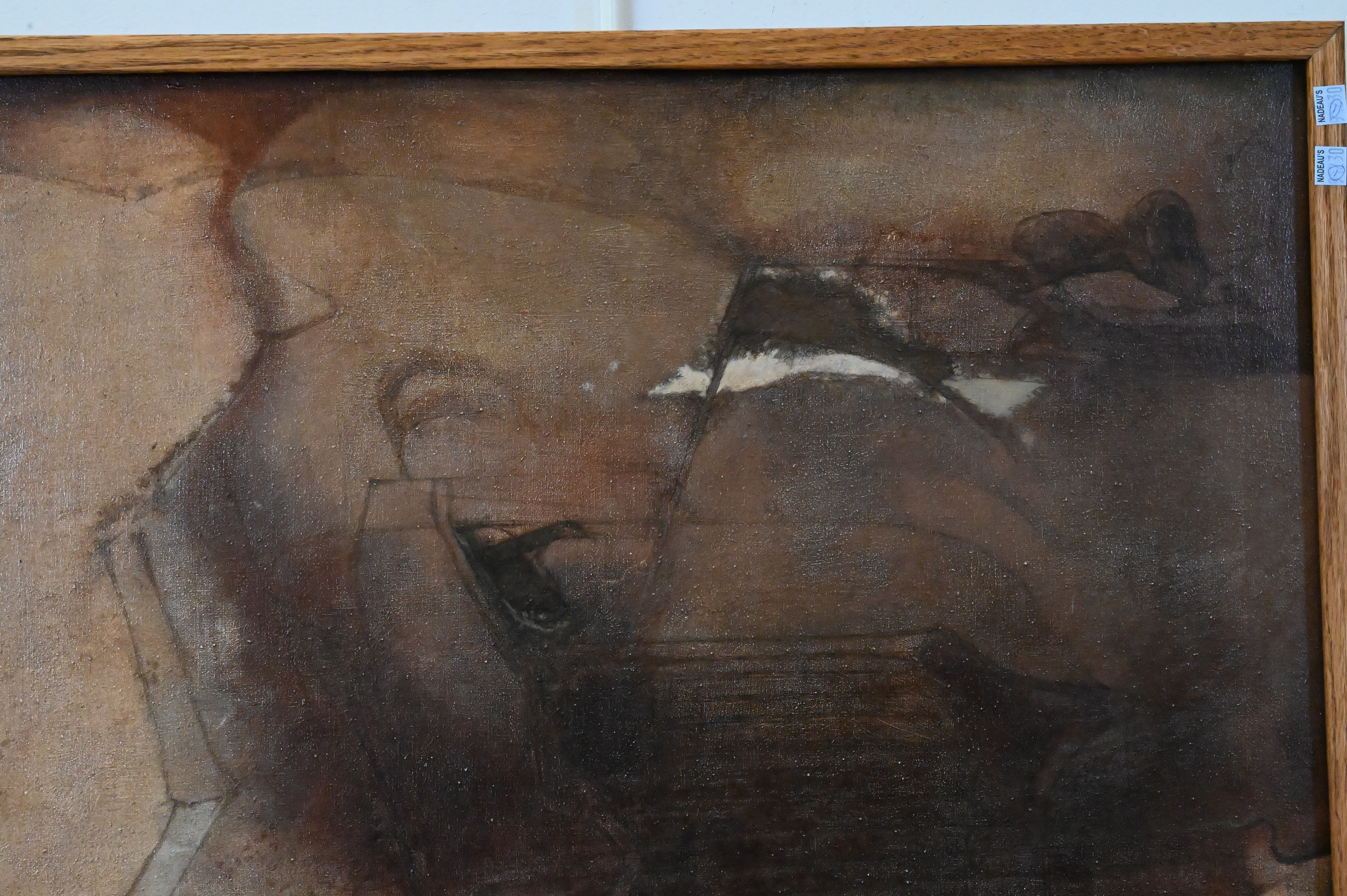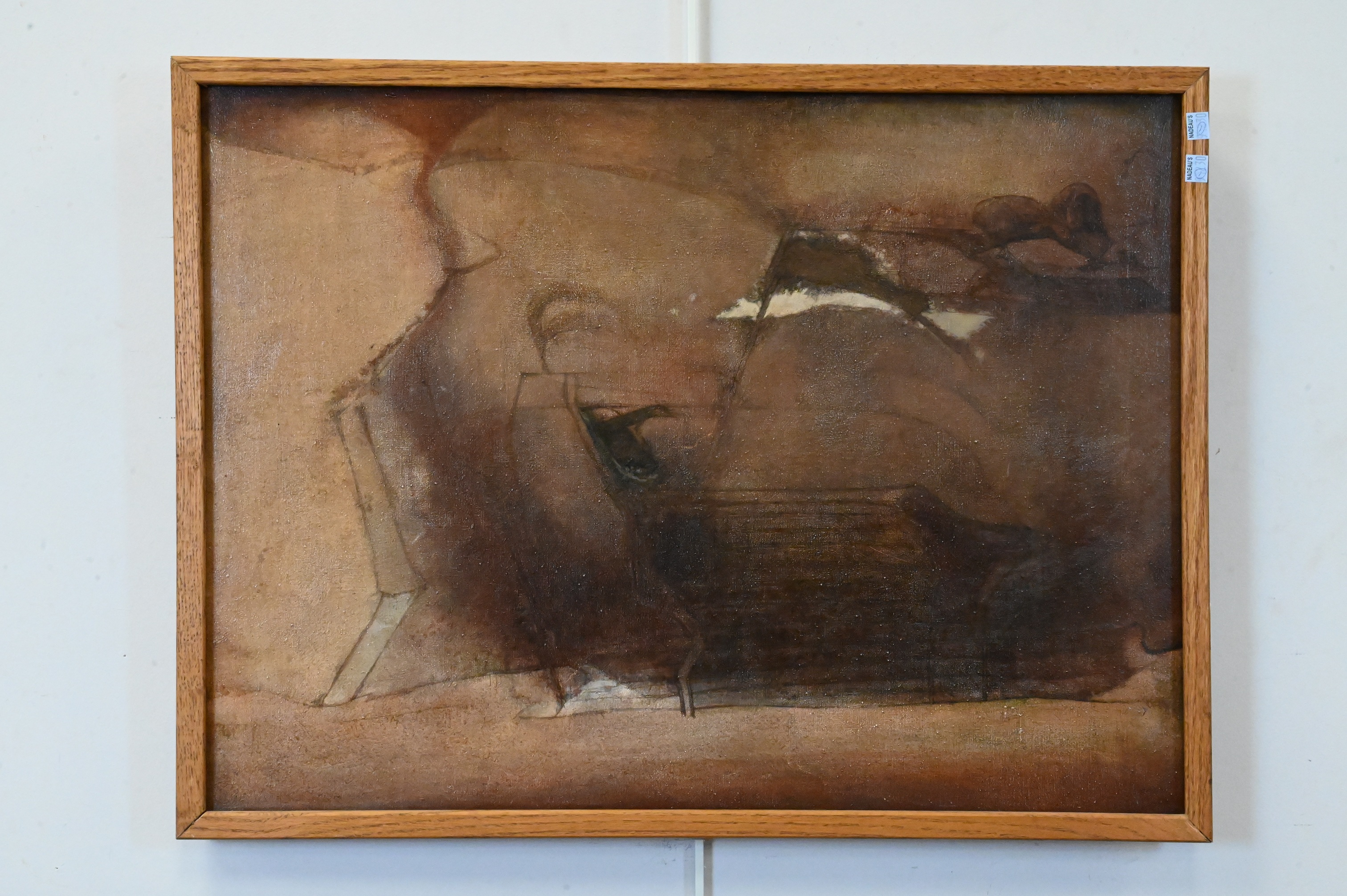 Subtle abstract painting executed in warm brown, umber, and earthy tones, the composition built from softly blended planes, linear elements, and shadowed geometric forms emerging from a textured ground. Stajuda’s restrained palette and atmospheric handling reflect his hallmark exploration of spatial ambiguity and quiet, meditative abstraction