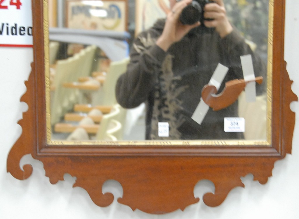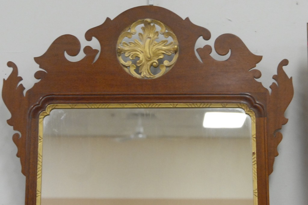 Margolis mahogany mirror with gilt pierced carving signed with paper label. height 43 1/2in. width 23in.