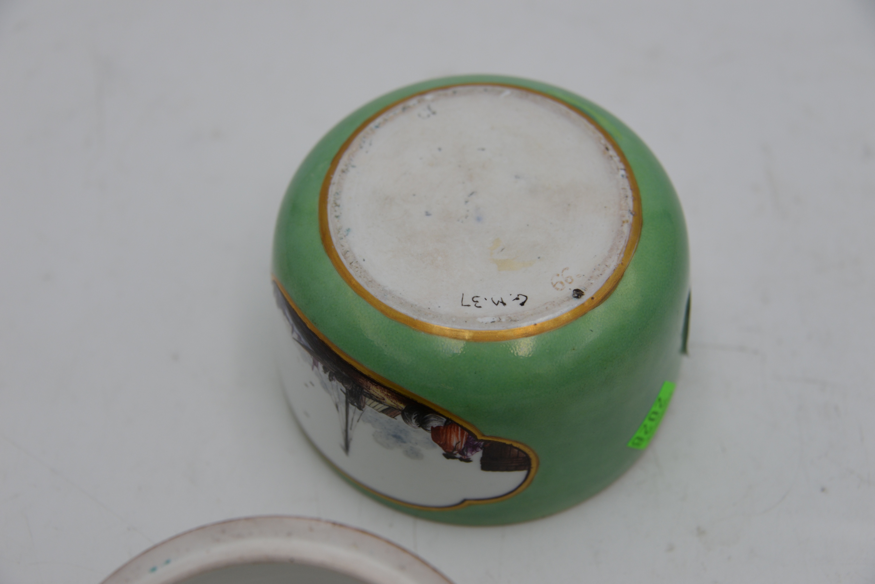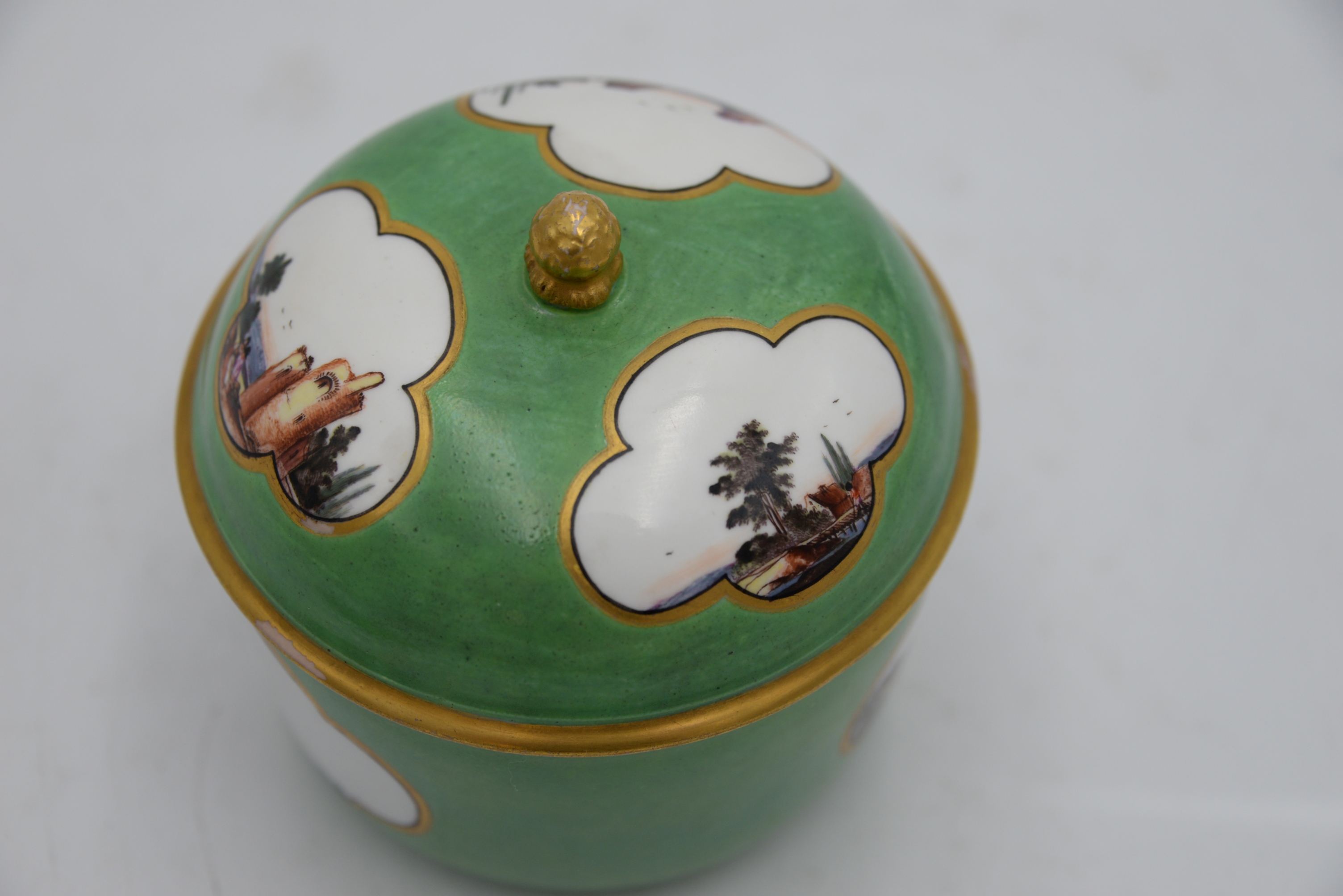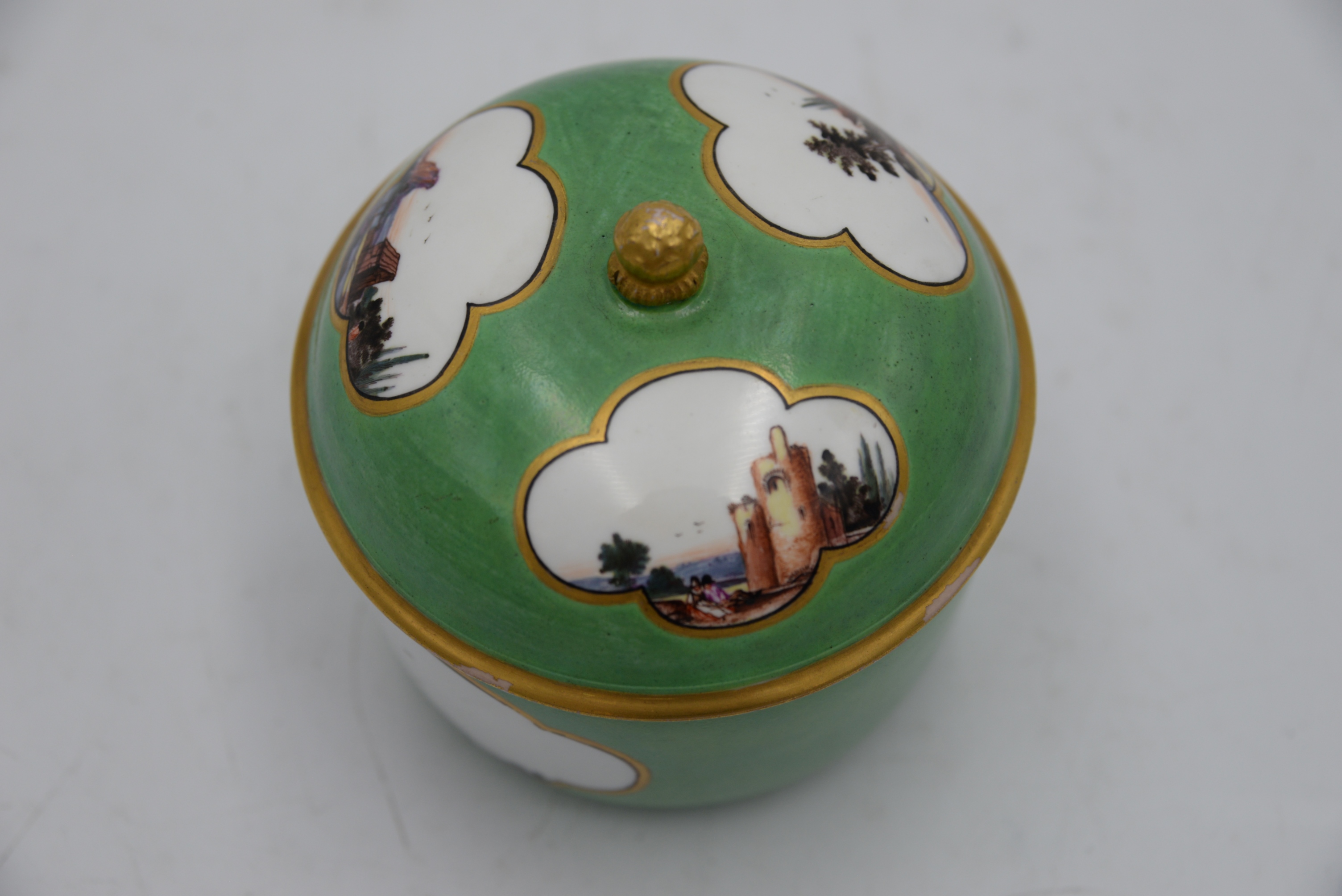 Meissen Green Ground Circular Sugar Bowl and Cover, circa 1740, 18th century, painted in the manner of Heintze, two cartouches of figures at a quayside and in landscape, the cover painted with fruit finial and painted with small landscape reserves, bottom marked with gilt numeral “99” and script letter “H” and press number 10, height 4 1/2 inches, diameter 4 1/2 inches. Provenance: Parke-Bernet Galleries, December 1971 sale, item #118, Julius H Jacobson II a Fifth Avenue Estate.