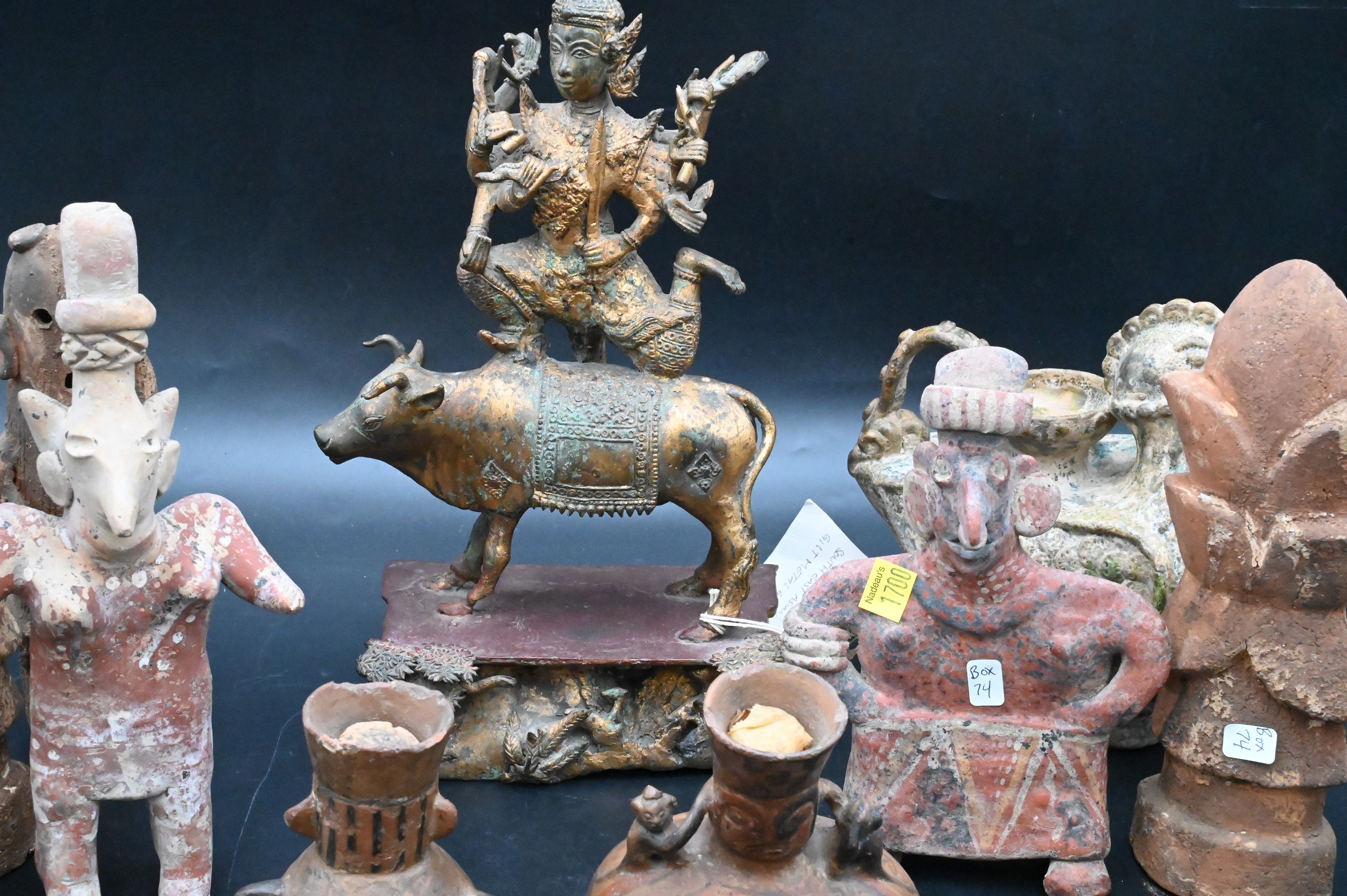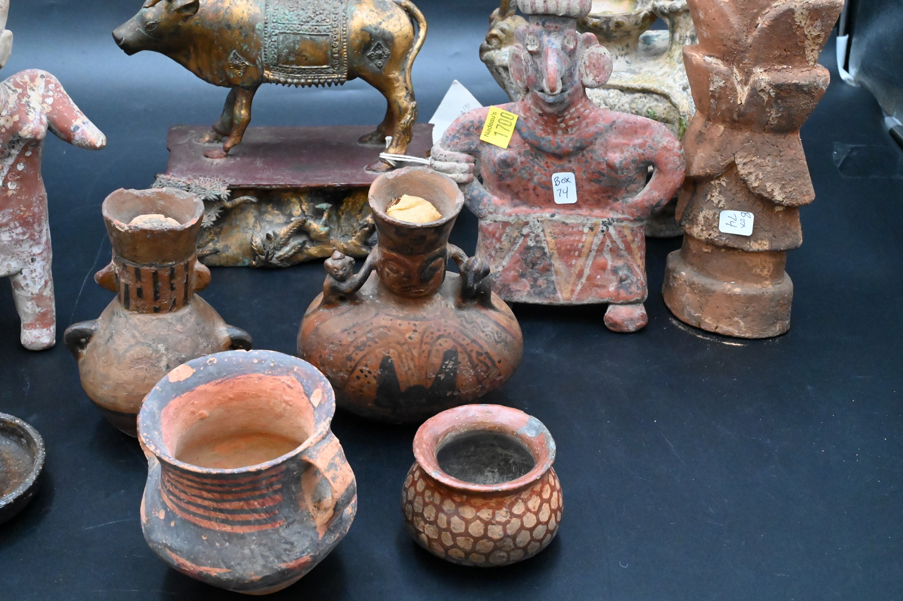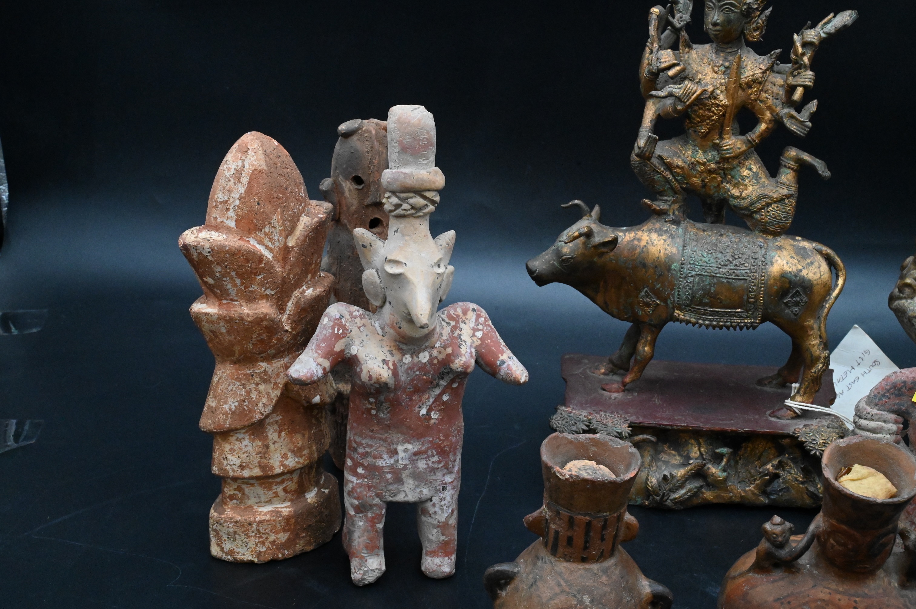 to include two Ixtlan Del Rio Nayarit style figures tallest 10 1/2 inches, earthenware painted in red, cream, and yellow, two figural vases, several vessels, Hindu deity on bull