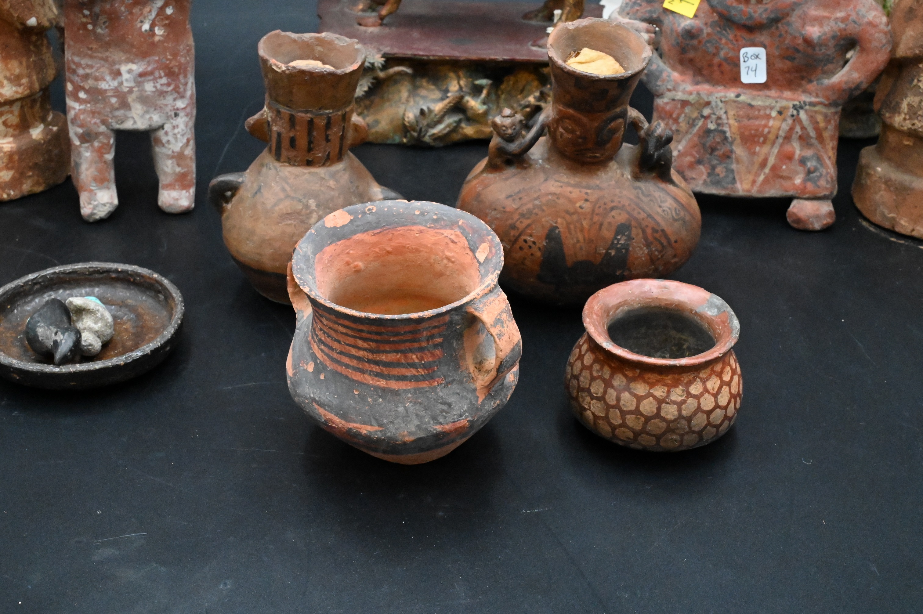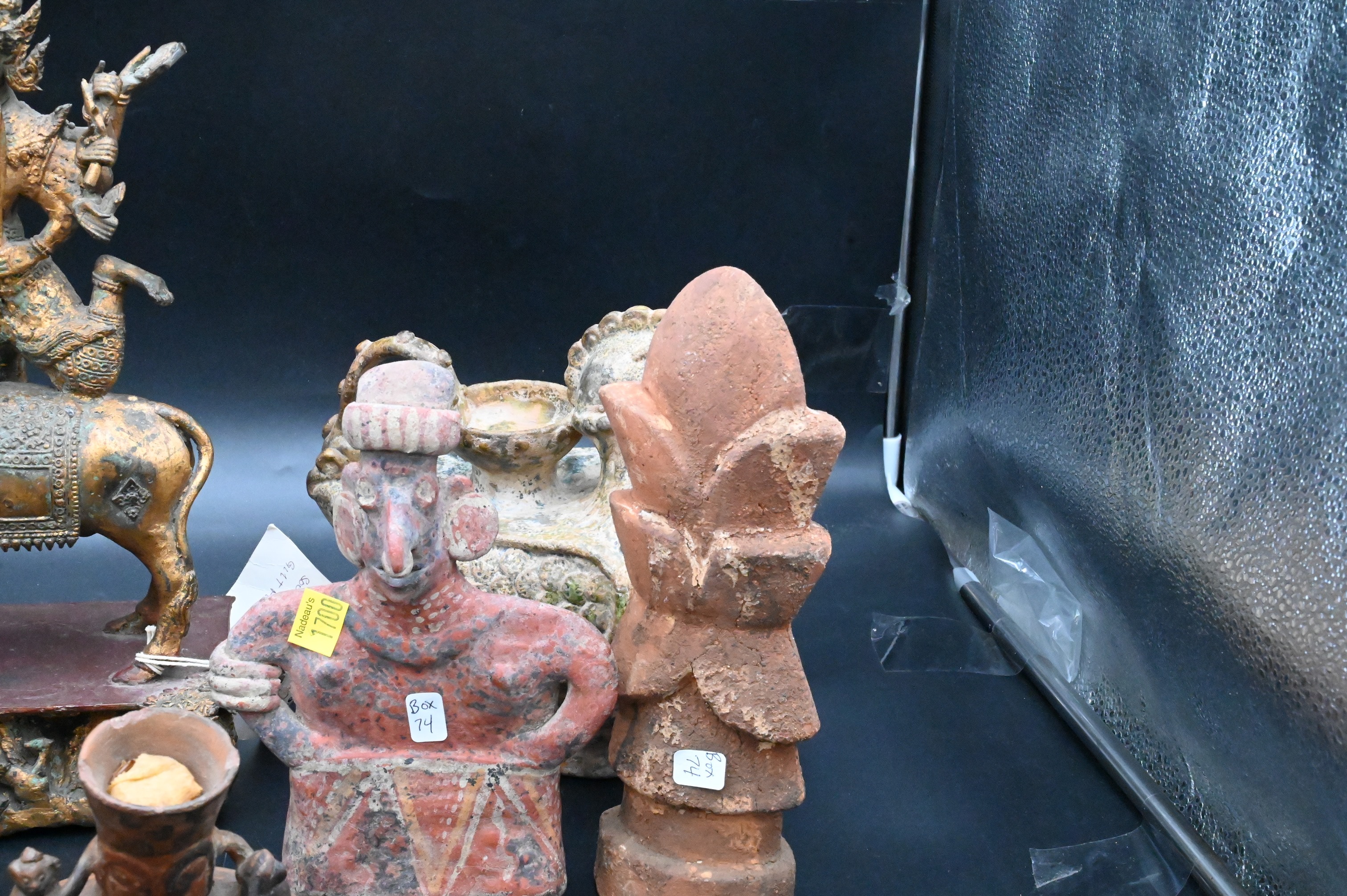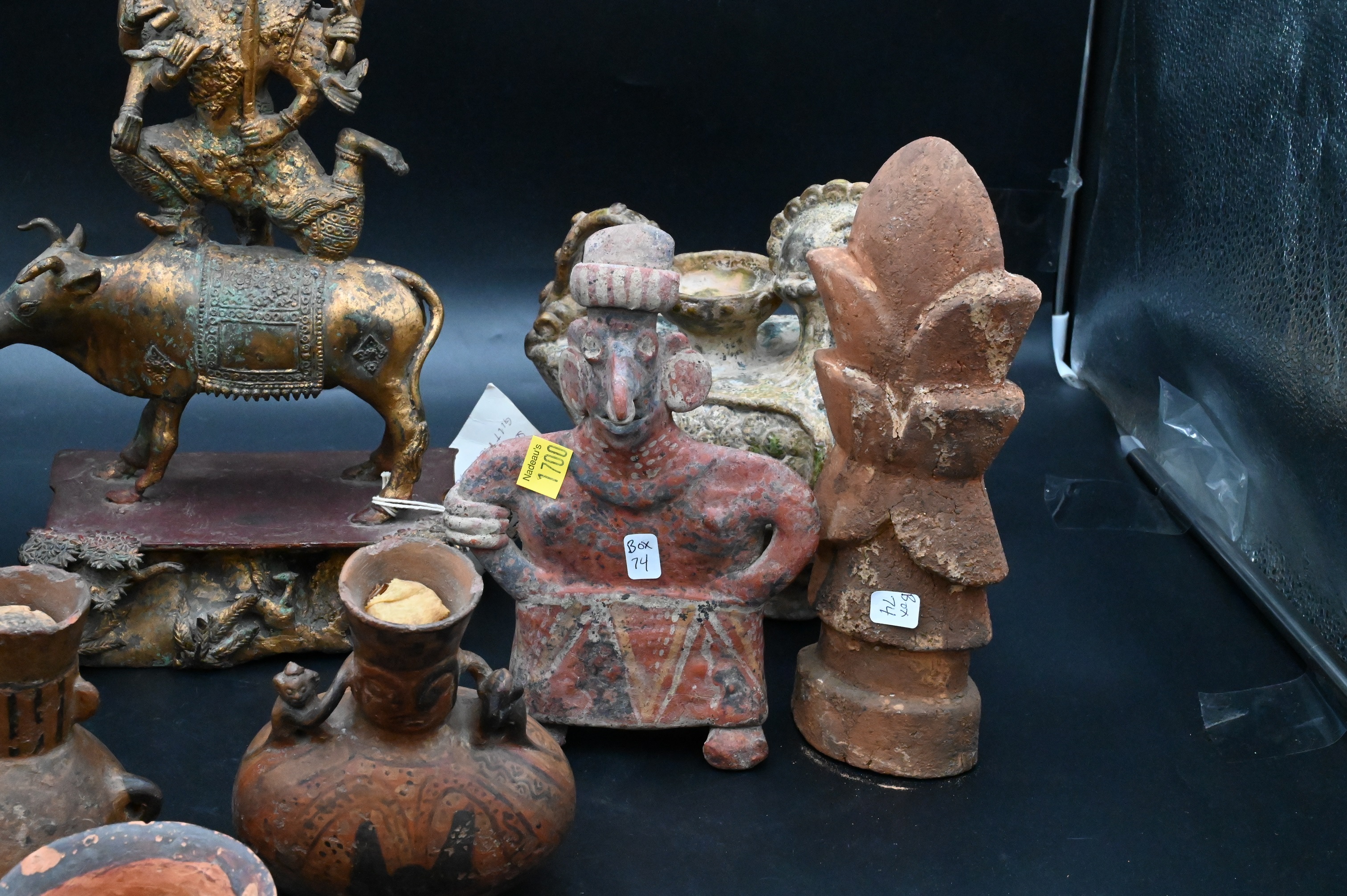 to include two Ixtlan Del Rio Nayarit style figures tallest 10 1/2 inches, earthenware painted in red, cream, and yellow, two figural vases, several vessels, Hindu deity on bull