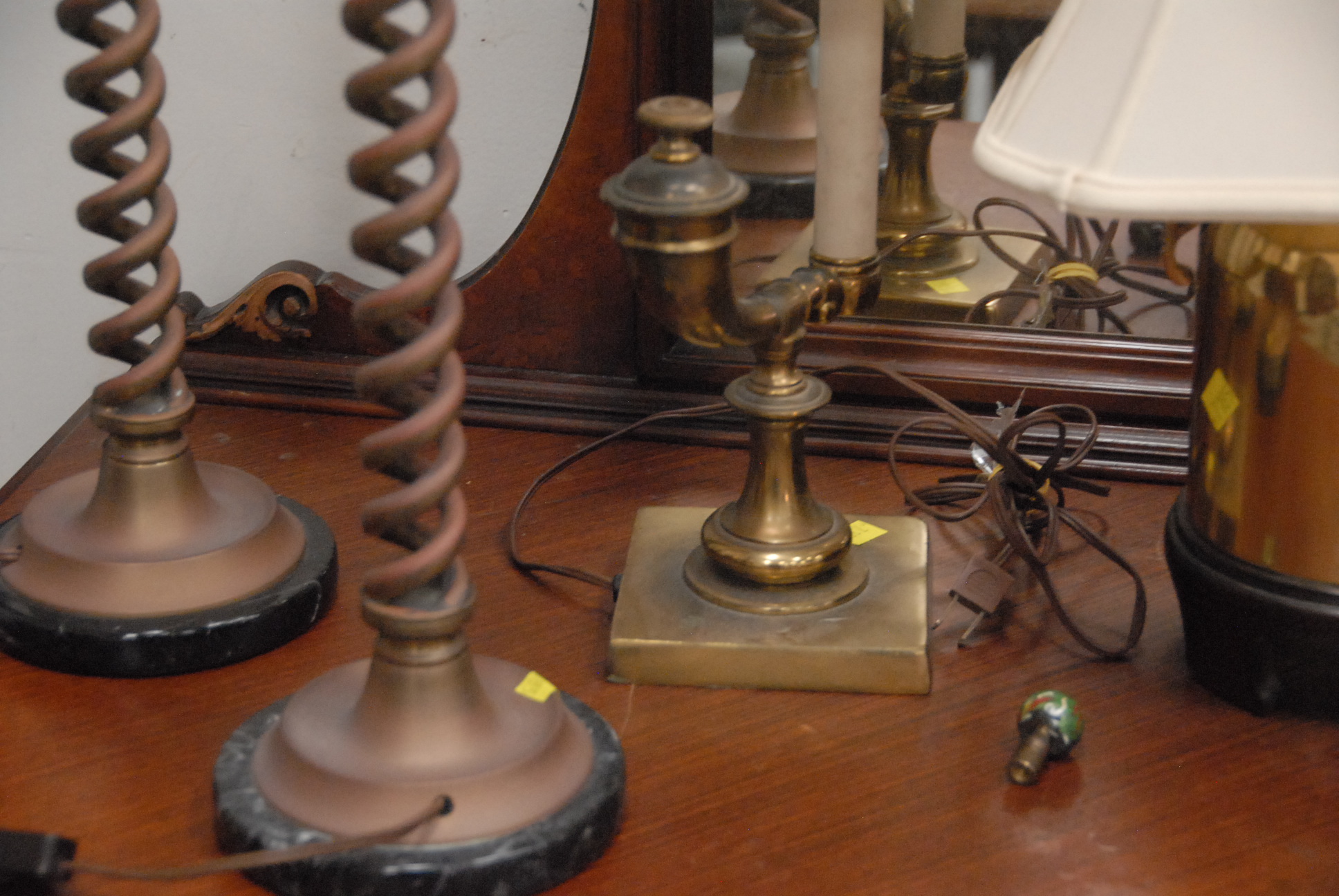 Six brass table lamps. hts. 16 to 31.