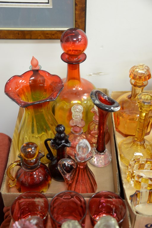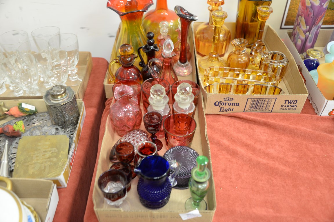 Lot 374: Three box lots of art and cut glass to include amber cut to clear glass decanters, bottles, and vases.