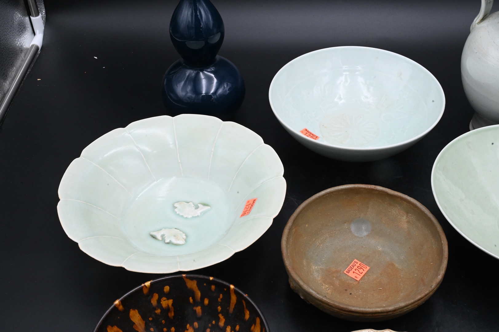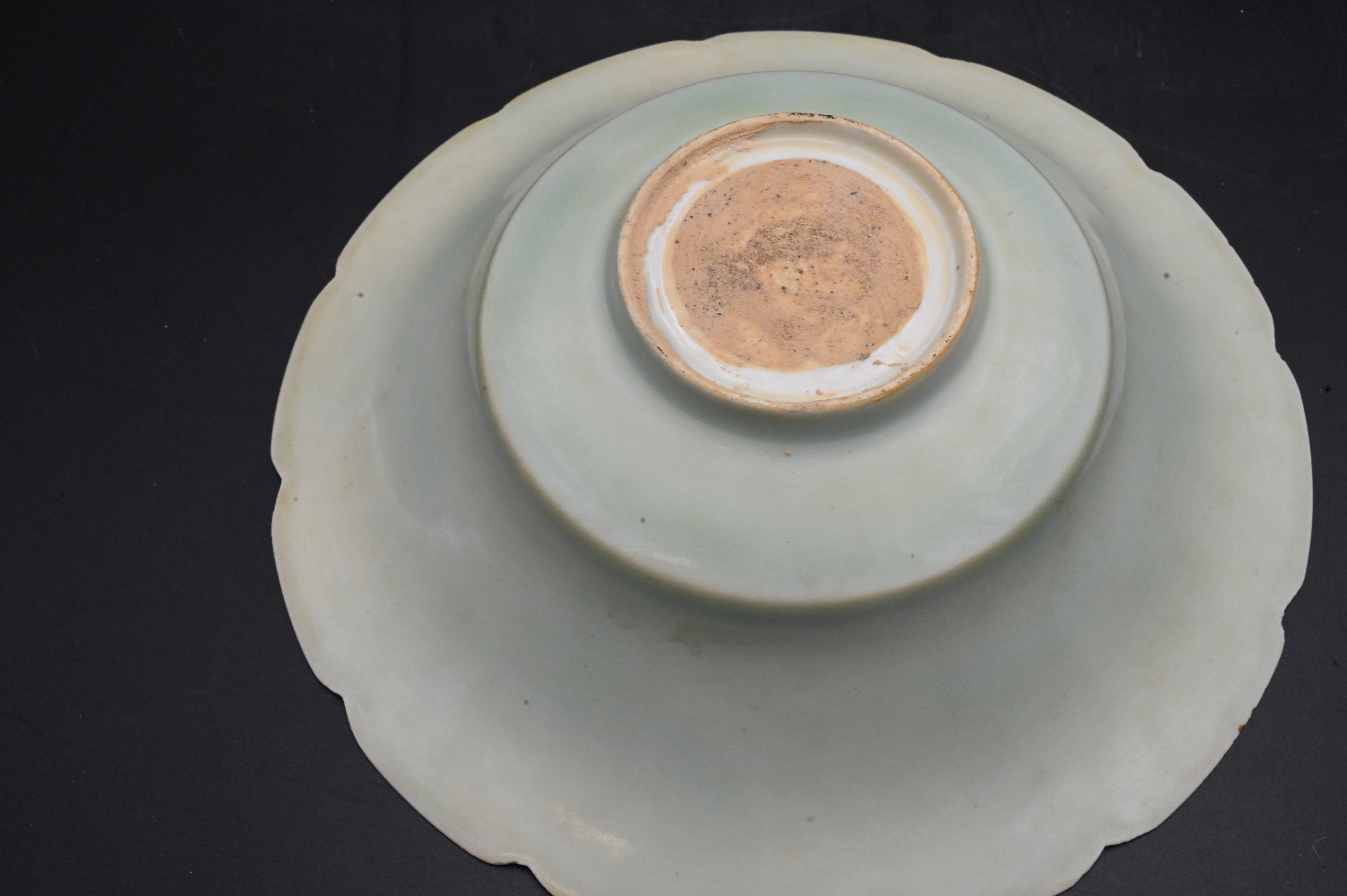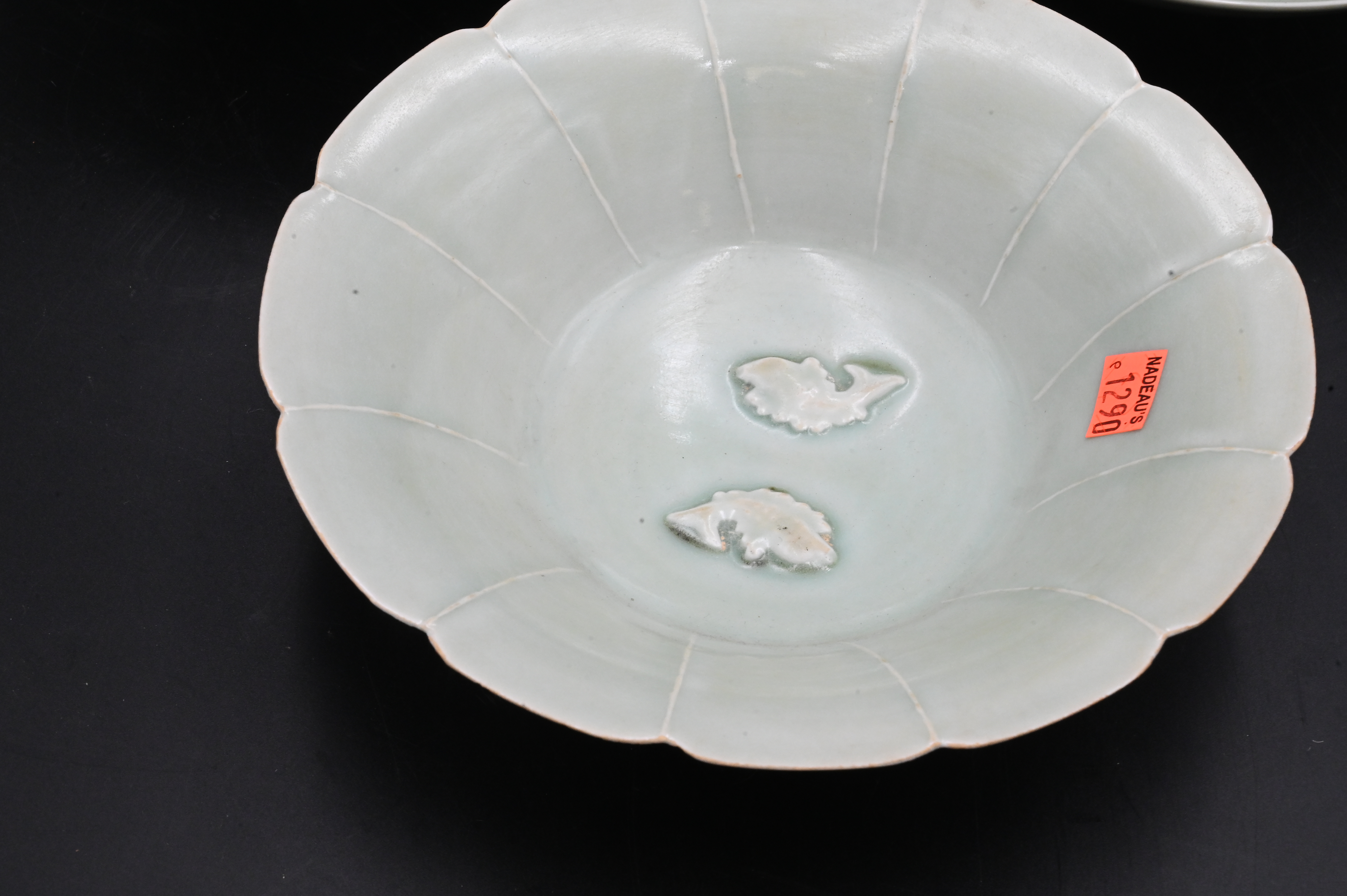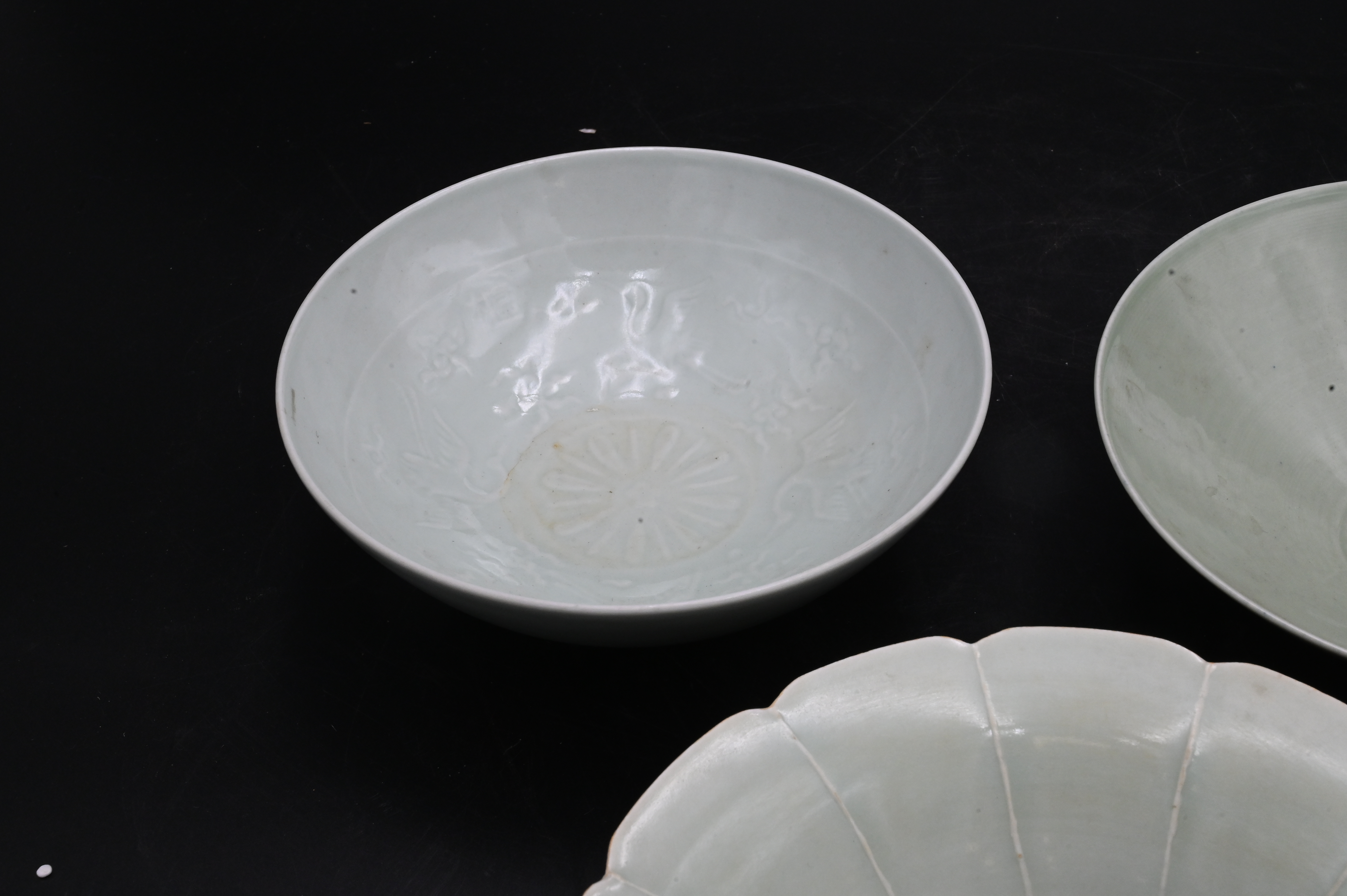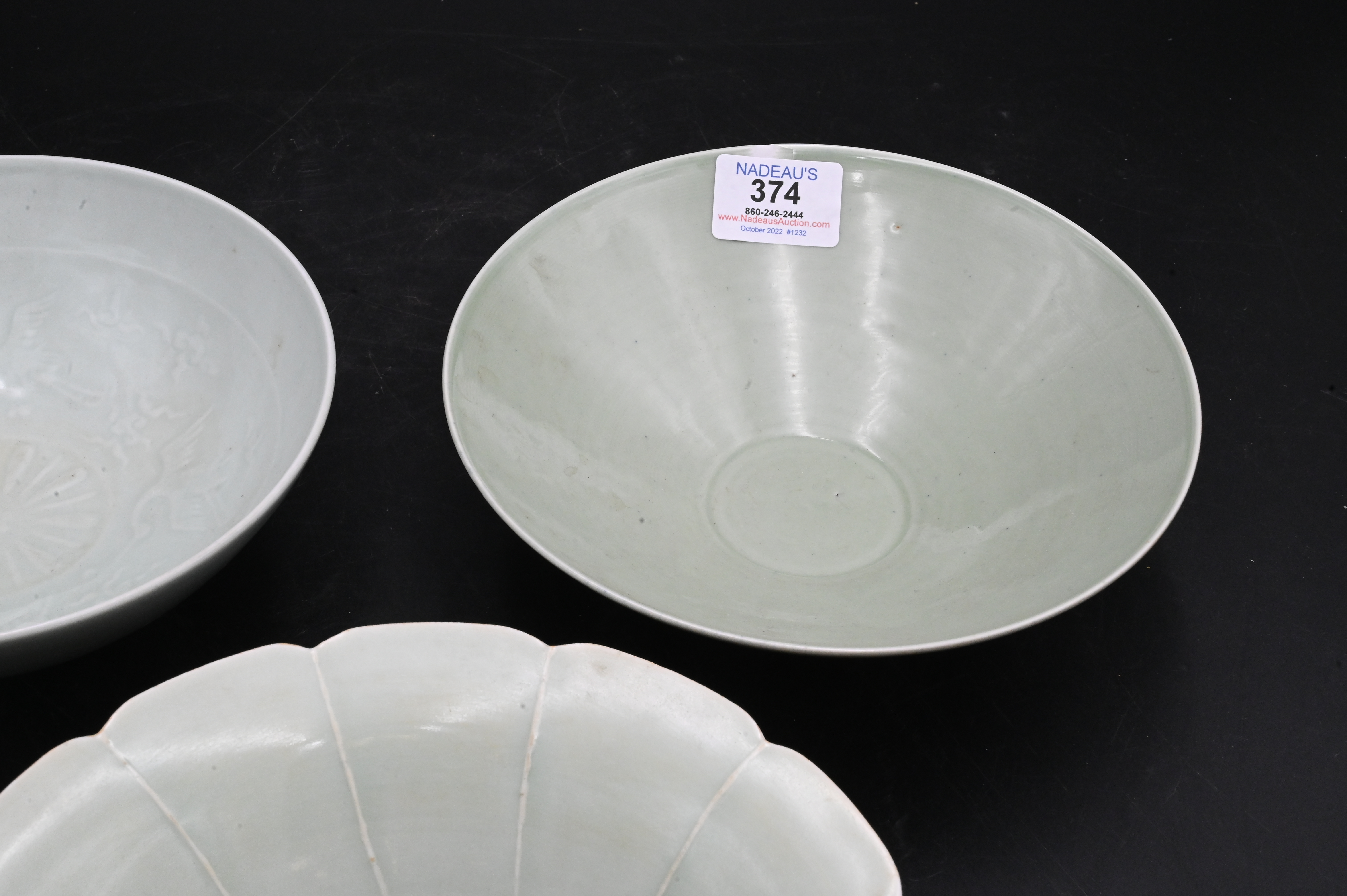 Three Chinese Celedon Bowls, one having birds and characters, largest height 2 3/4 inches, diameter 8 3/4 inches.