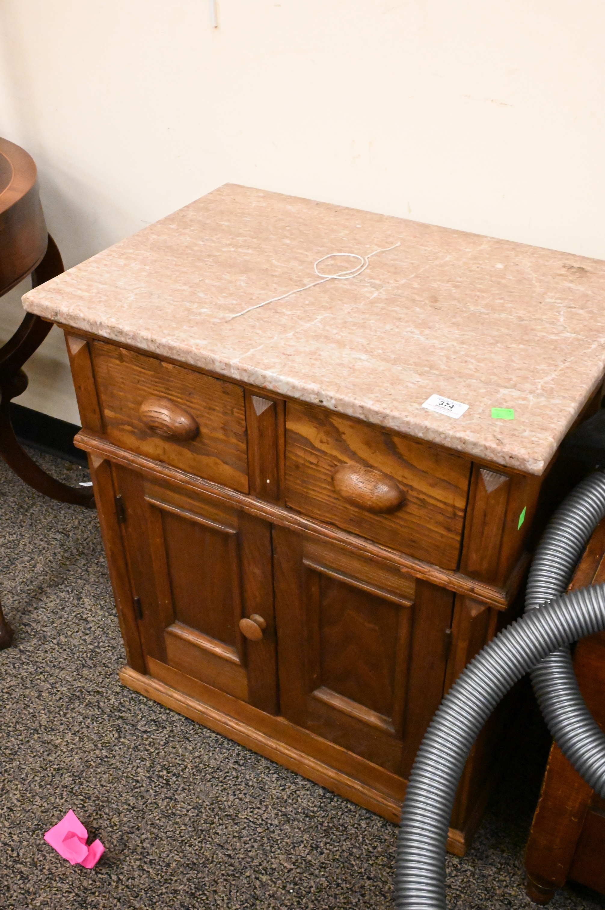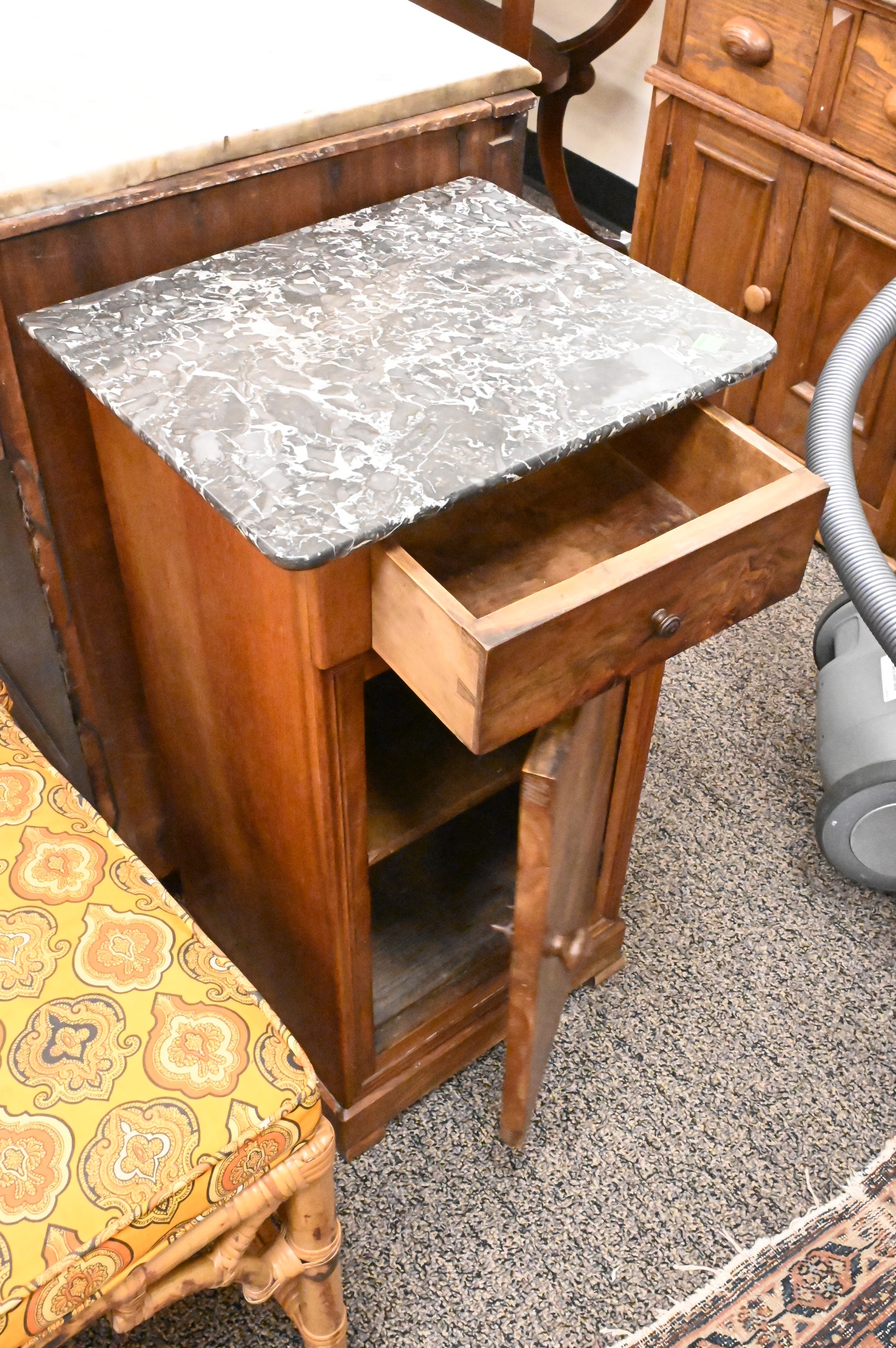 Two Commodes, to include Victorian burlwood half commode, having marble top, along with an oak commode having marble top, with two drawers and two doors, burlwood commode height 29 inches, top 12 3/4″ x 15″