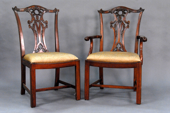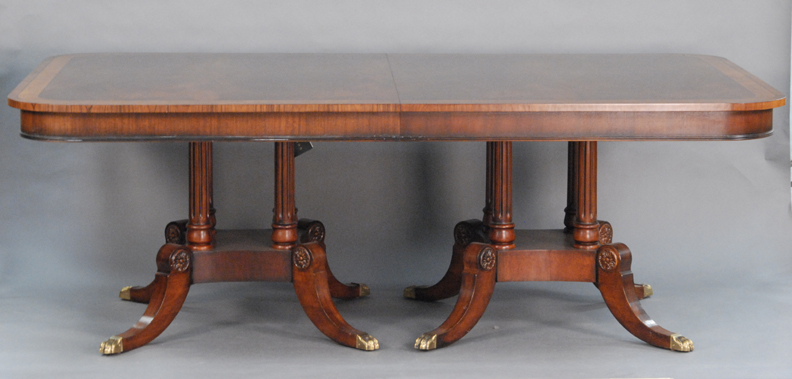 Eleven piece Oxford Classics Henredon dining table and ten Chippendale style chairs with pierce carved backs and banded inlaid double pedestal table, three leaves and custom pads, in new condition.