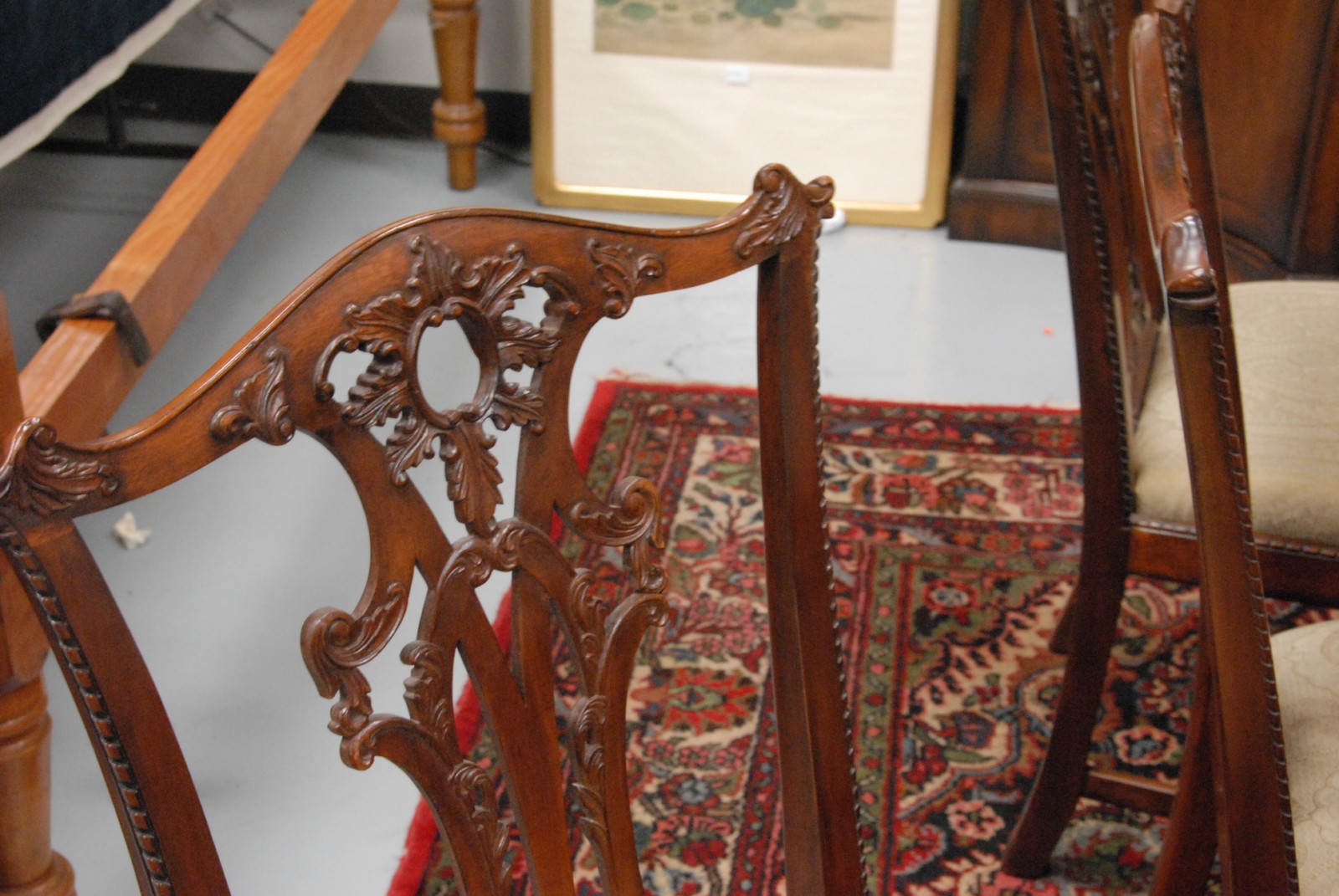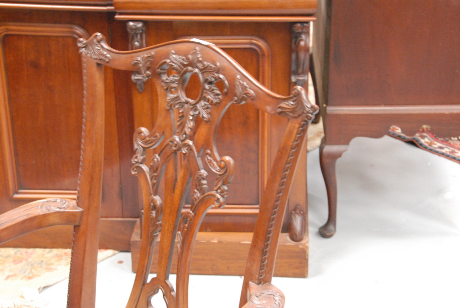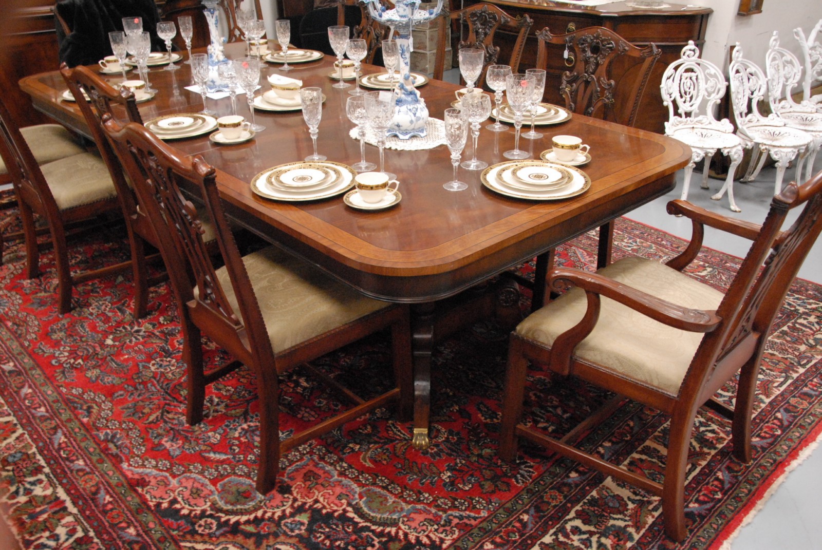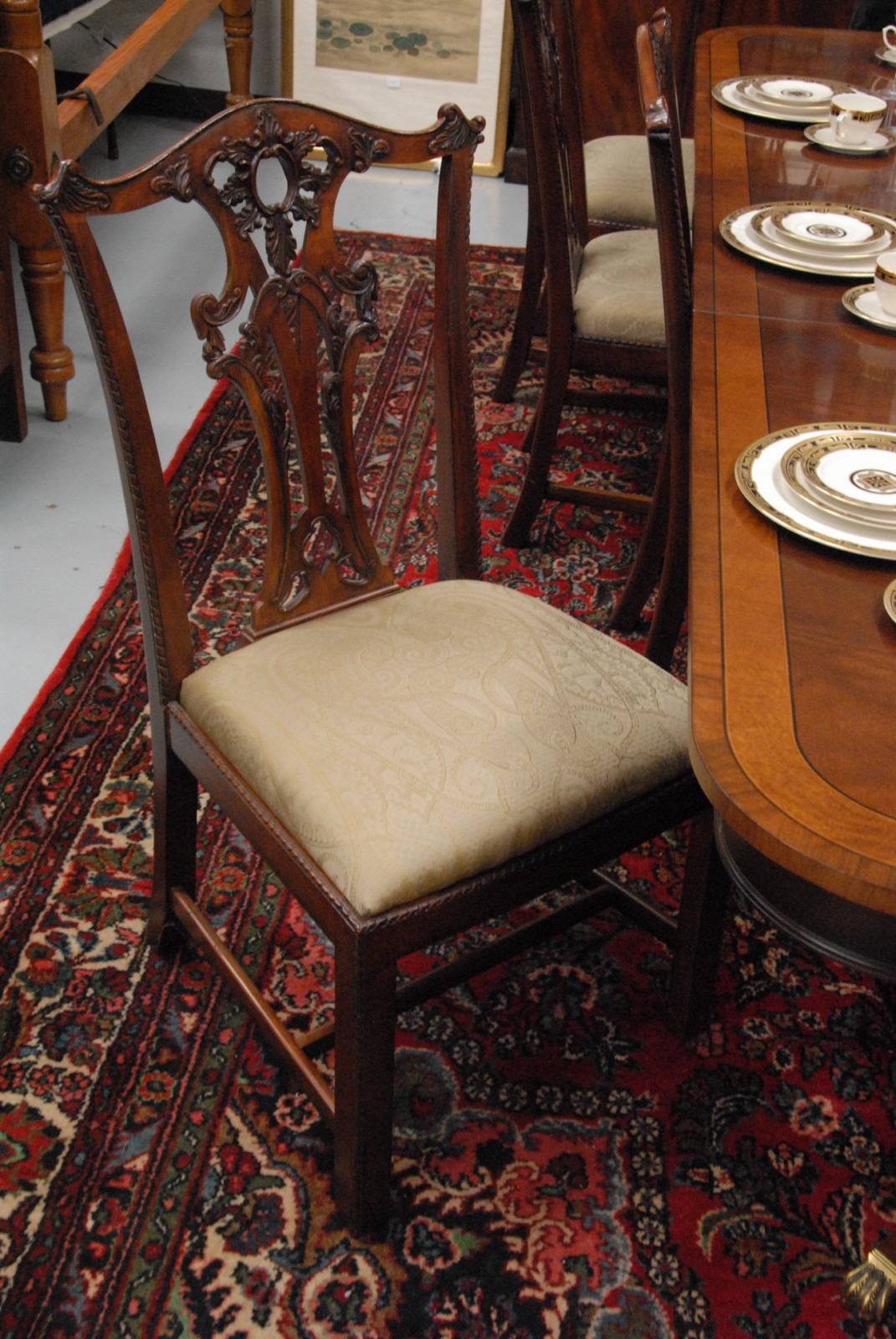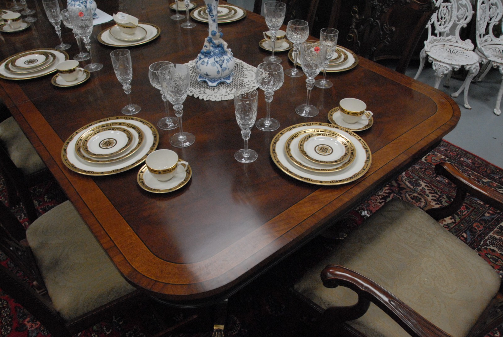 Eleven piece Oxford Classics Henredon dining table and ten Chippendale style chairs with pierce carved backs and banded inlaid double pedestal table, three leaves and custom pads, in new condition.