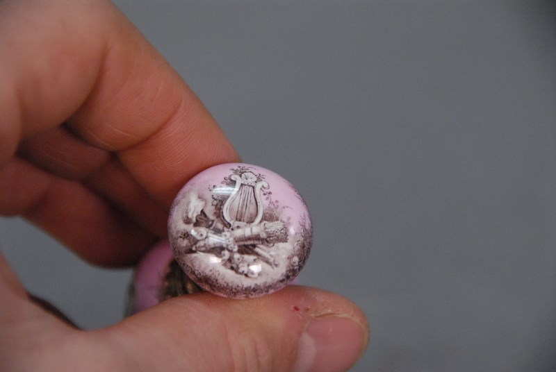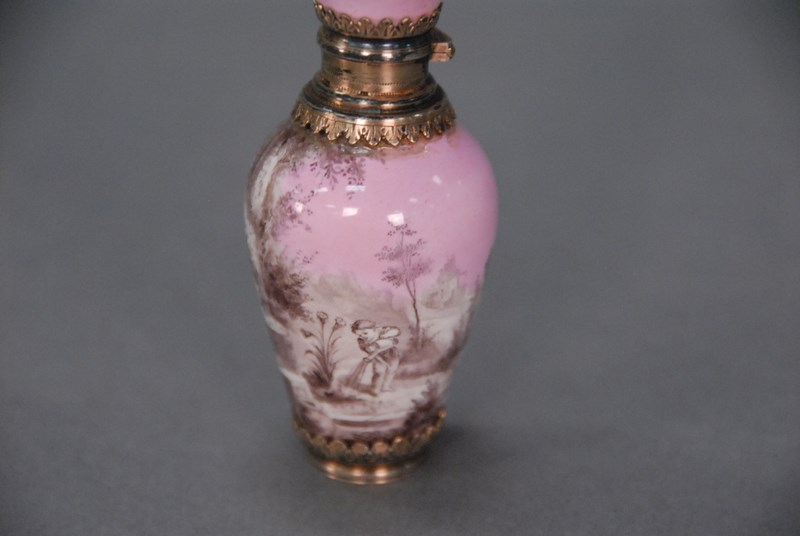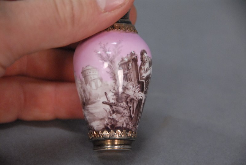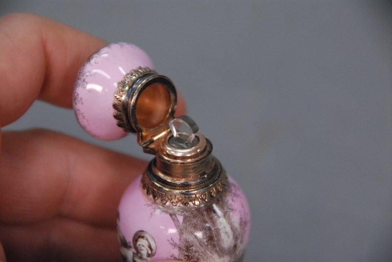 Lot 375: Enameled perfume having hinged top, all with scenic enameling and blind folded woman. ht. 3 1/4in.