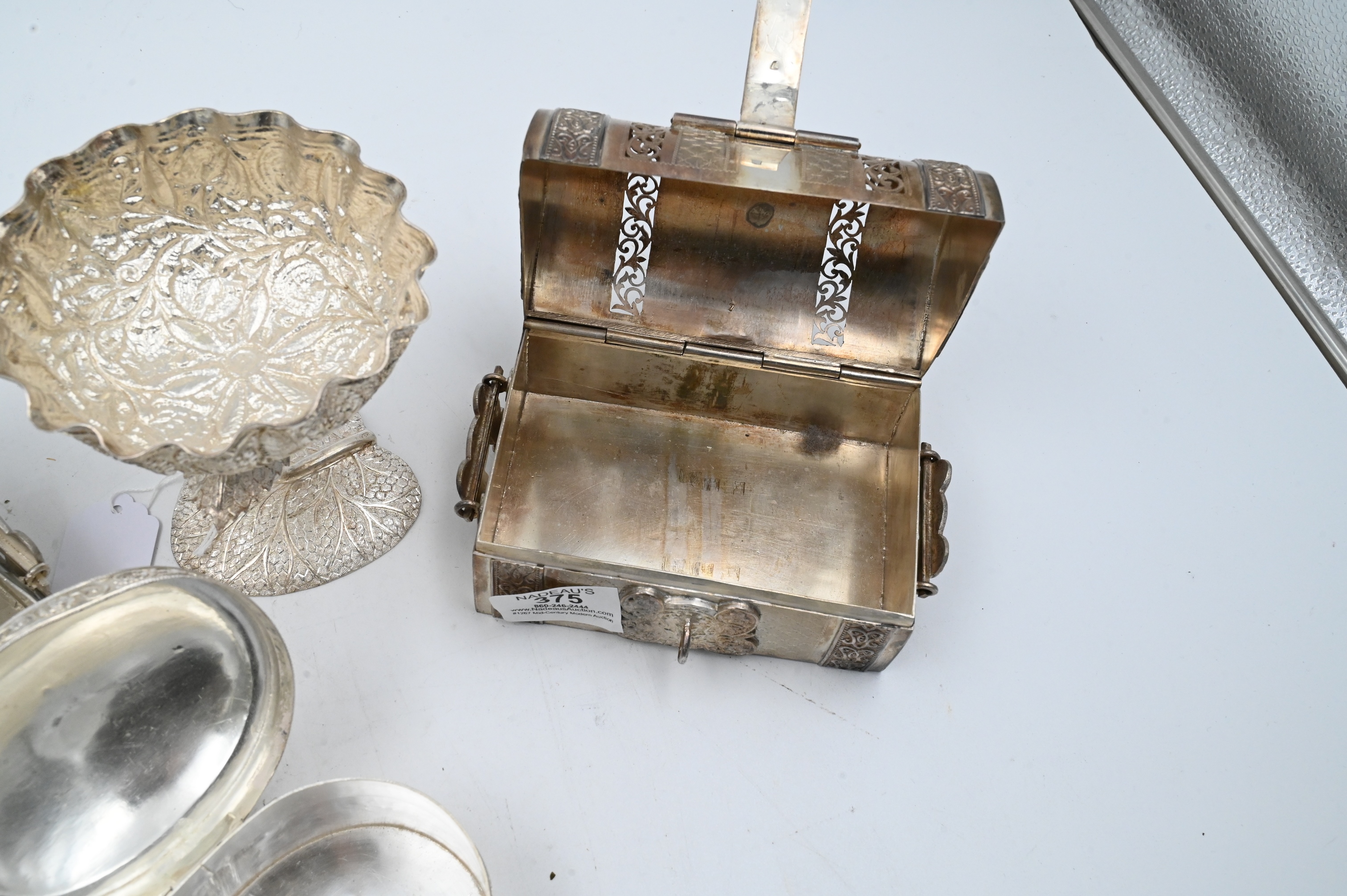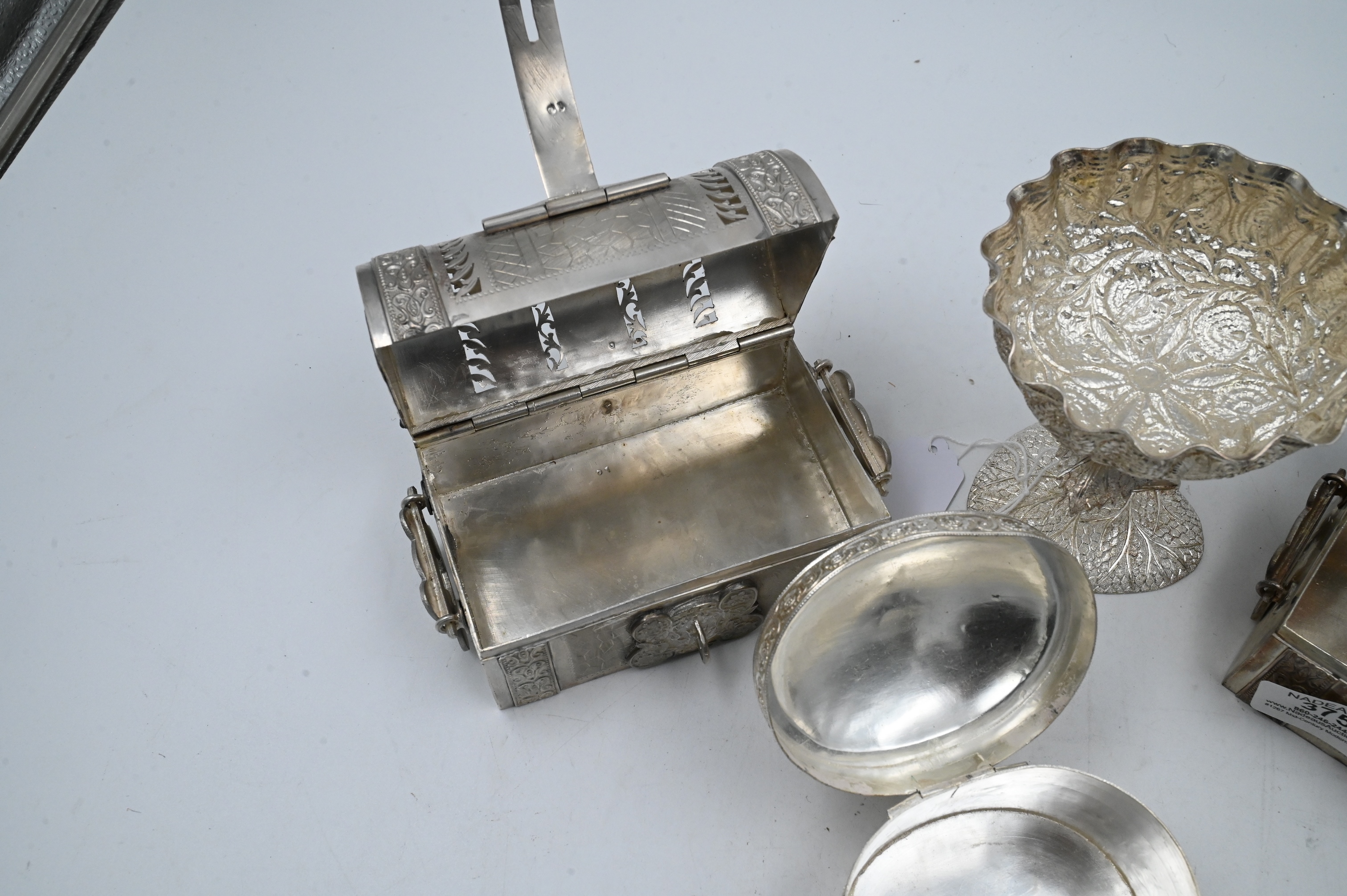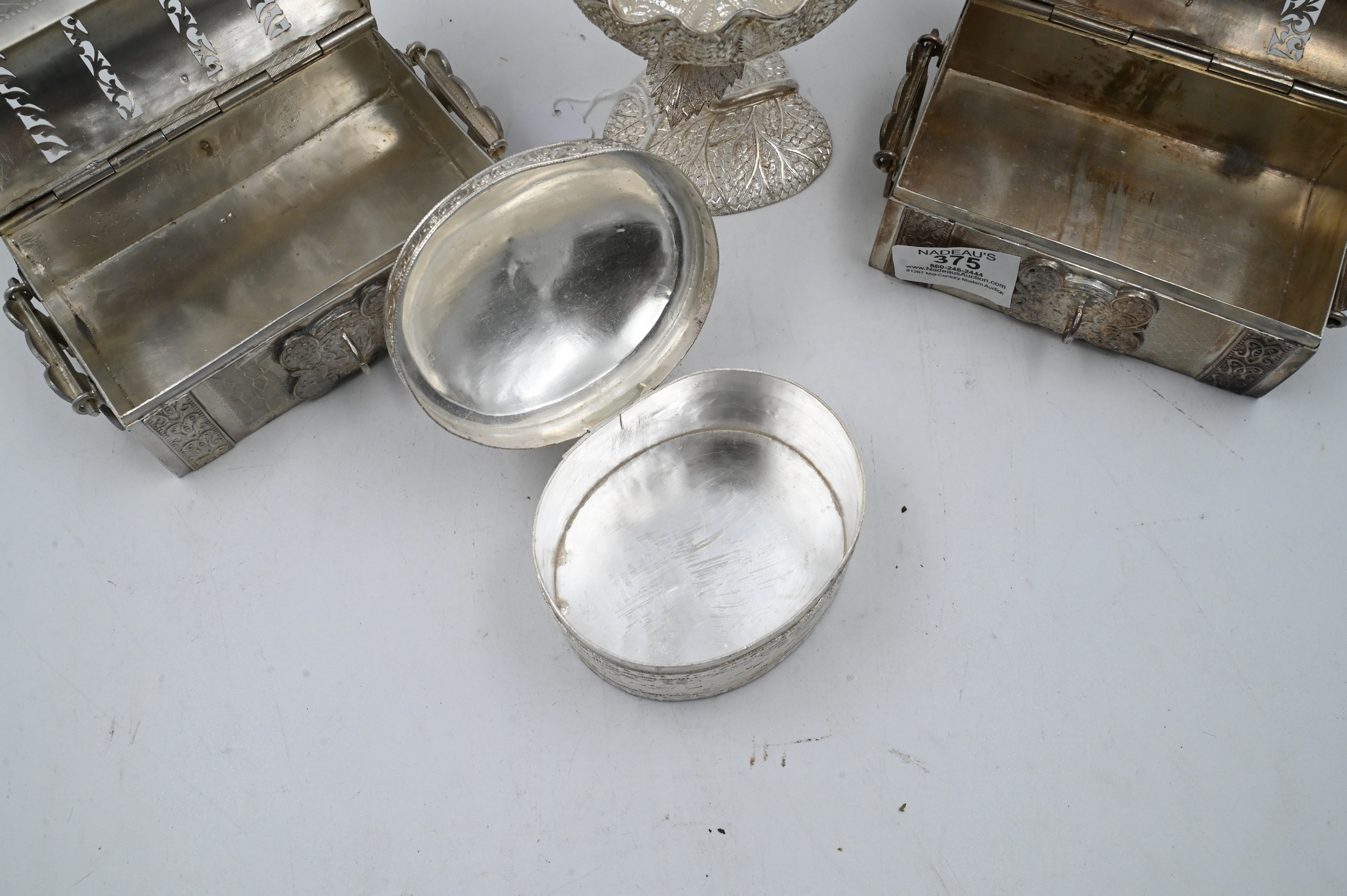 to include two chest, small lidded round box, and leaf/vine form cup marked “silver”