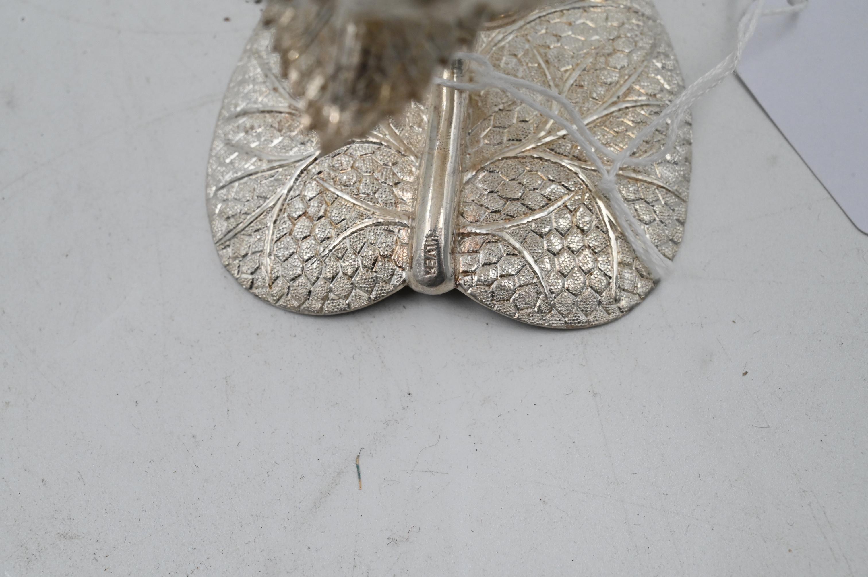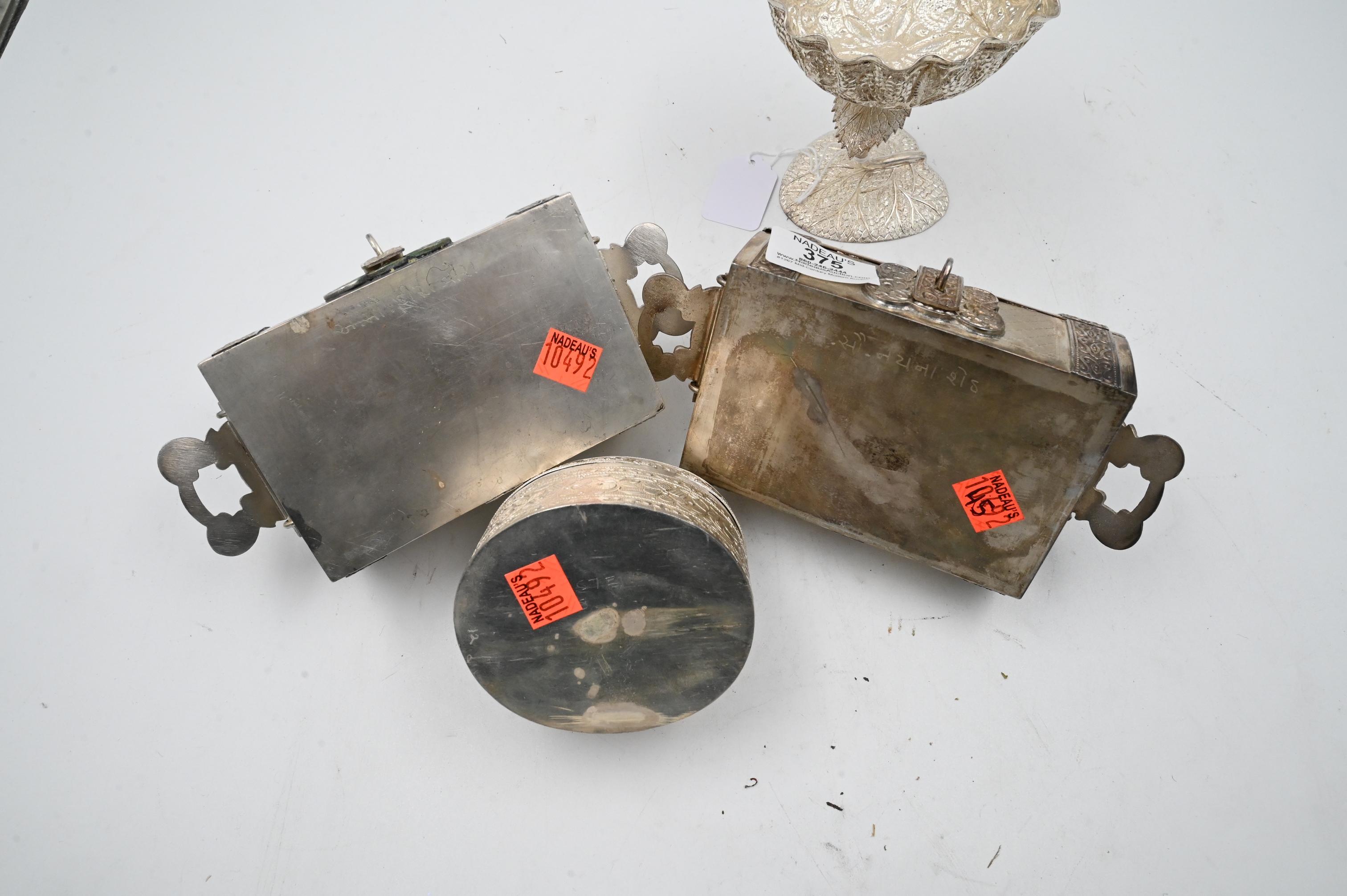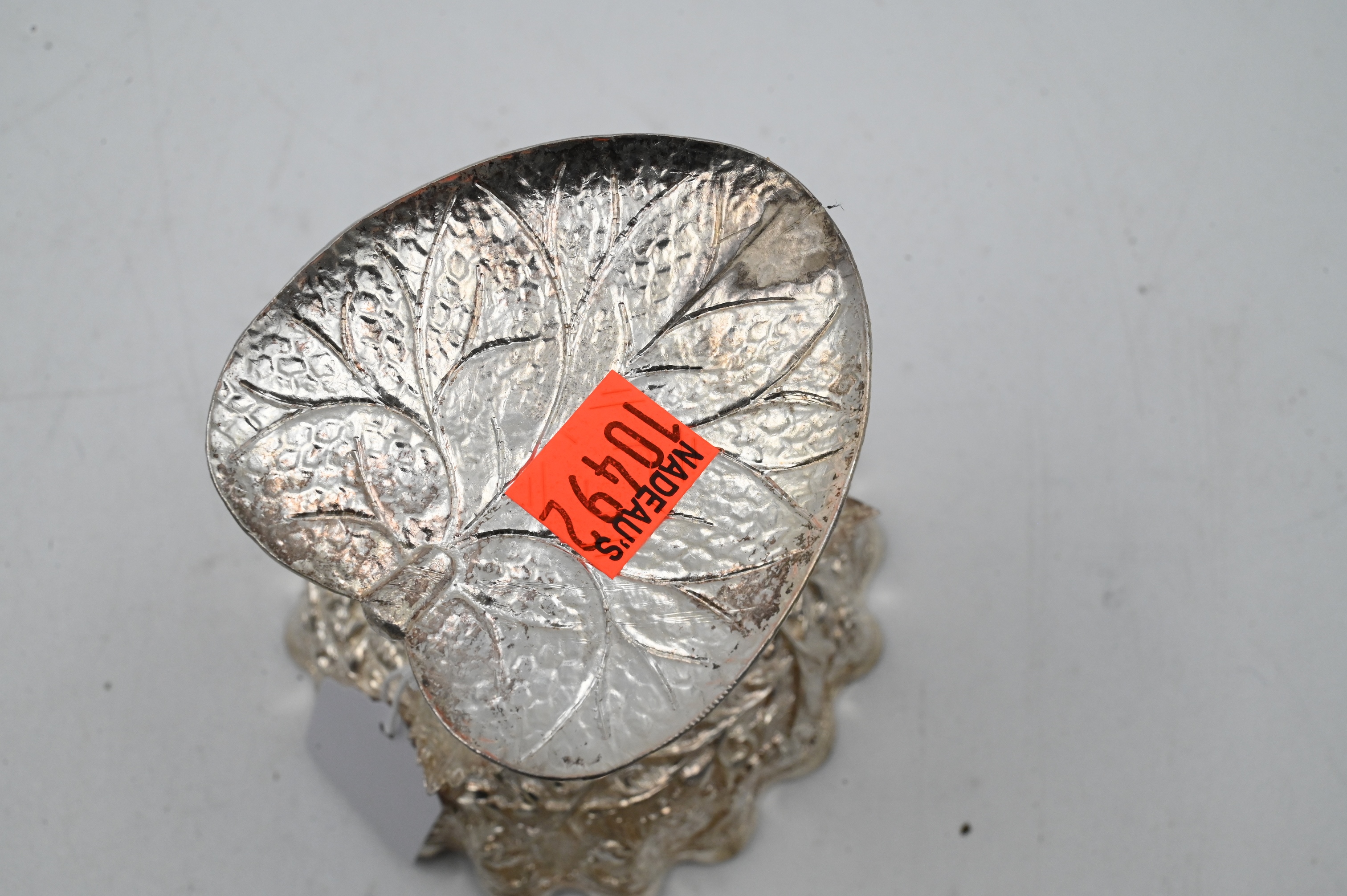 to include two chest, small lidded round box, and leaf/vine form cup marked “silver”