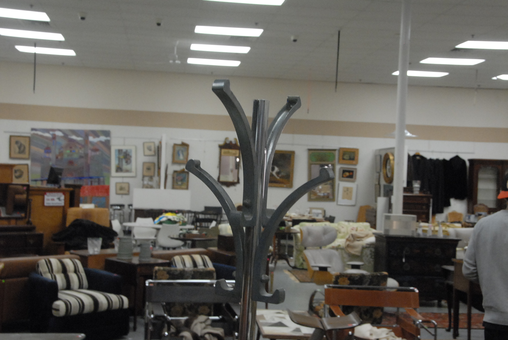 Heavy Art Deco chrome coat rack together with a Nessen style swing arm brass table lamp with a double light socket.