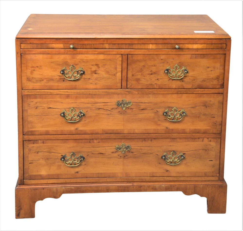 Lot 375: Hekman Burlwood Bachelors Chest, with pull out slide over two short over two long drawers on bracket base, height 29 1/2 inches, top…