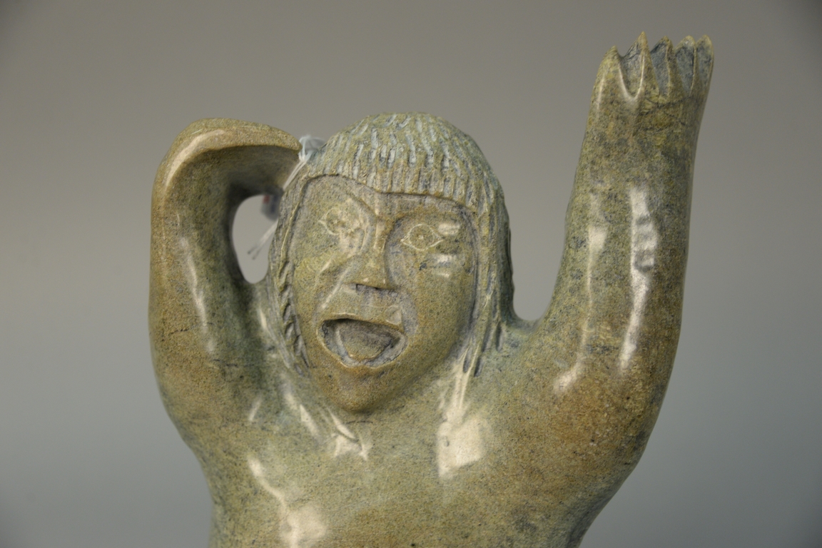 Lot 375: Inuit Eskimo carving Kellypalik Qimirpik 1948 light green soapstone Shaman Dancing 12 x 6 1/2 x 4 1/2, Provenance: Waddington’s.