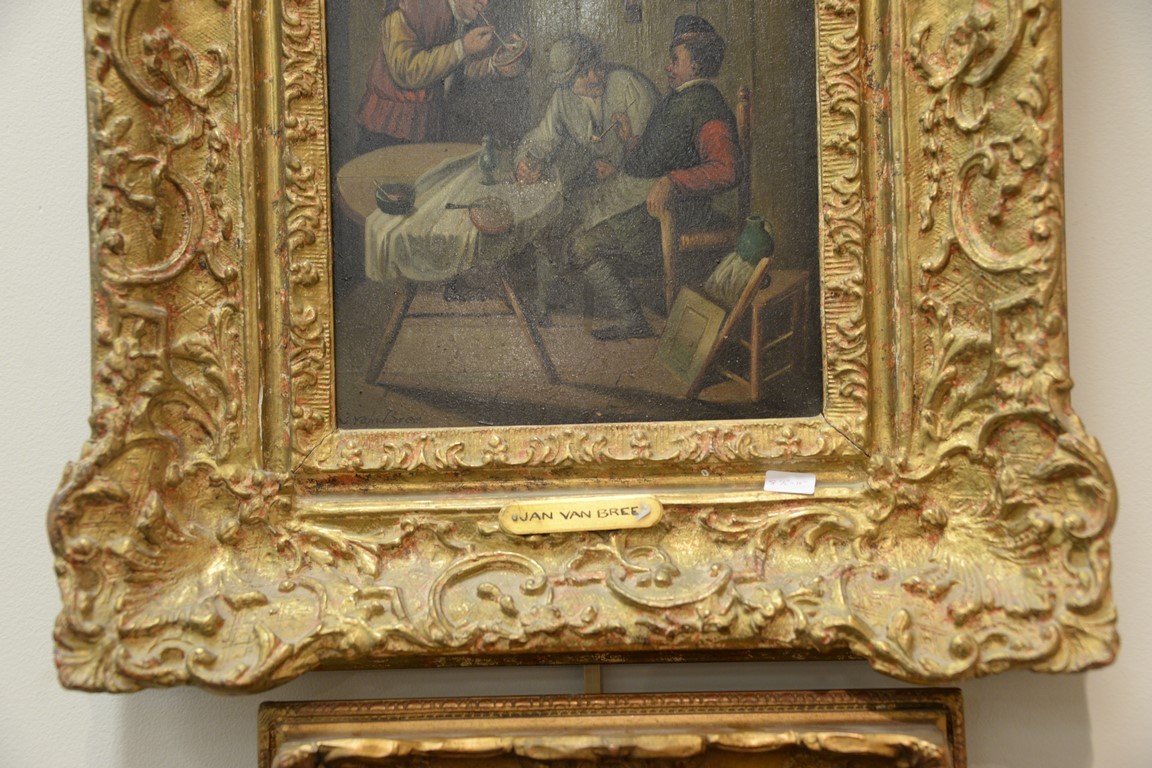 Lot 375: Jan Jacob Croegaert Van Bree, oil on panel, interior scene, Men Smoking Pipes Blowing Rings, signed lower left: J. Van Bree, 8 1/2 …