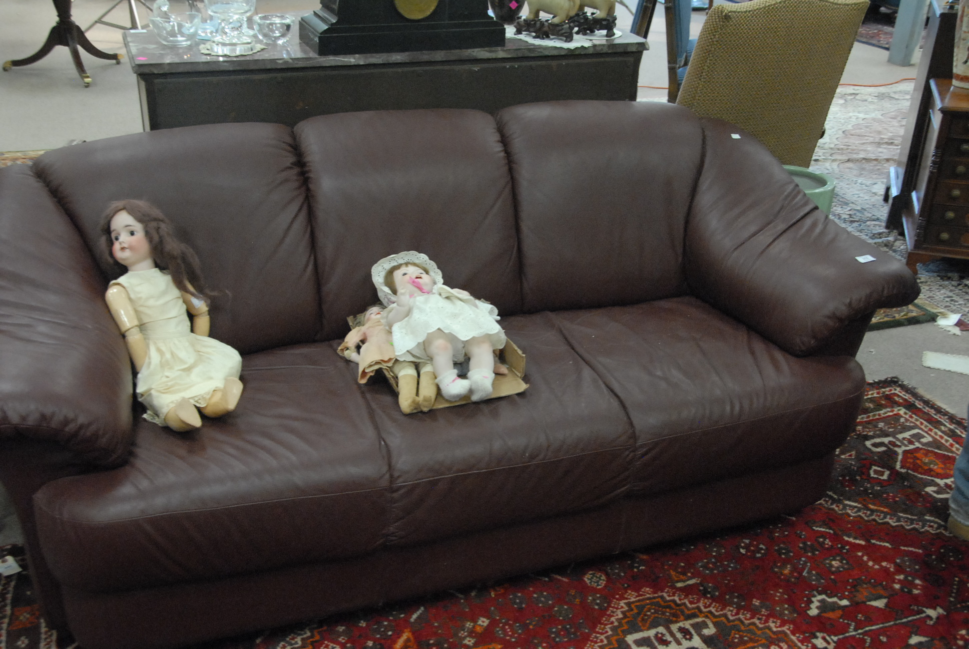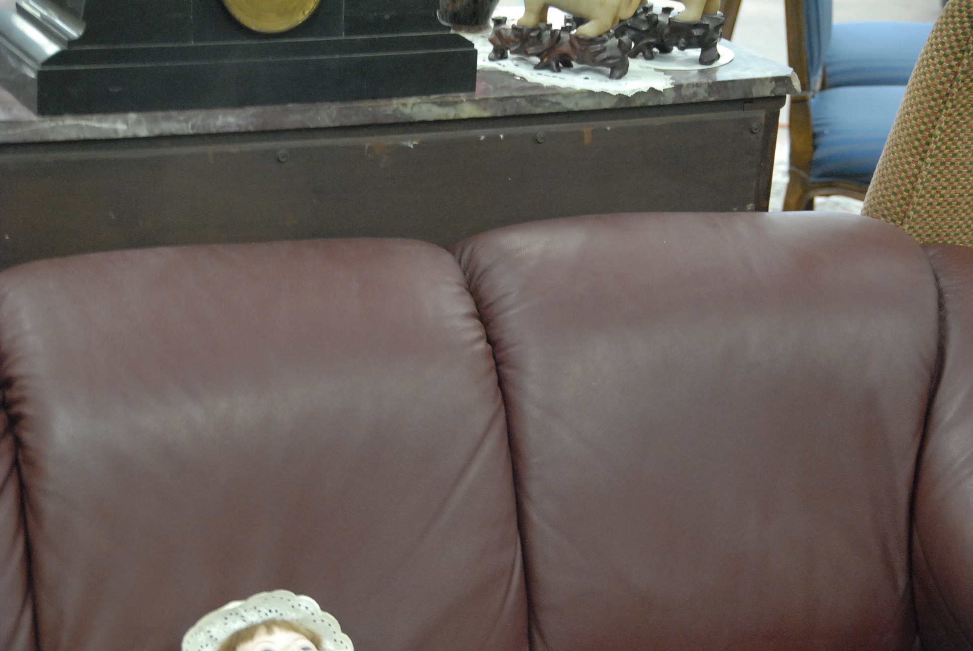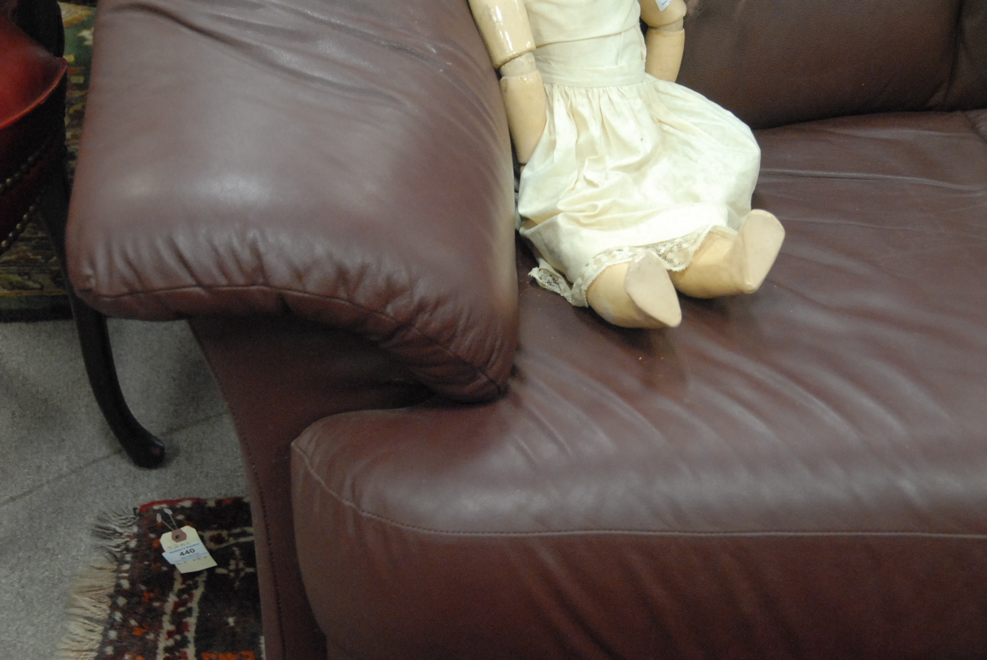 Maroon leather upholstered sofa, lg. 77in.